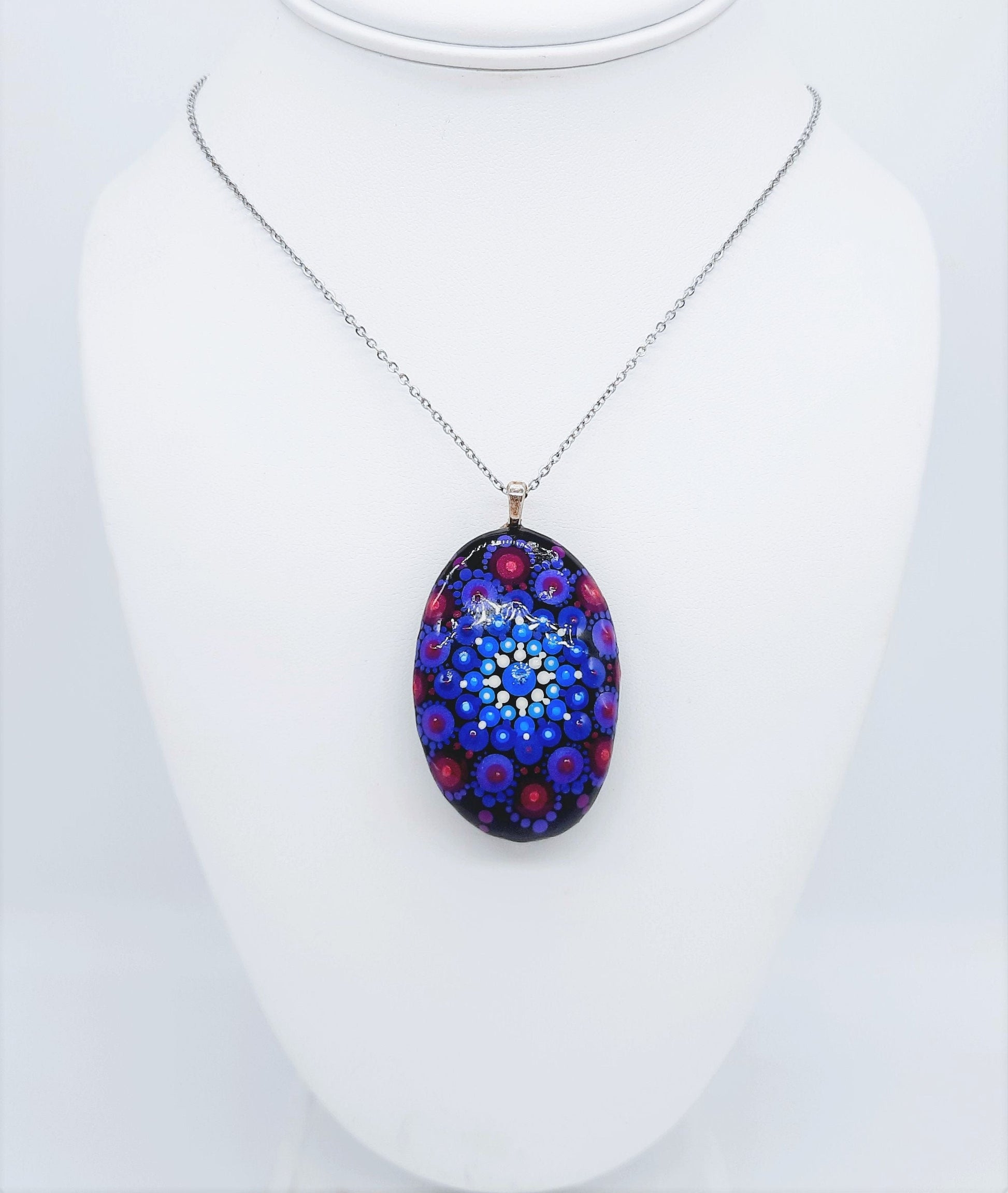 Hand-painted, one of a kind, approximately the size of a fifty cent piece, sealed with resin, comes with a hypoallergenic stainless steel 18" chain with lobster claw closure.