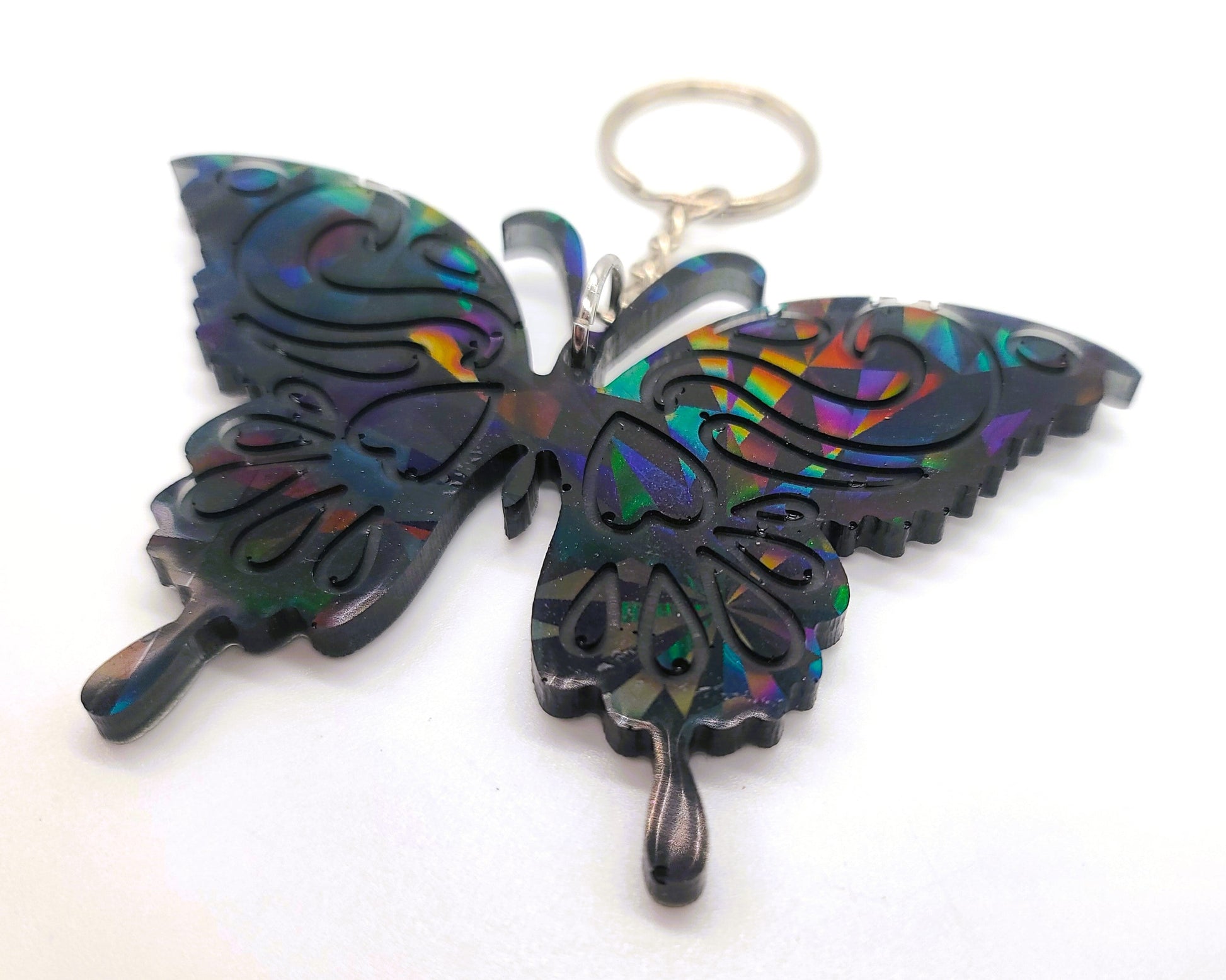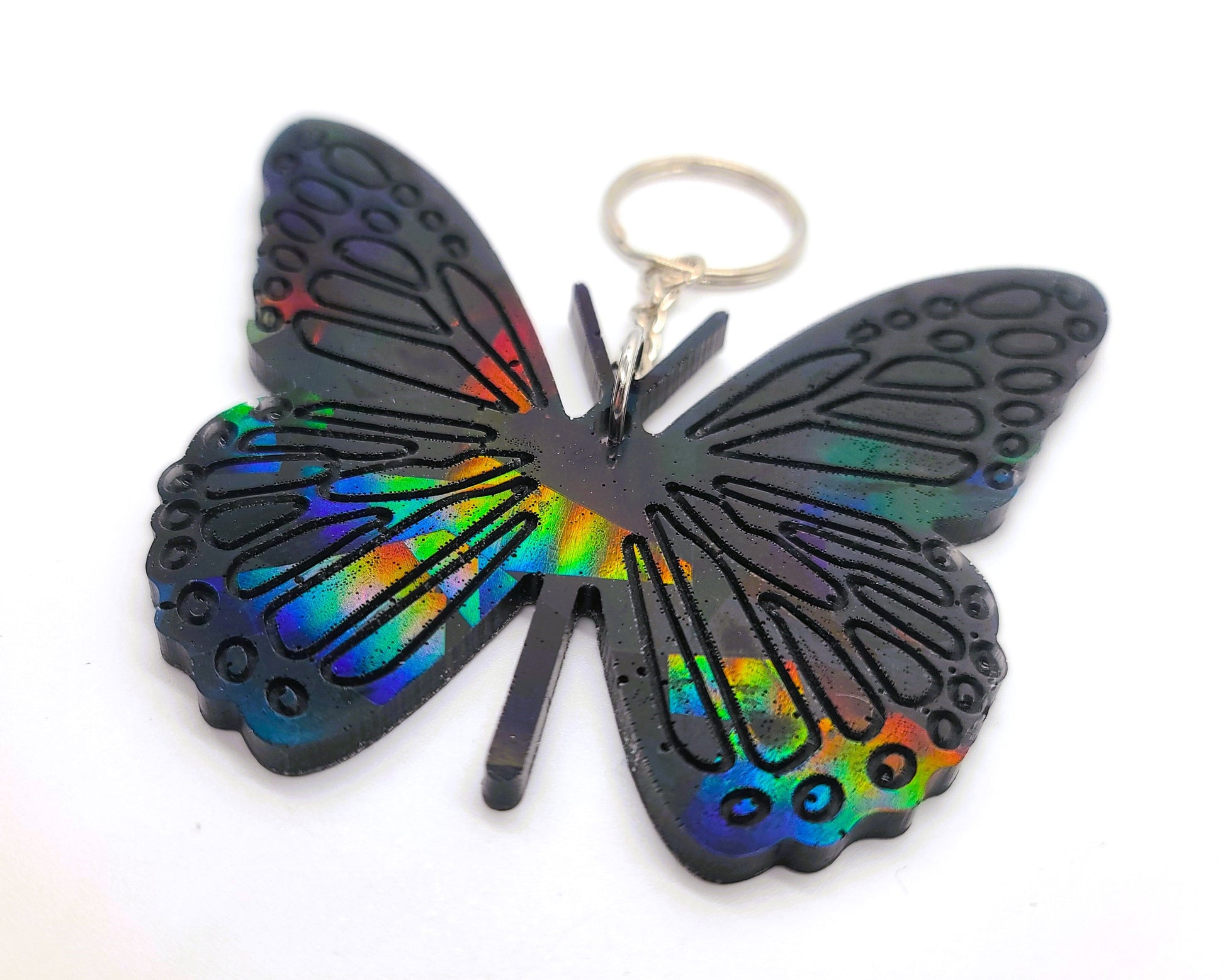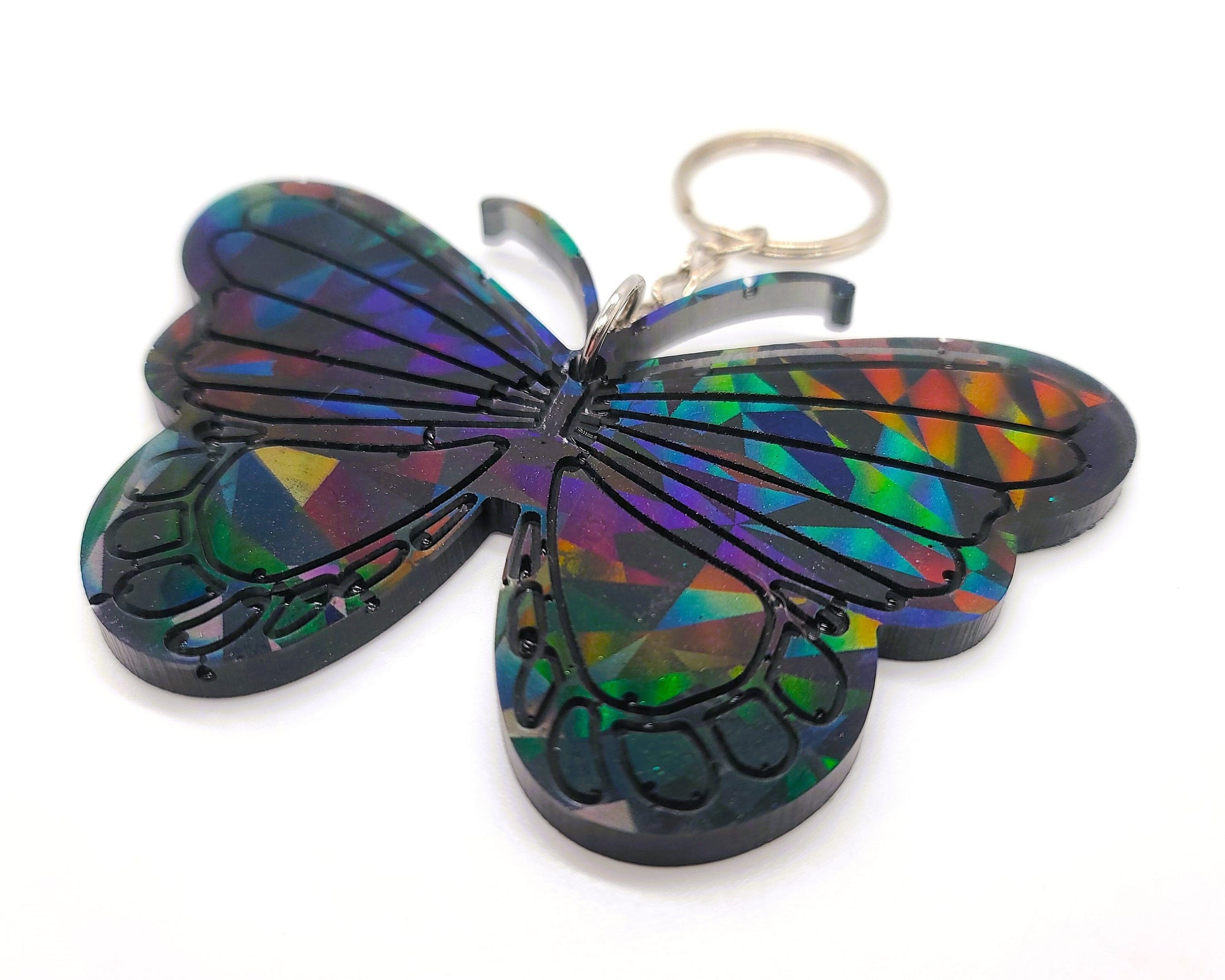 Made with color-shift holographic mica powder. The front side of the key chain is holographic as well.