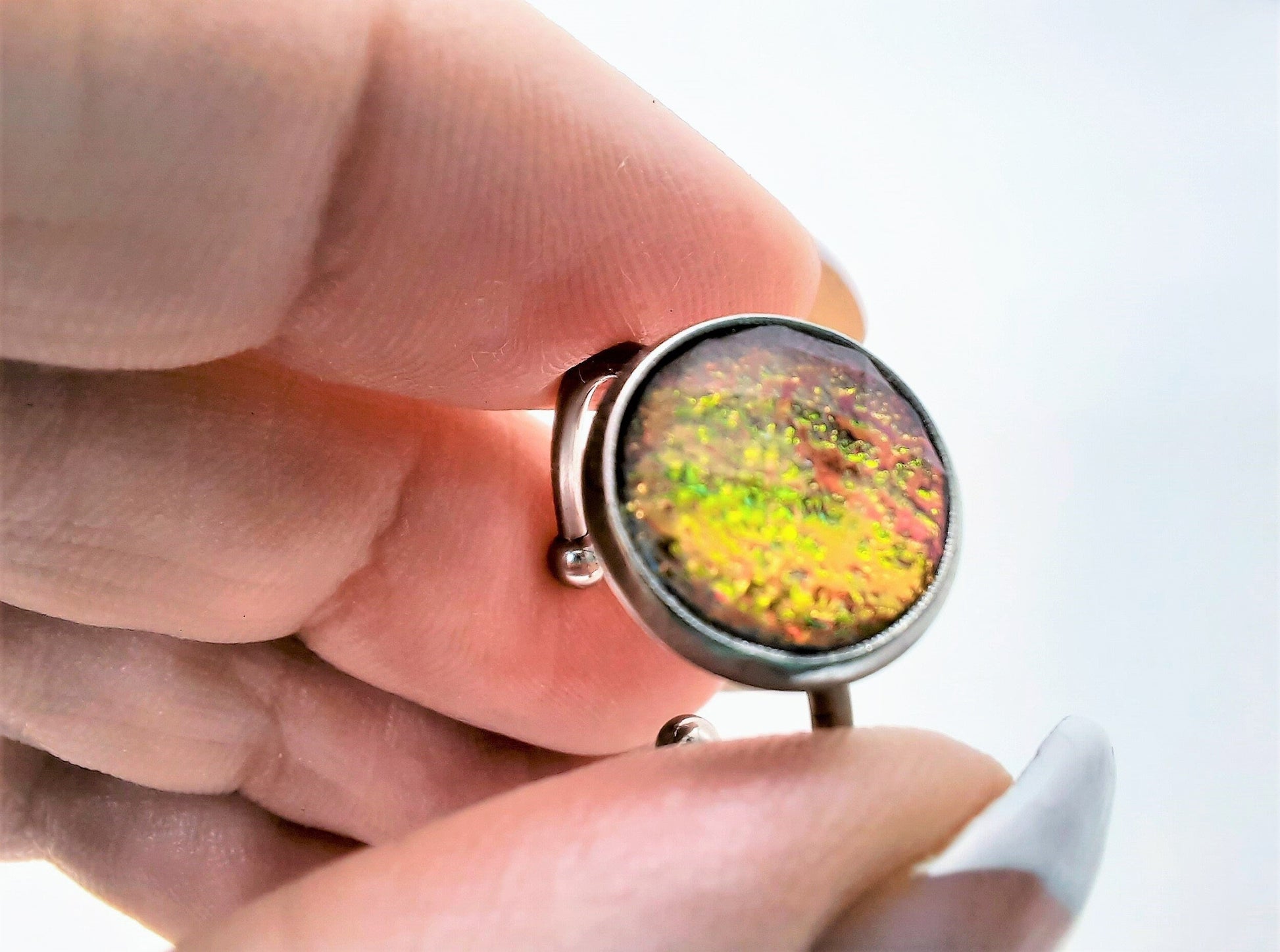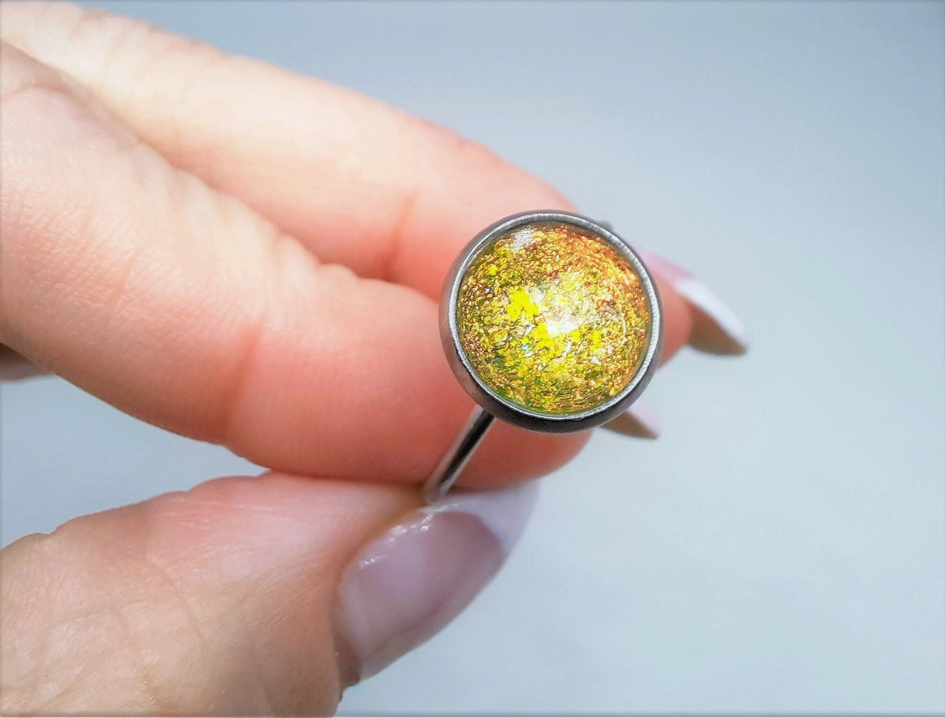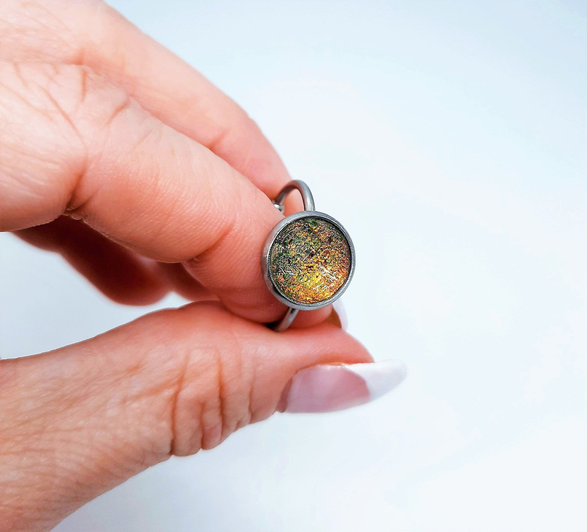 Handcrafted / Handmade Iridescent Green / Copper Reflective Rhinestone Ring, Hypoallergenic Silver Stainless Steel, Size 7 Finger Cuff.