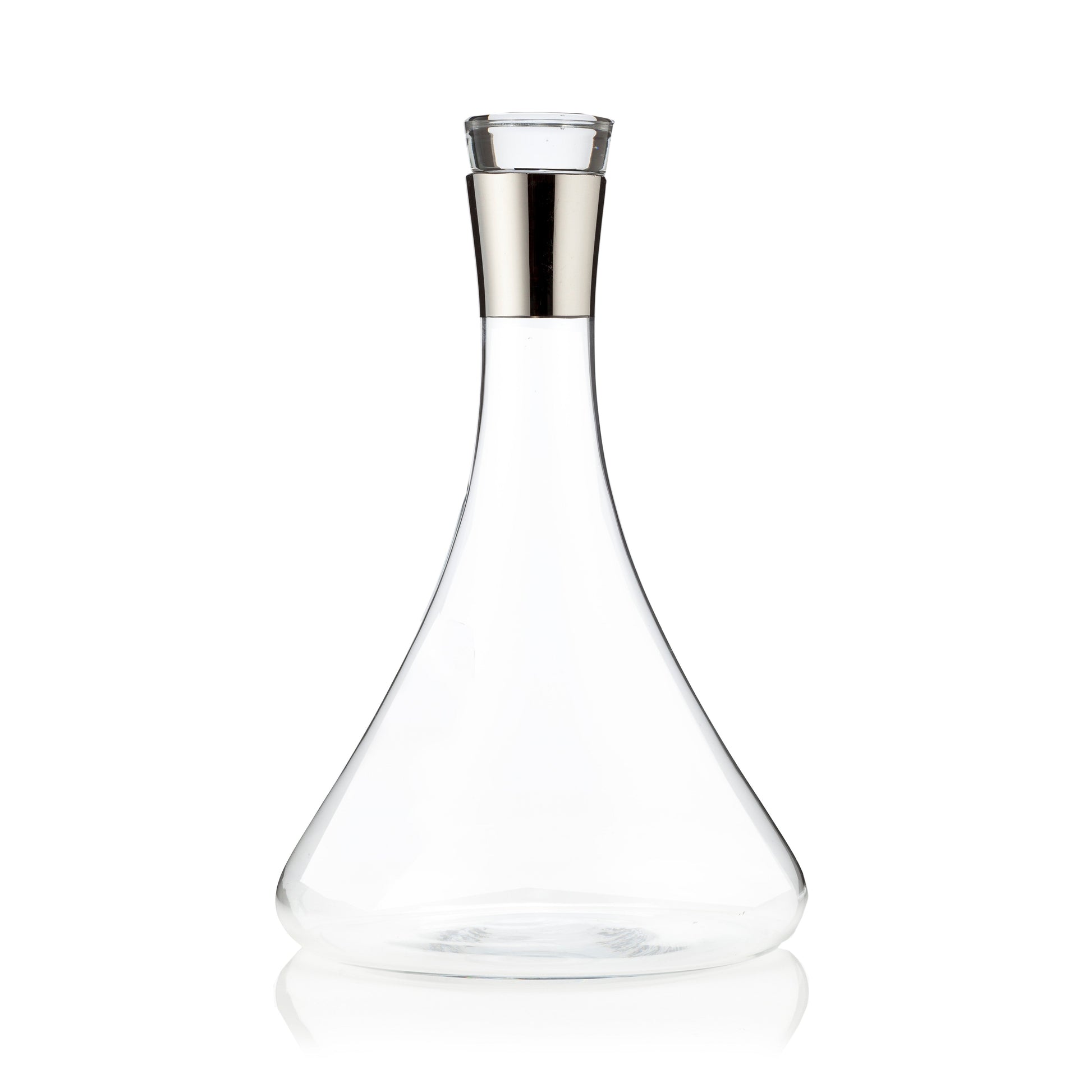 Add a sleek chrome band to an already streamlined decanter and play mixologist from your home bar cart, or sommelier in your dining room. The pyramidal bottle holds 60 ounces of fine wine or liquor and allows a precise, clean pour into every glass.