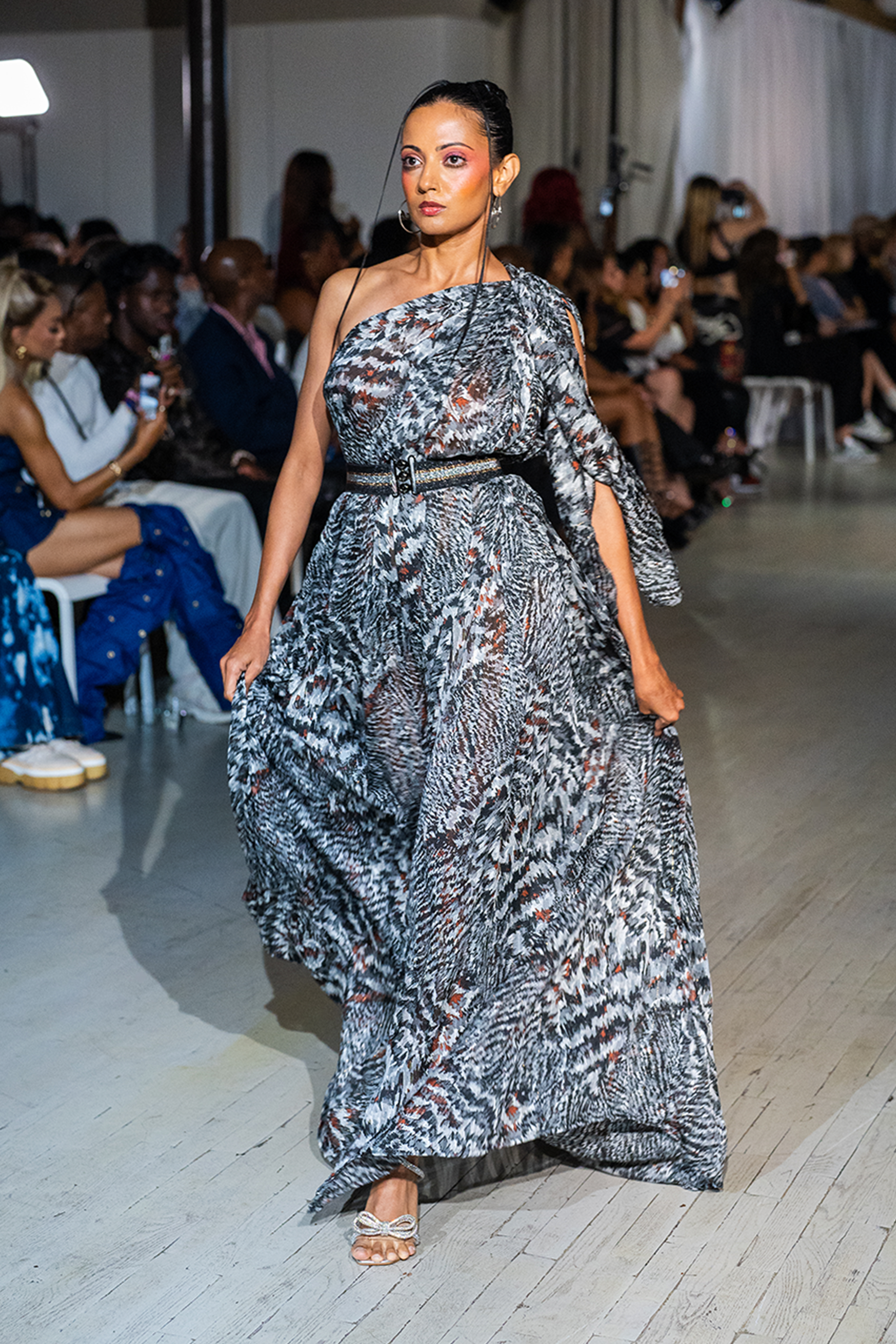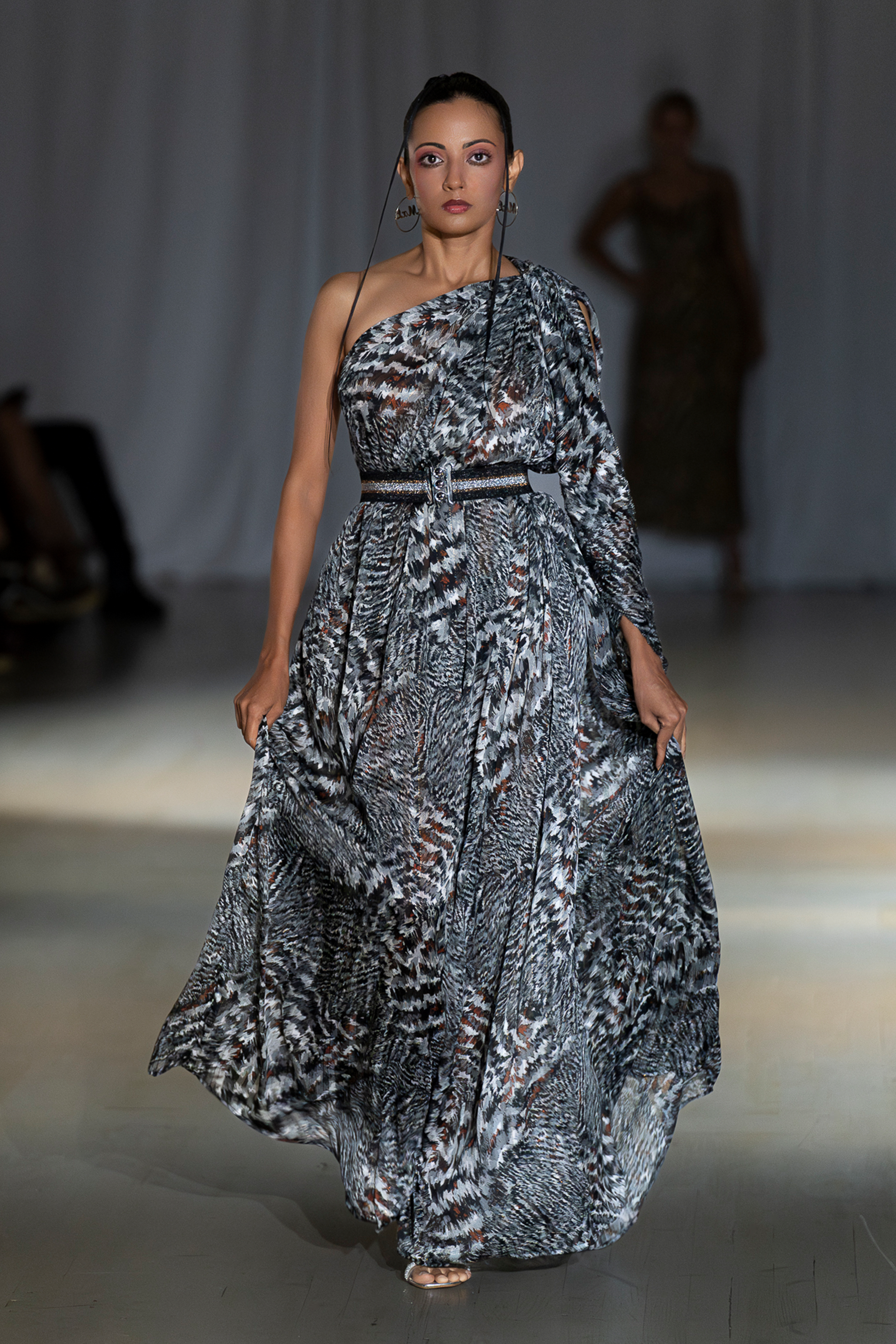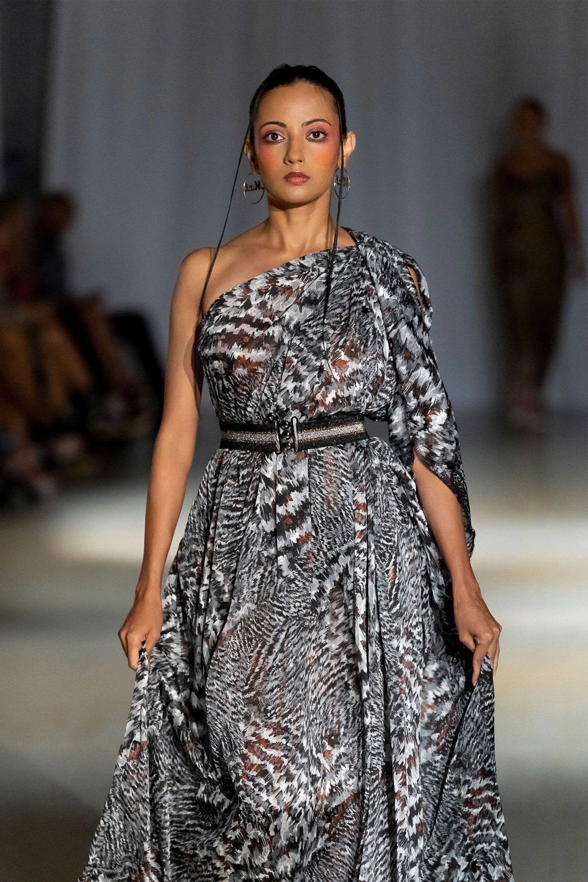 Crafted from flowing silky chiffon, this gown features an asymmetric silhouette with a draped single sleeve, creating a striking contrast between fluidity and form. The cinched waist, accentuated by a textured belt, defines the silhouette, while the full-length skirt billows with every step, capturing the essence of effortless drama. The monochromatic feather-print motif, woven with hints of ember red and deep charcoal, evokes the mystique of nature in motion.