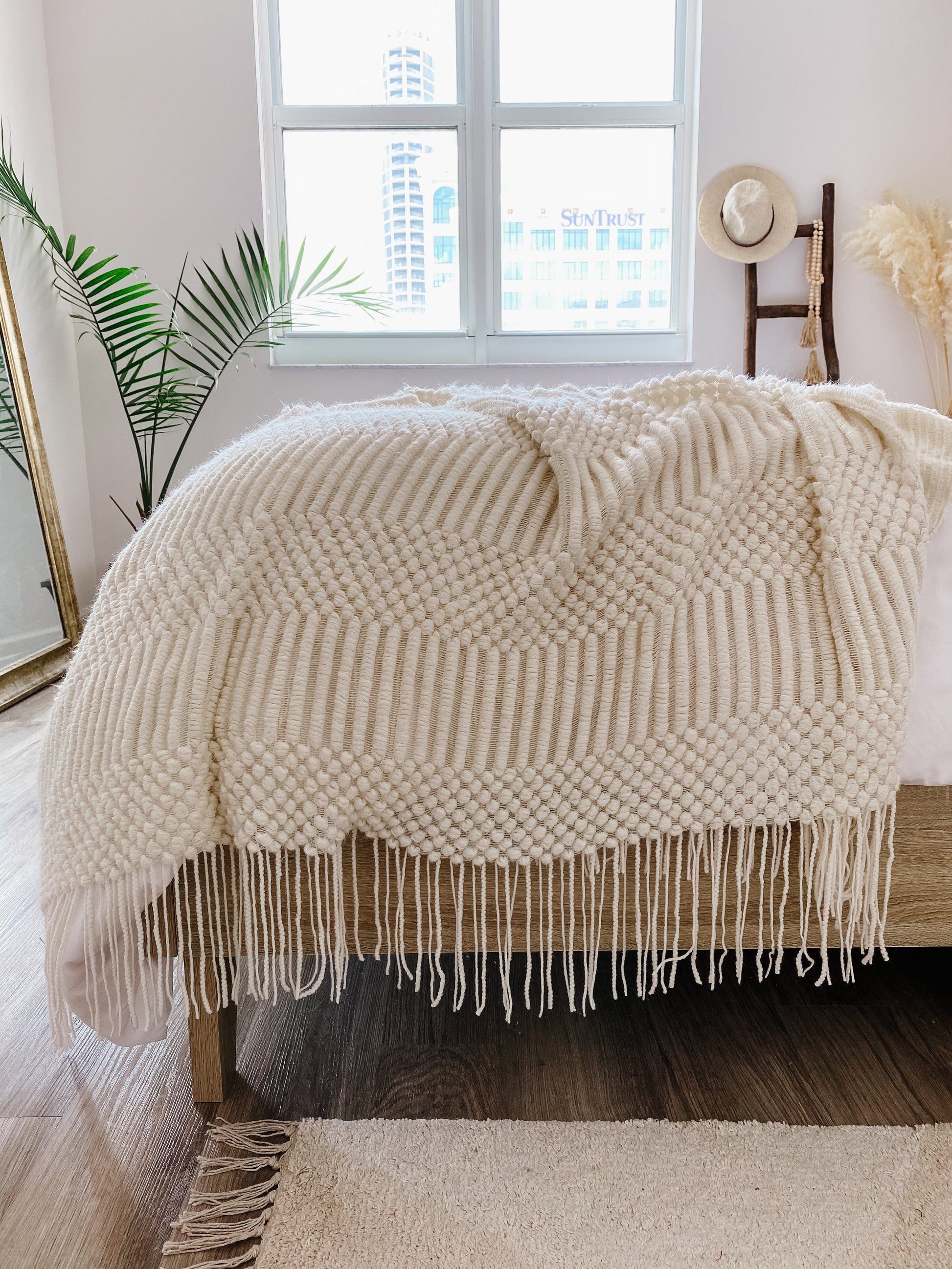 A perfect addition to any living space, this cozy cream throw blanket is the ideal way to add a touch of sophistication to your home.