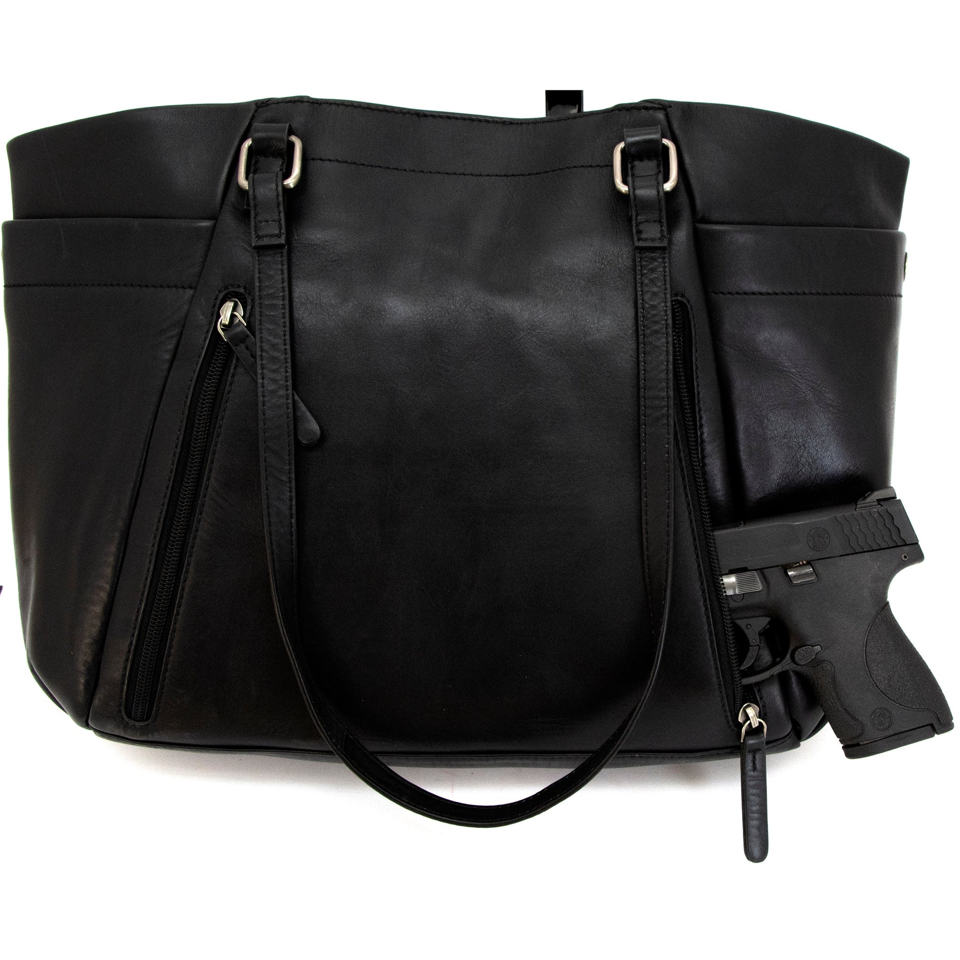 Kira, from our new Maia VT Leather Series, is a weekender style tote bag with an open top and a snap tab closure. Its large main compartment contains two open phone pockets on one side and a half-sized zipper pocket on the other. On either side of the bag are low profile pockets with snap closures deep enough to securely hold a water bottle or closed top travel cup. This stylish tote features two different length sets of parallel handles, making it perfect for carrying as a handbag or shoulder bag. Kira has an outer, individual CCW compartment with ambidextrous rear access with zipper closures. The CCW compartment is padded, with velcro lining on one side, and comes equipped with a matching holster with velcro on either side to allow you to personalize the placement within the pocket for maximum comfort and confidence while carrying.