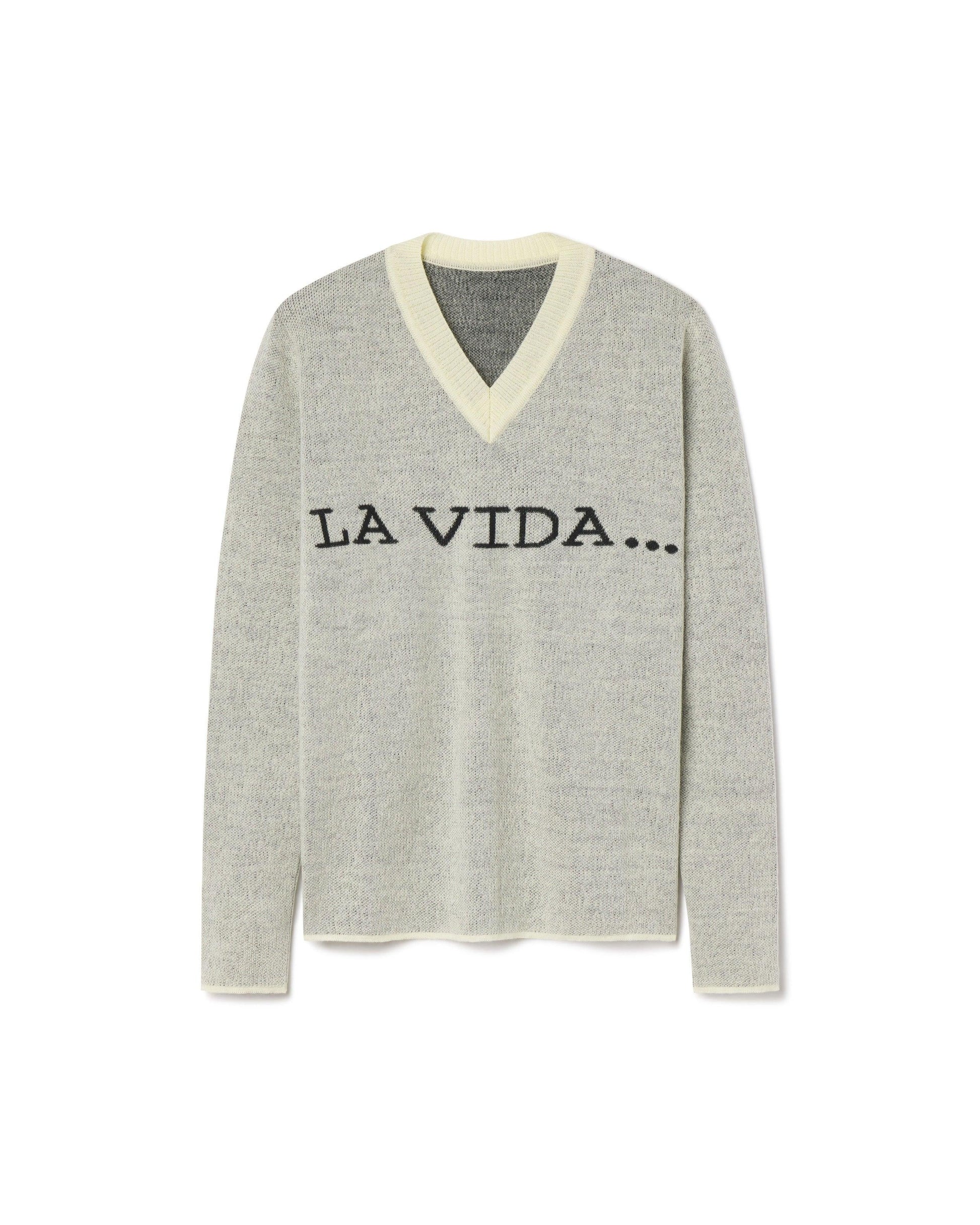 The La Vida Knit Top draws inspiration from Carlos Luna’s artwork and belief systems, focusing on the duality of life and death. Represented by “LA VIDA” (Spanish for Life) on the chest and “LA MUERTE” (Spanish for Death) on the back, the design reflects Luna’s belief that life and death are two parts of the same cycle. The inversion of “La Muerte” as “ETREUM AL” conveys the understanding that while life moves forward through time, death calls to us from the unseen “other side.” The placement of LIFE on the chest represents our journey forward, while DEATH written in reverse on the back serves as a reminder of the unknown space from which death beckons.