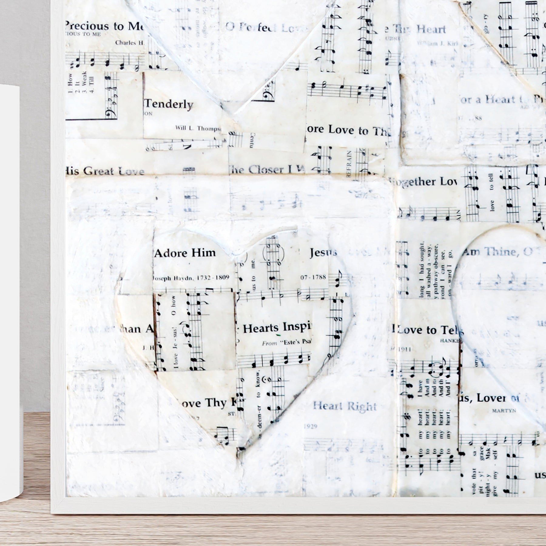 God is love—and that is something worth singing about! This quartet of hearts was made of strips of sheet music reclaimed from a vintage hymnal, interwoven and attached to the soundboard of a reclaimed antique piano. We selected hymns with themes of love and the heart, so this art is full of loving melodies.
