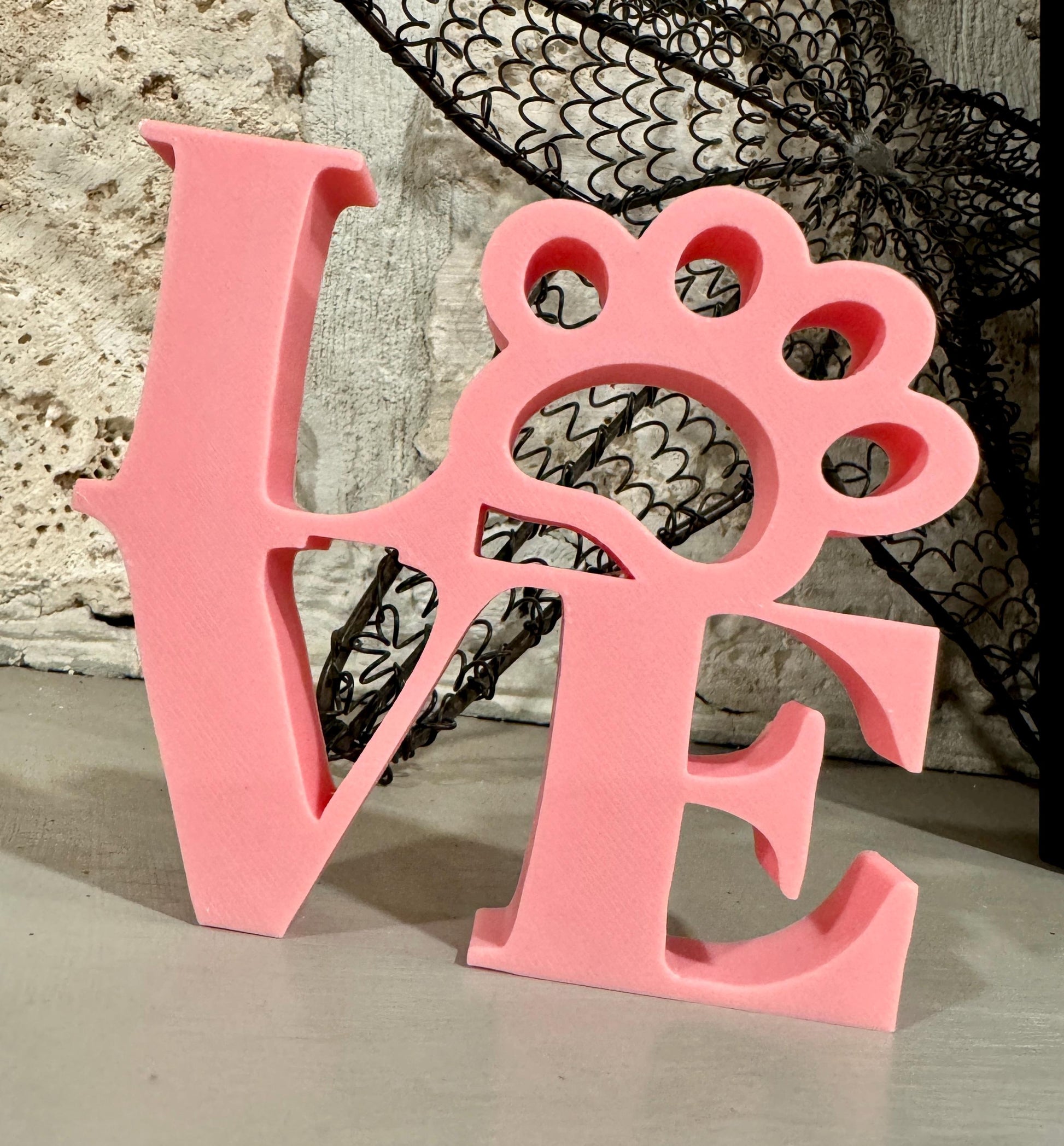 Cute decor sign / stand-up with the letters LOVE with the "O" being a paw print. 4" wide x 3" tall x .5" deep.