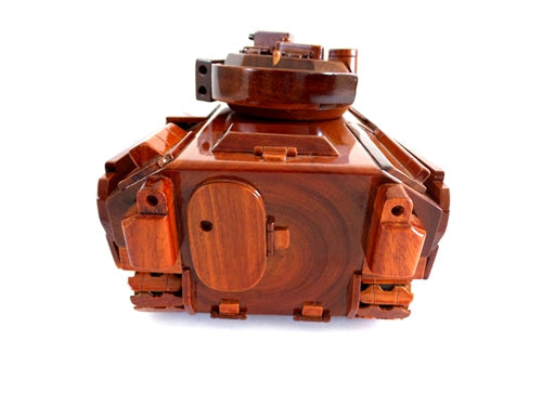 The vintage M2/M3 Bradley Fighting Machine is beautifully replicated in solid mahogany with finely carved details including movable track, rotating gun turret and traversing gun barrel. Weighing over 6 pounds, this model has three coats of polyurethane finish for high gloss and deep wood grain. Size 13" X 6.5" X 5"