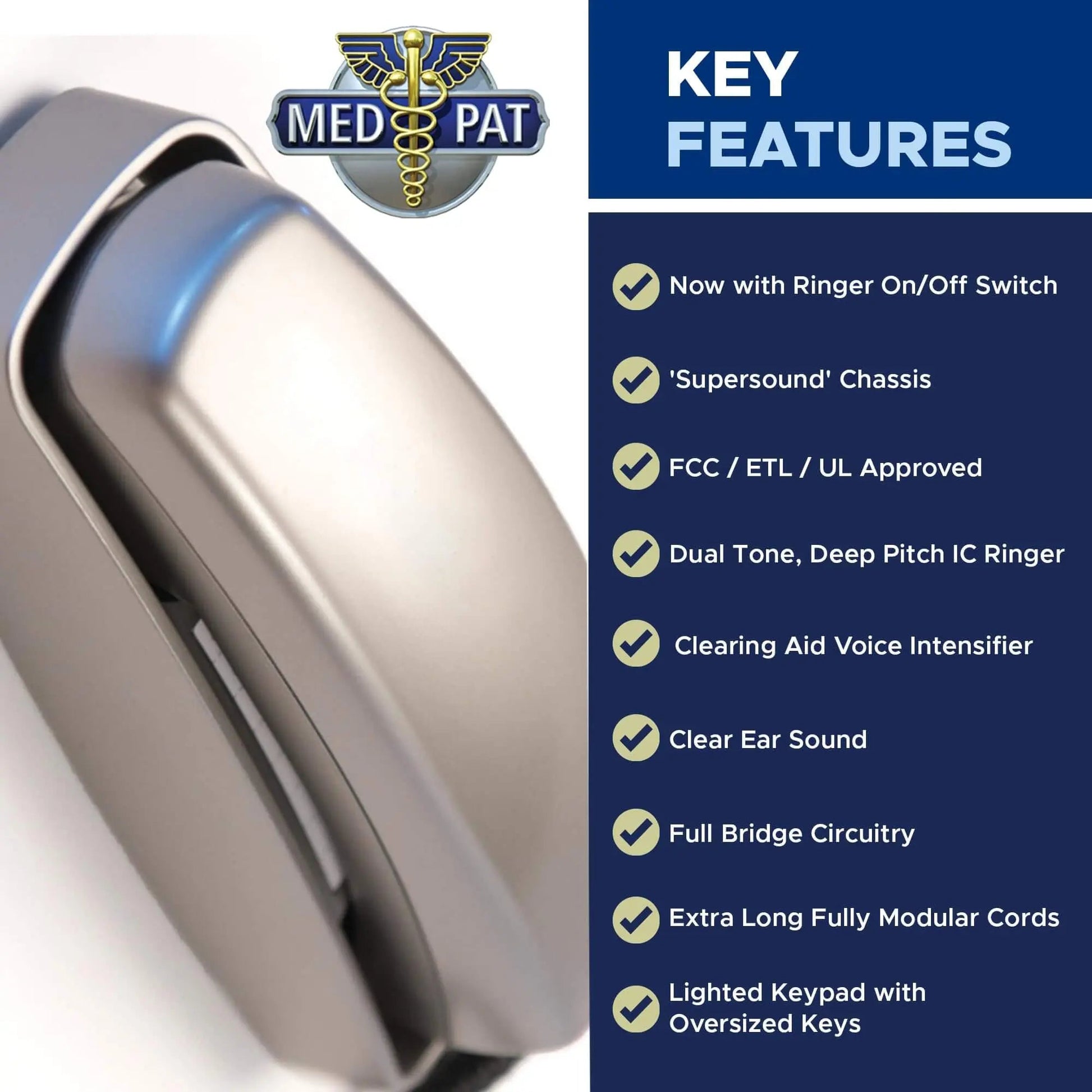 Now available in a sleek pewter finish, the Med-Pat TL-460 brings both function and style to your home phone setup.