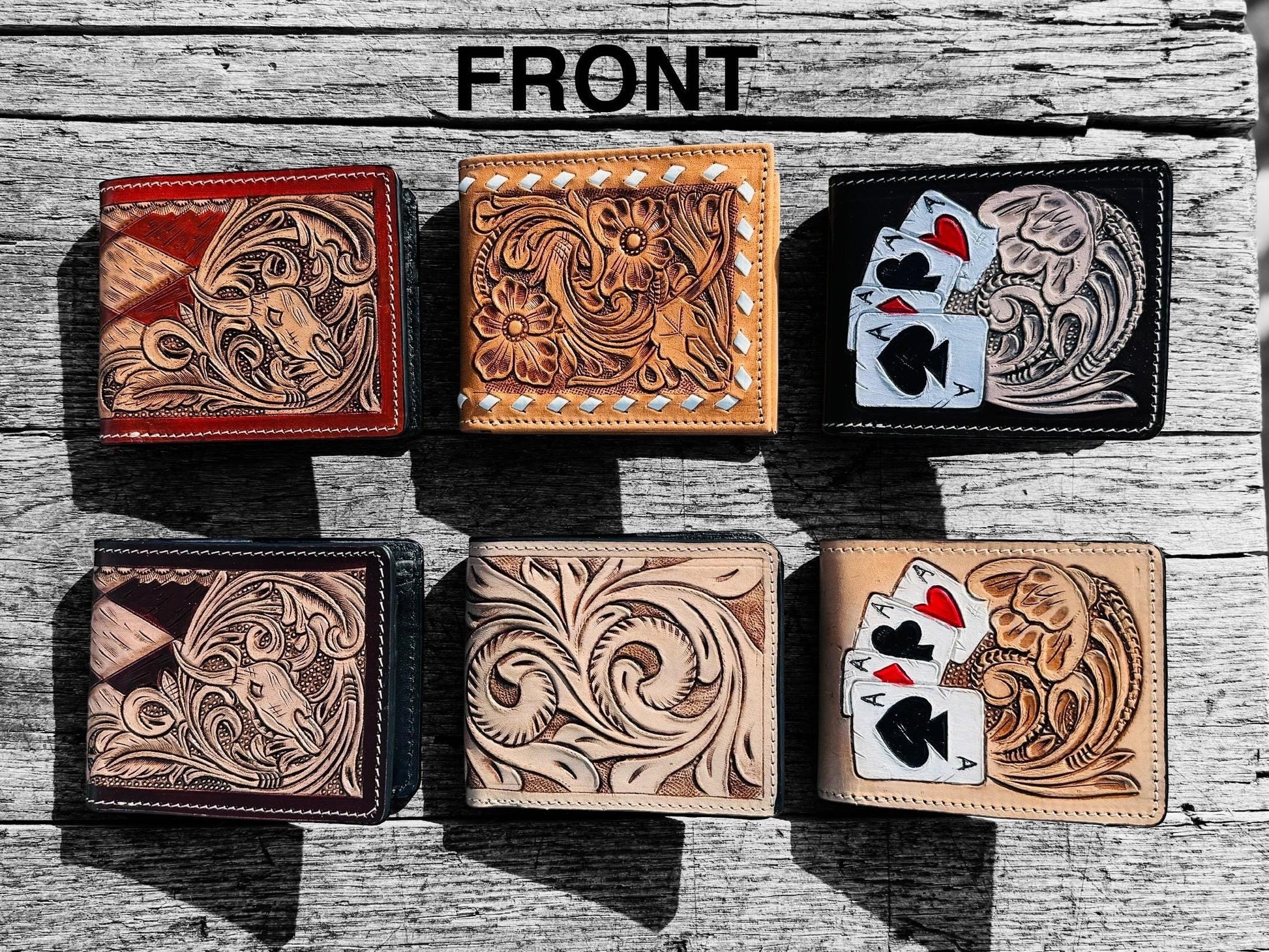 Men’s Western bi-fold wallet tooled floral Cow Skull Aces Cards details by Double B Wild Rags