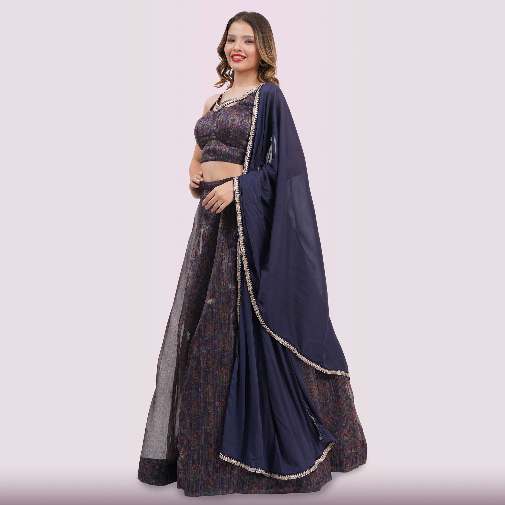 Custom Lehenga Choli, Designer Lehenga, Printed Lehenga, Midnight Blue Lehenga, Navy Blue Lehenga, Halter Neck Blouse, Golden Lace, Ready to Ship Lehenga, Indian Ethnic Wear, Wedding Lehenga, Evening Wear Lehenga, Party Wear Lehenga, Festive Lehenga, USA Shipping, Fast Shipping Lehenga, Lehenga Skirt, Choli, Dupatta, Indian Fashion, Traditional Indian Outfit, Women's Ethnic Wear, Lehenga Set, Occasion Wear, Indian Dress, Unique Lehenga, Houston, Texas Shipping