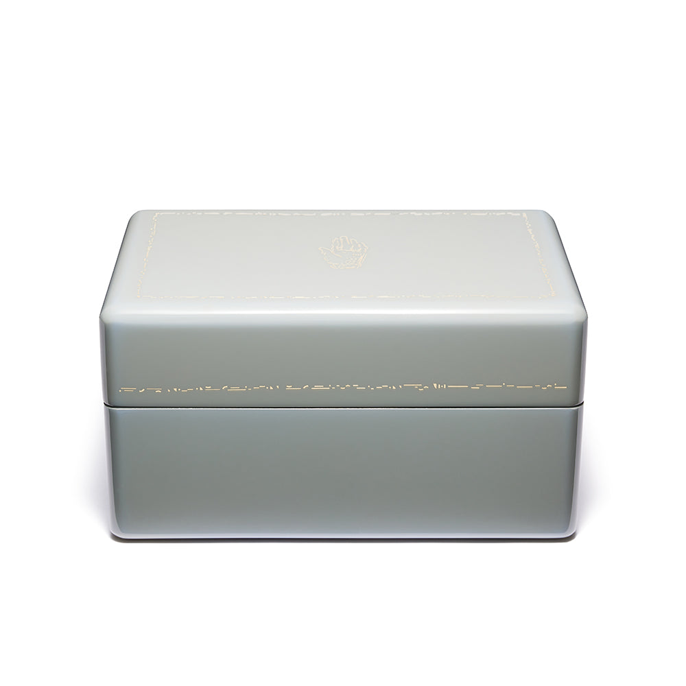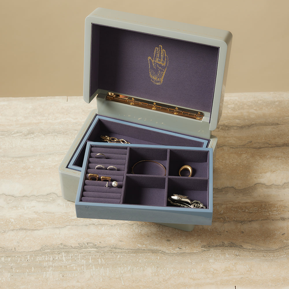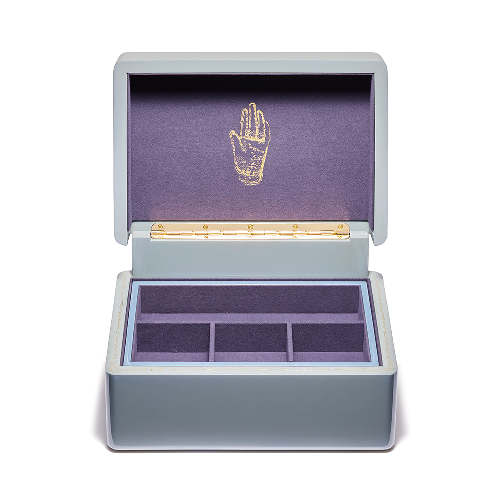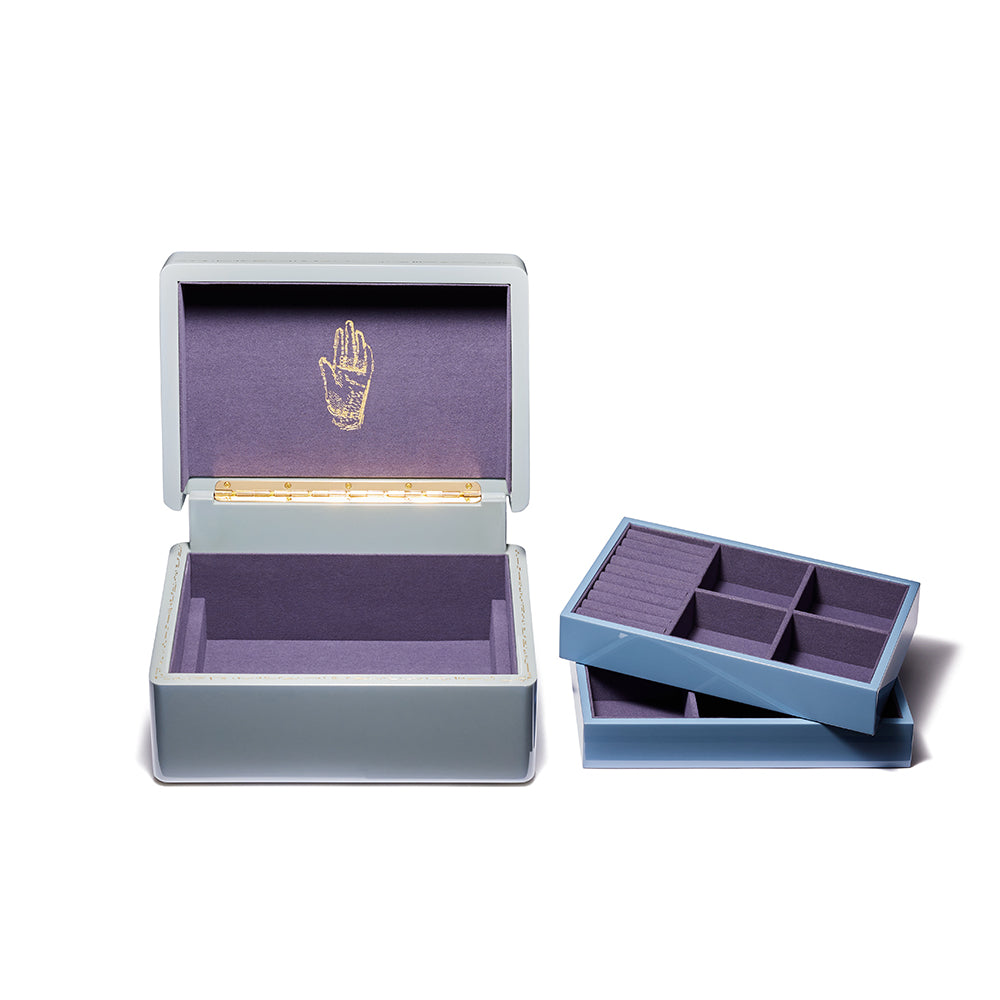 Mini Trunk is classically proportioned, in the size and scale of traditional jewelry boxes. The dusty blue lacquer finish gives it presence and opens to reveal a navy blue interior - a superb backdrop for your jewels to sparkle.