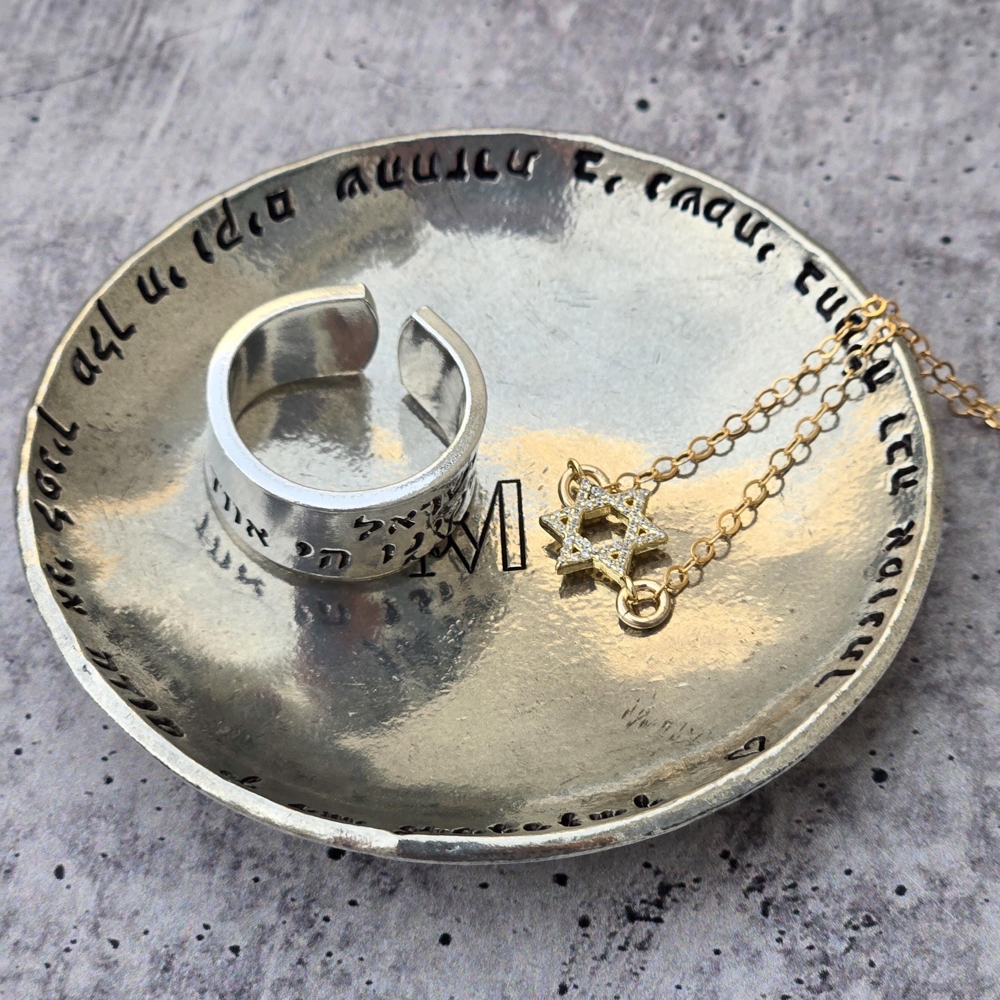 Start and end each day with gratitude. This handcrafted pewter ring dish is a meaningful addition to any tween or teen’s nightstand, featuring the full Modeh Ani prayer beautifully stamped in Hebrew around the inner rim. In English, it reads, "I am grateful," a gentle reminder of faith and mindfulness.