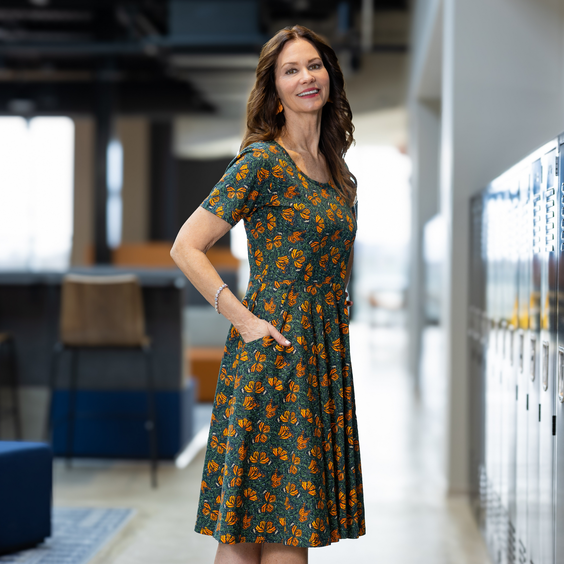 This epic migration showcases their resilience and navigational skills! Featuring a stunning array of vibrant monarch butterflies gracefully fluttering across the fabric, this piece captures the essence of transformation and freedom. This dress will have you feeling as light and graceful as a butterfly!