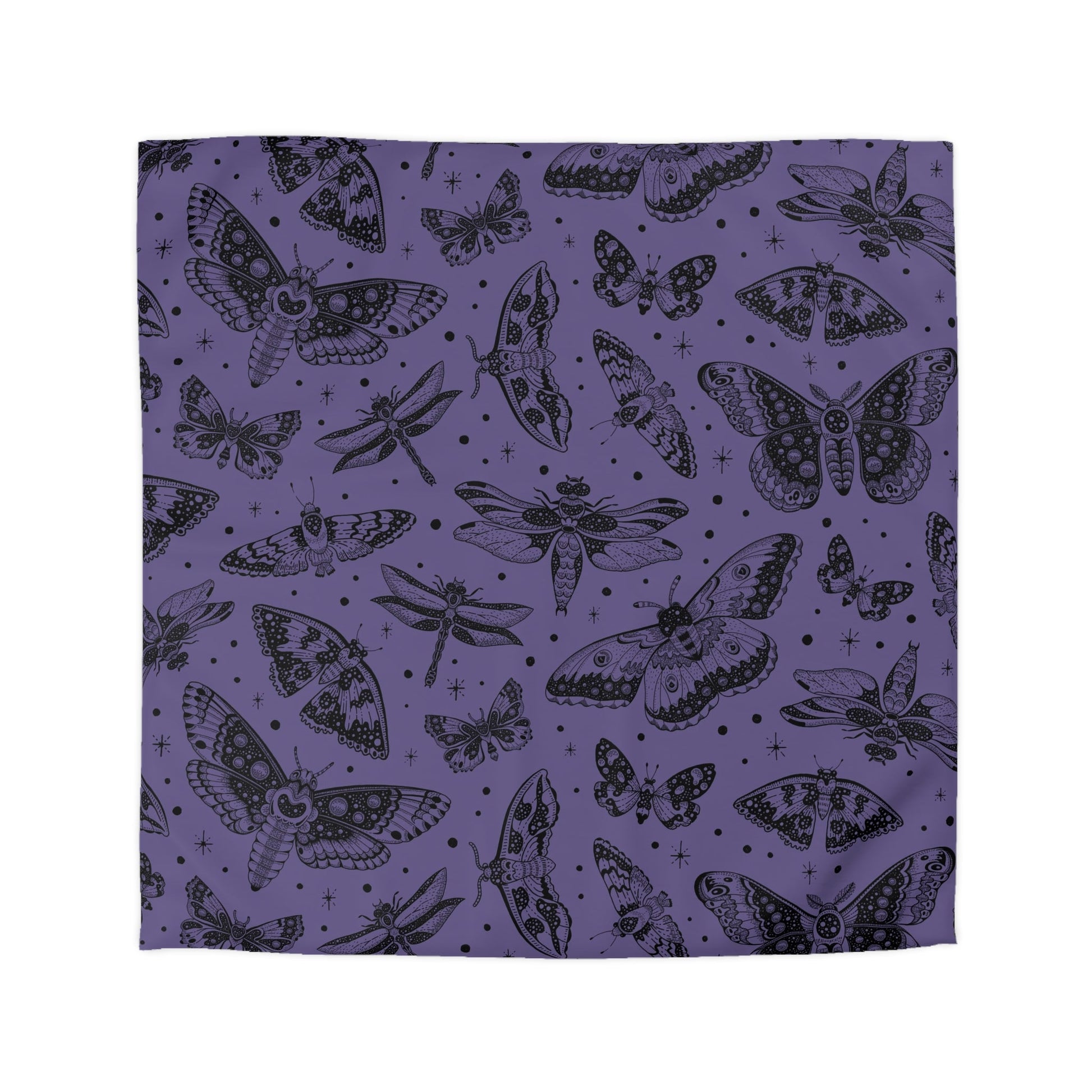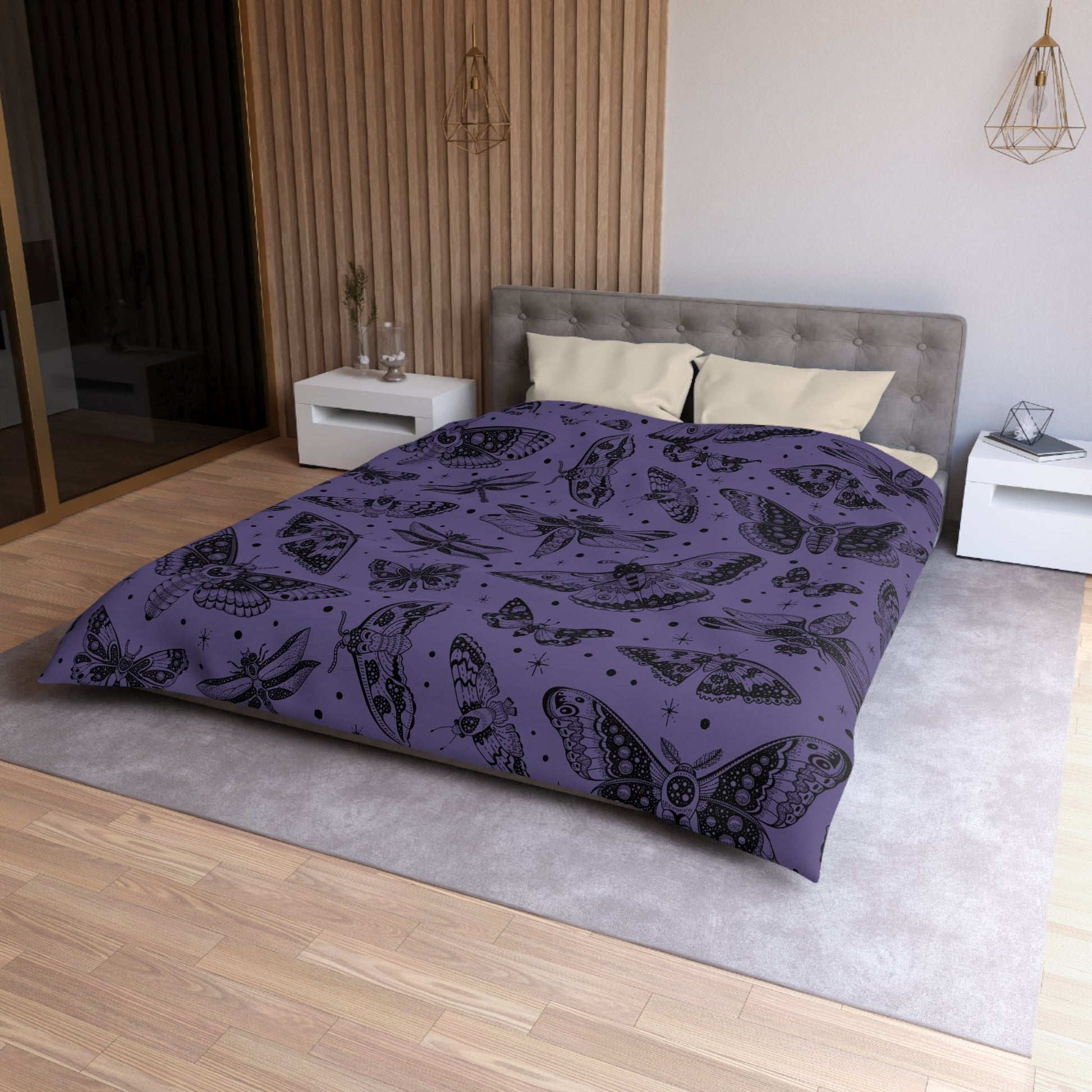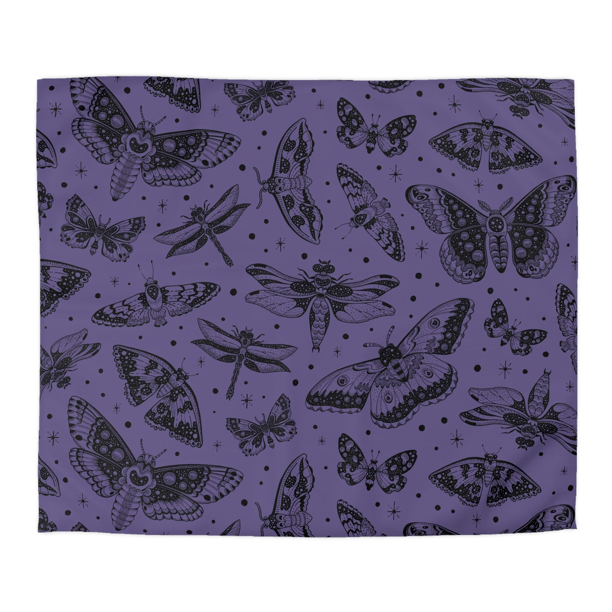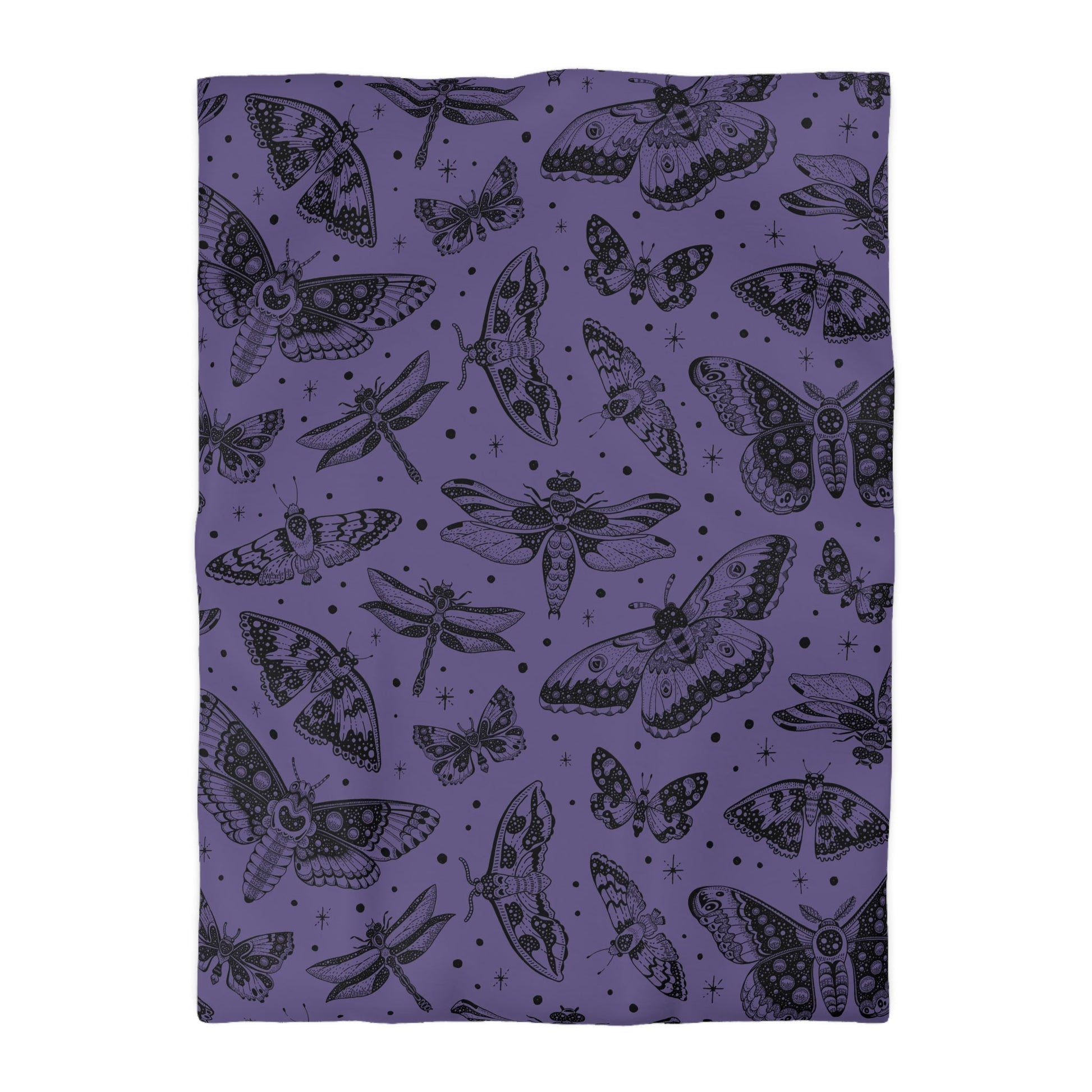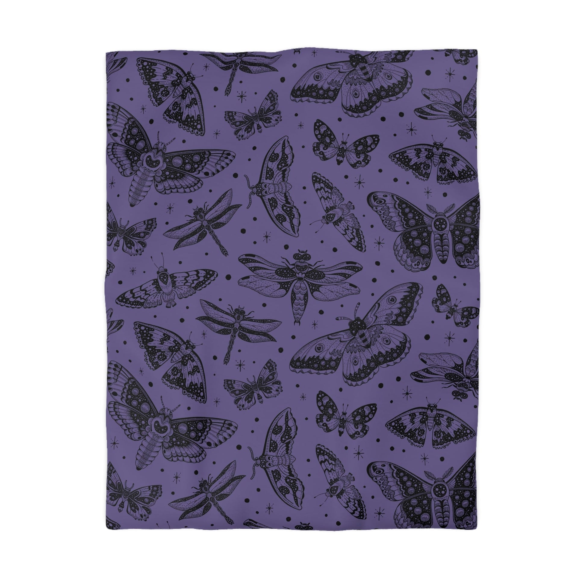 This duvet cover is a unique and cozy accessory for your bed. This duvet cover features a pattern of various moths on a purple background. The duvet cover is made of 100% polyester microfiber, which is soft, durable, and wrinkle-resistant. It has a zipper closure at the bottom that makes it easy to insert and remove your duvet, and gives it a seamless and elegant look.