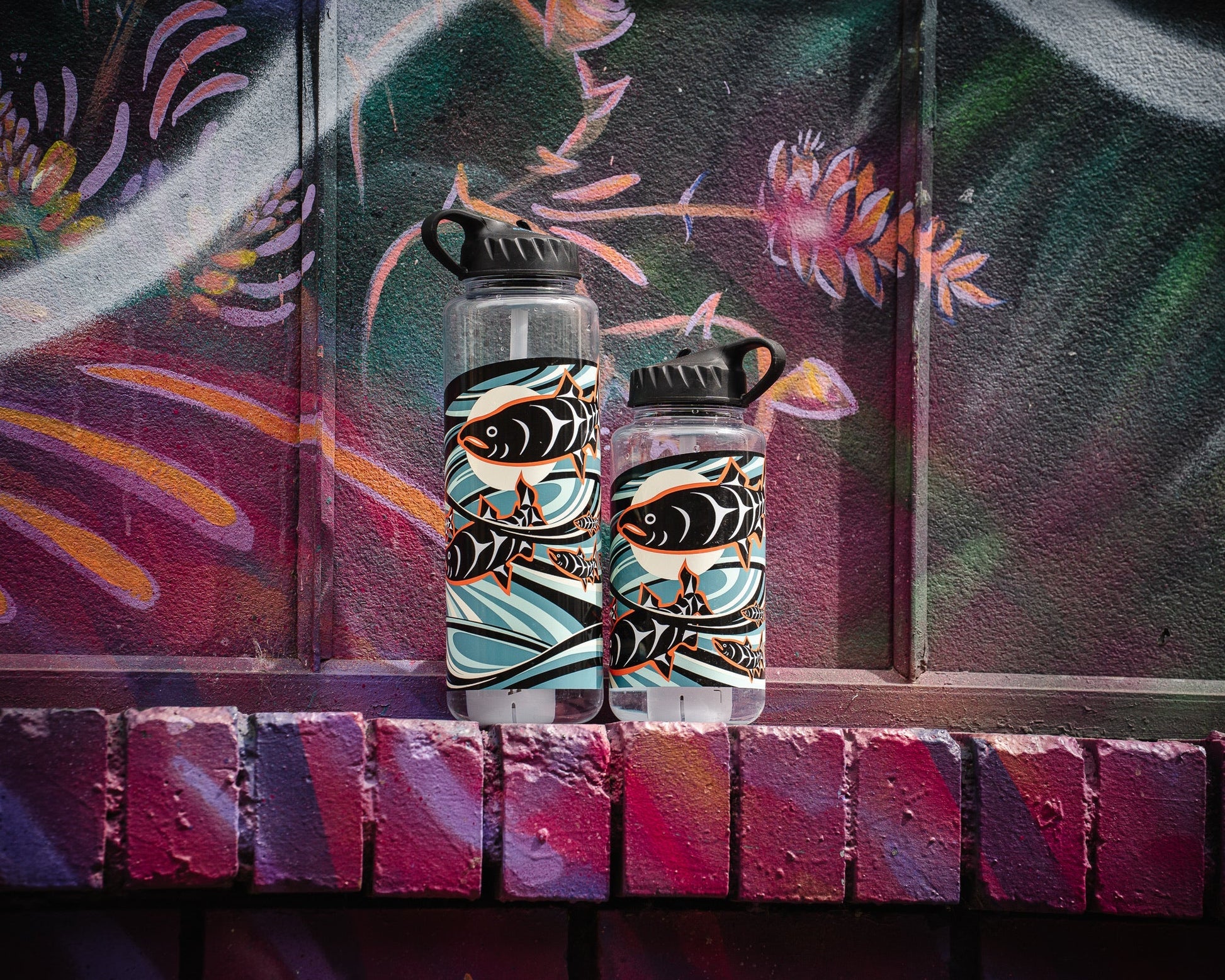 This design combines the contemporary style of Northwest artist Gretchen Leggitt with the traditional Coast Salish designs of Lummi Nation artist Jason LaClair, inspired by a 720ft mural they created together in Bellingham, WA, honoring LaClair’s ancestral connection to salmon.