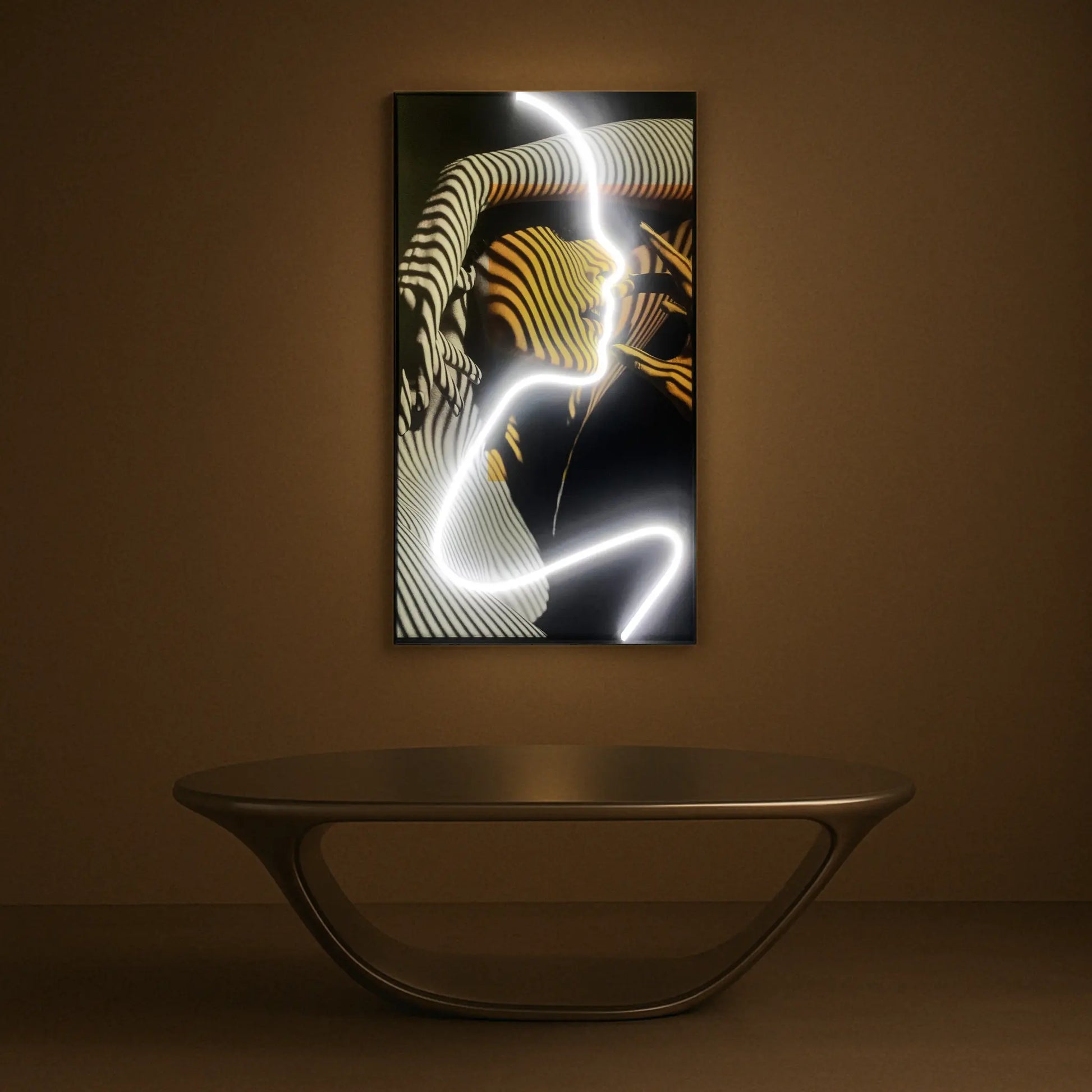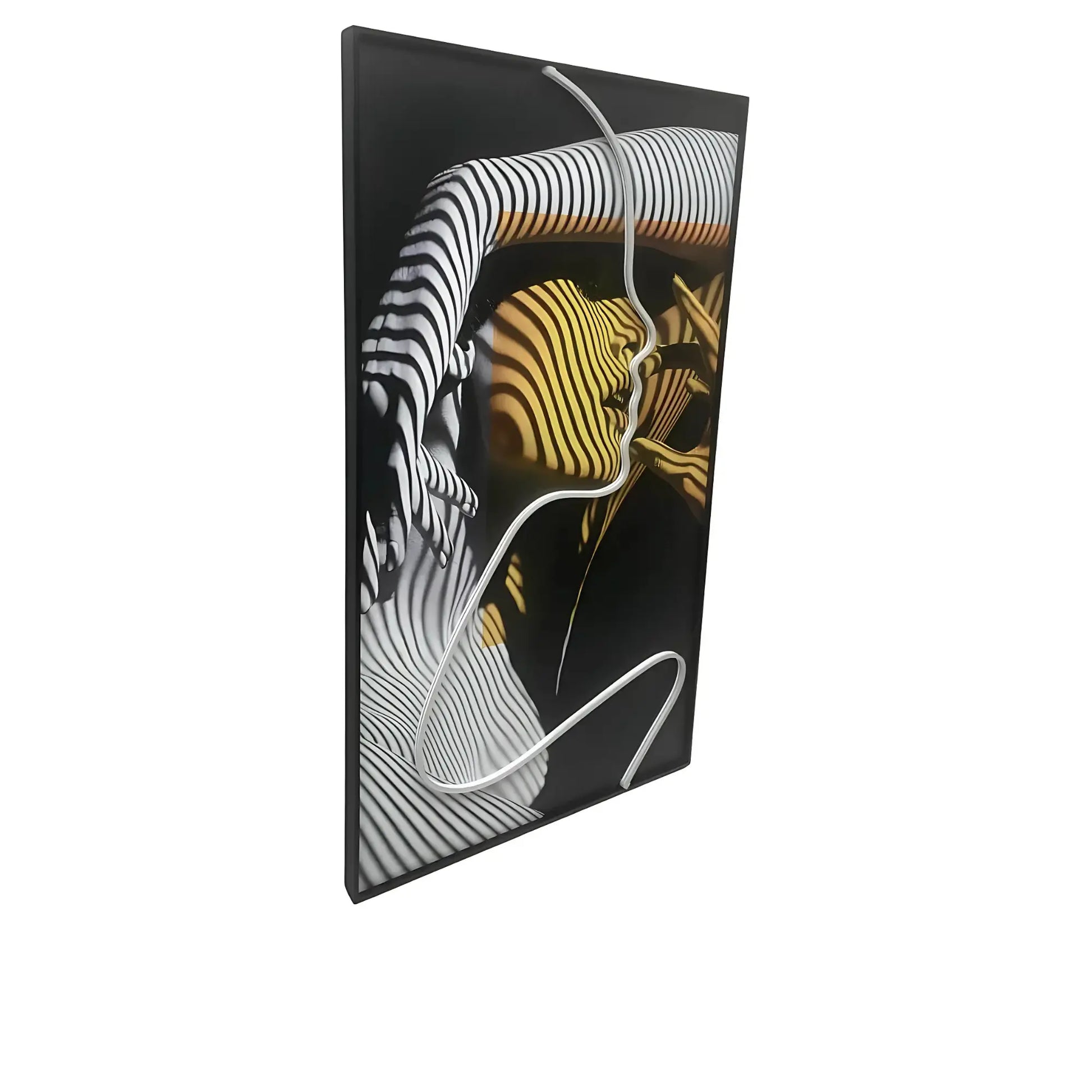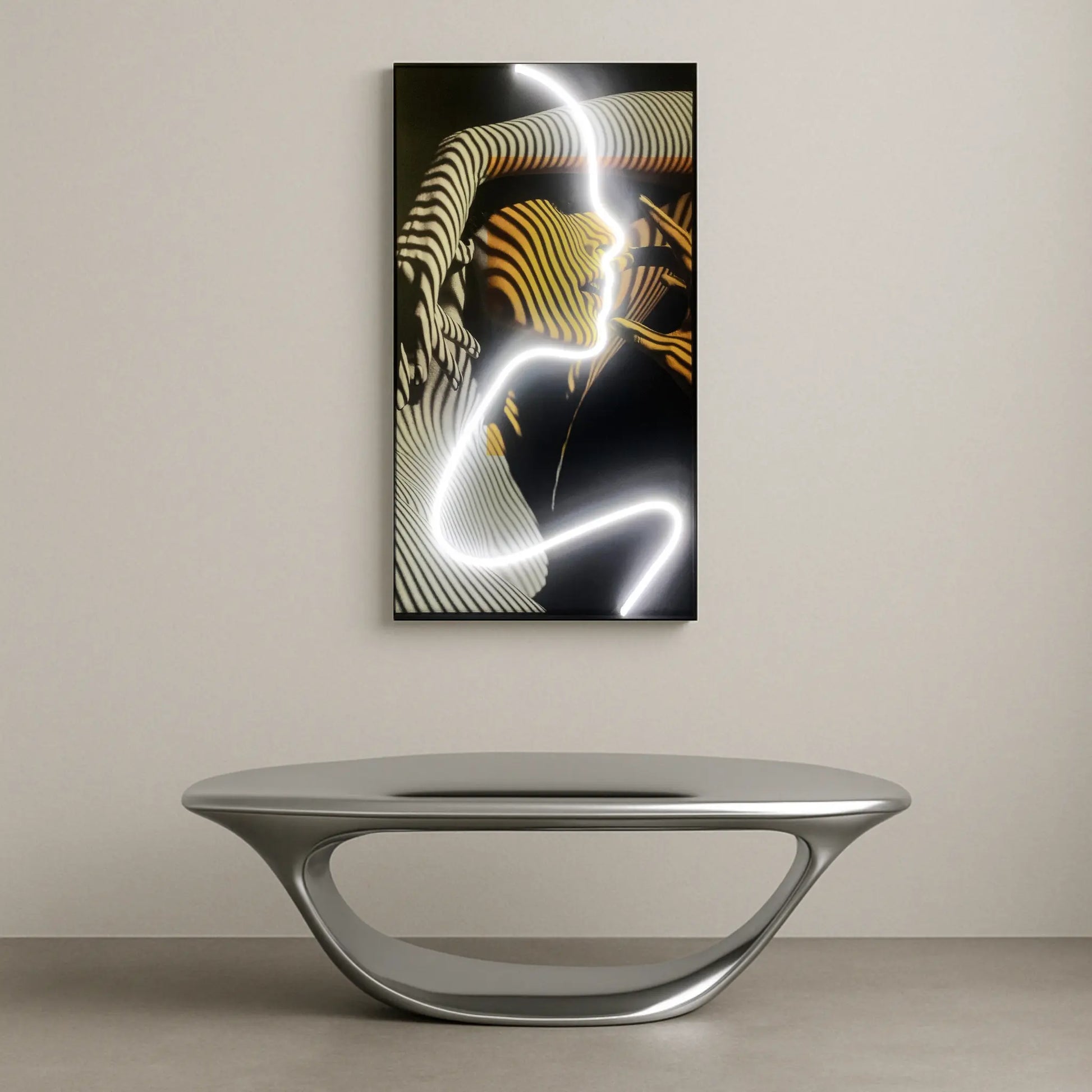 Introducing "Nighttime Noblesse: LED Wall Art" - a captivating wall print featuring an elegant lady shrouded in shadow, exuding an aura of mystery and sophistication. With an LED light tracing the outline of her face, this piece transforms into a mesmerizing spectacle when the room is dark, casting an enchanting glow that highlights her features. Whether lounging in a pagoda or amidst a night-time scene, the elegance of the lady captured in this artwork adds a touch of refinement to any space. Elevate your home decor with the allure of "Nighttime Noblesse" and let its captivating presence inspire intrigue and admiration in your surroundings.