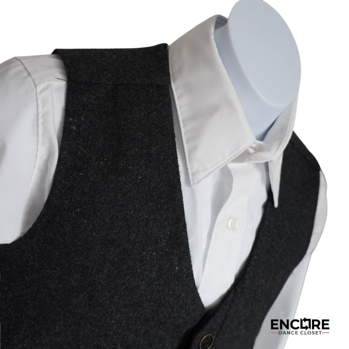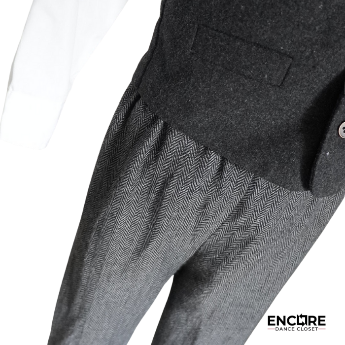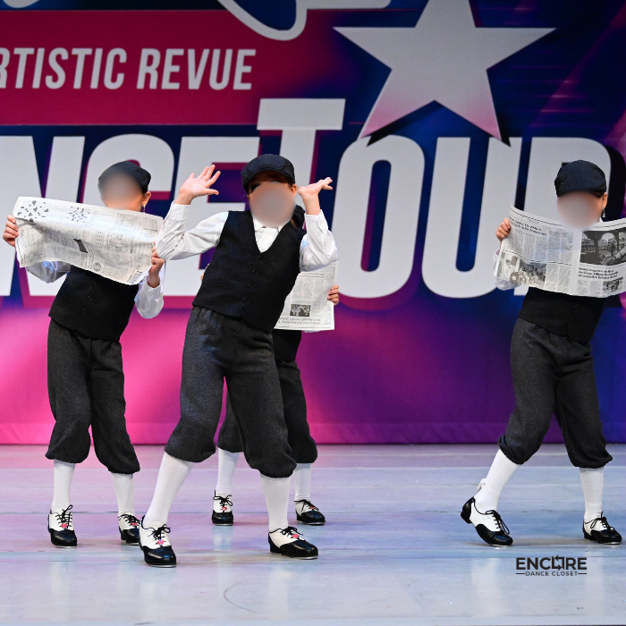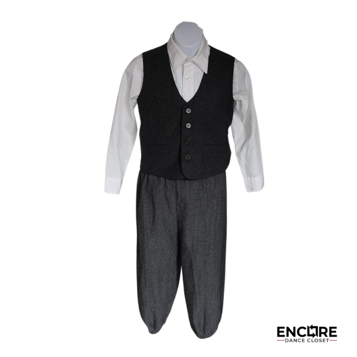 Vintage charm with Broadway flair. This musical theater/tap costume features cropped woven pants, a vest, white button-down, long socks, and a classic paperboy cap. Newsies meets The Wiz with big character energy.