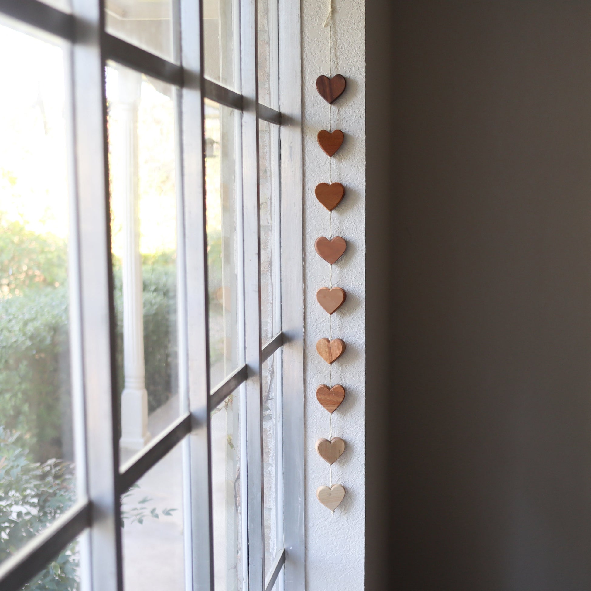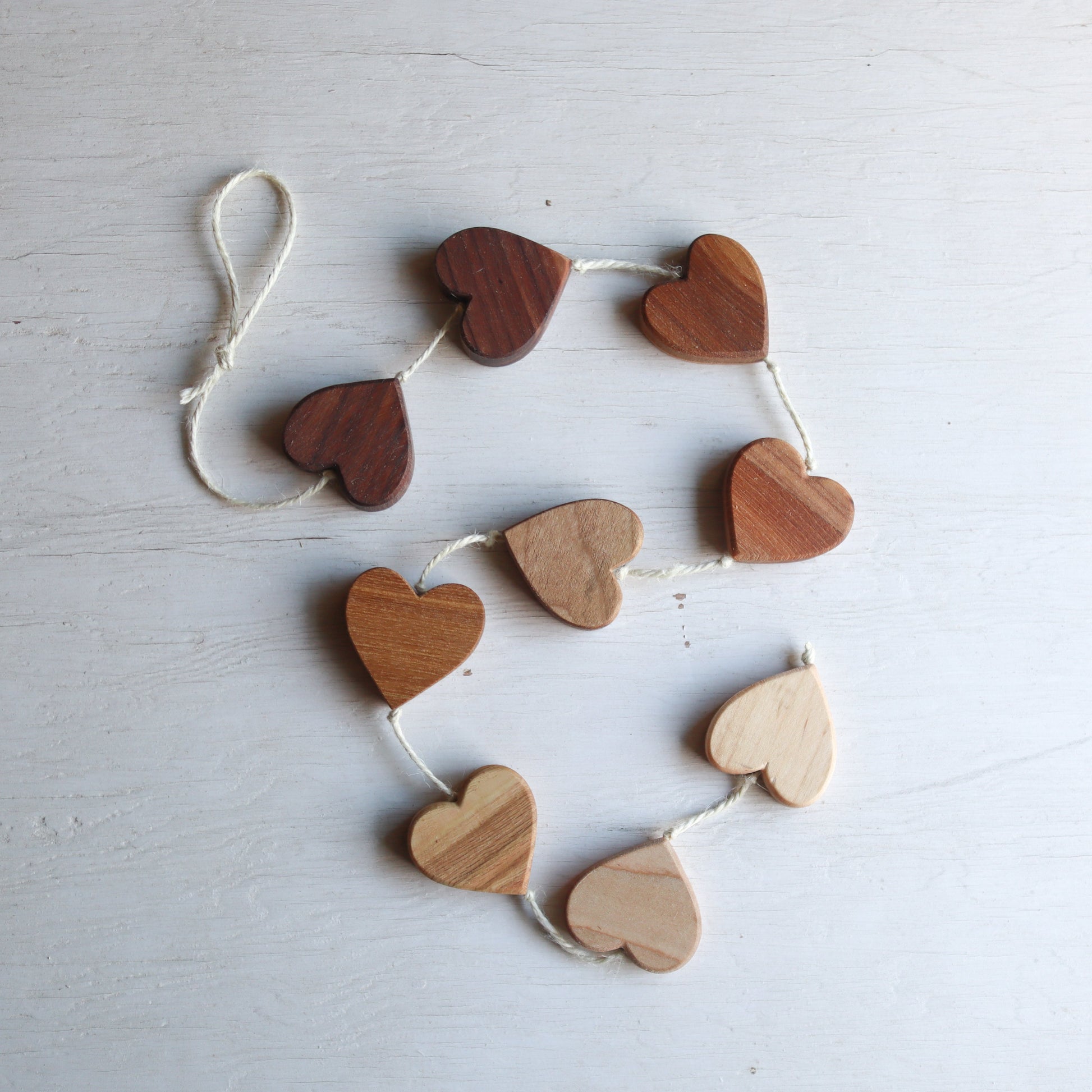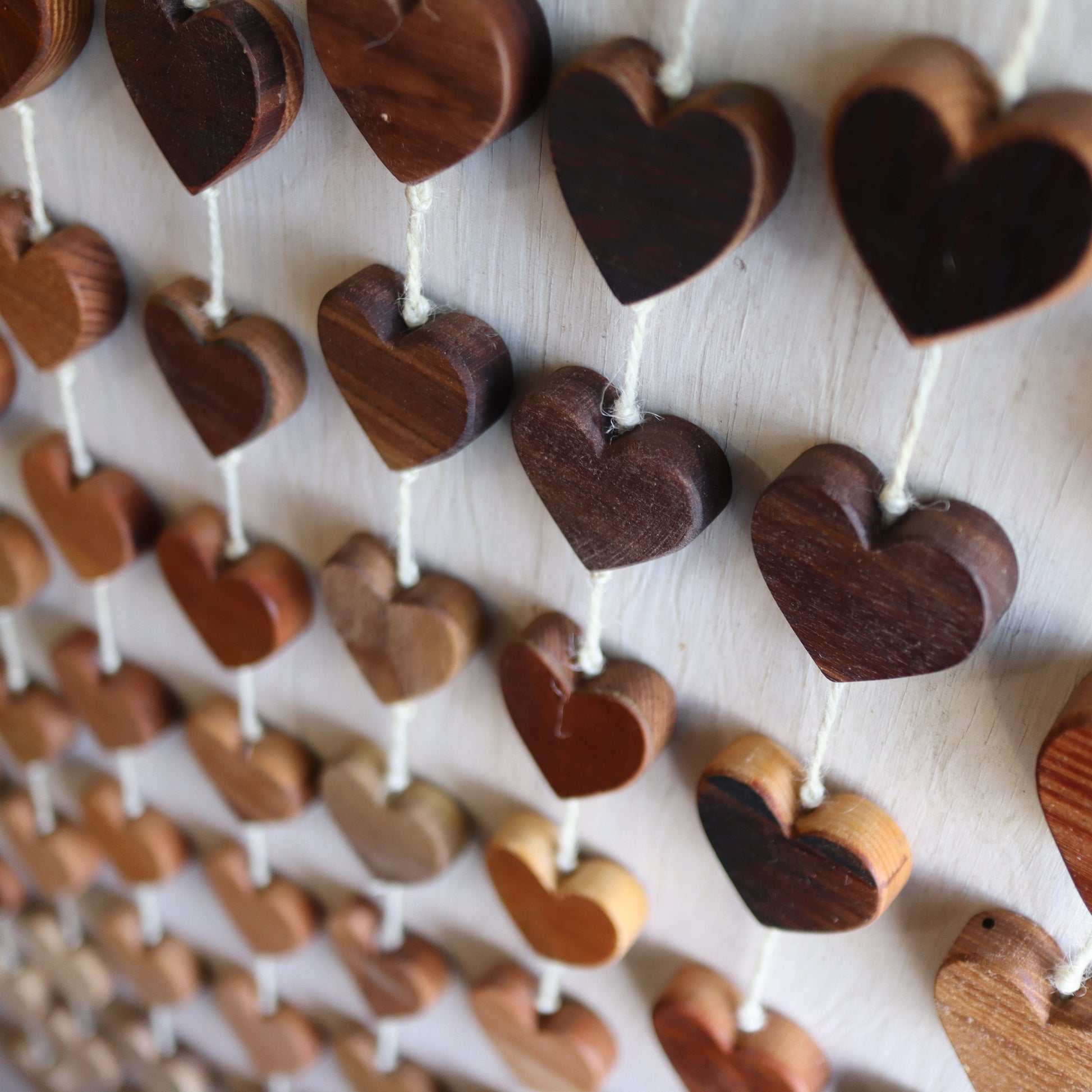Each includes nine wooden hearts. No two are alike since each heart is unique, but they all have an ombré motif, just like the beautiful sets in the images, each connected with an ivory jute string.