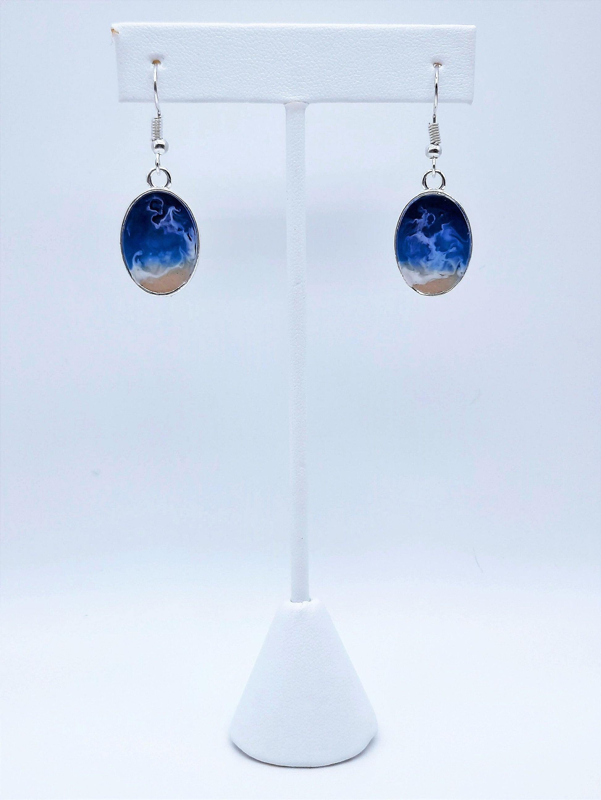 EACH PIECE IS ONE OF A KIND! THESE ARE NOT PHOTOGRAPHS! Resin beach scene earrings and necklace made with REAL SAND! Slight mica powder sparkle to them. 3D and trippy! Made with hypoallergenic stainless steel. Ear wire closure and 18" chain.