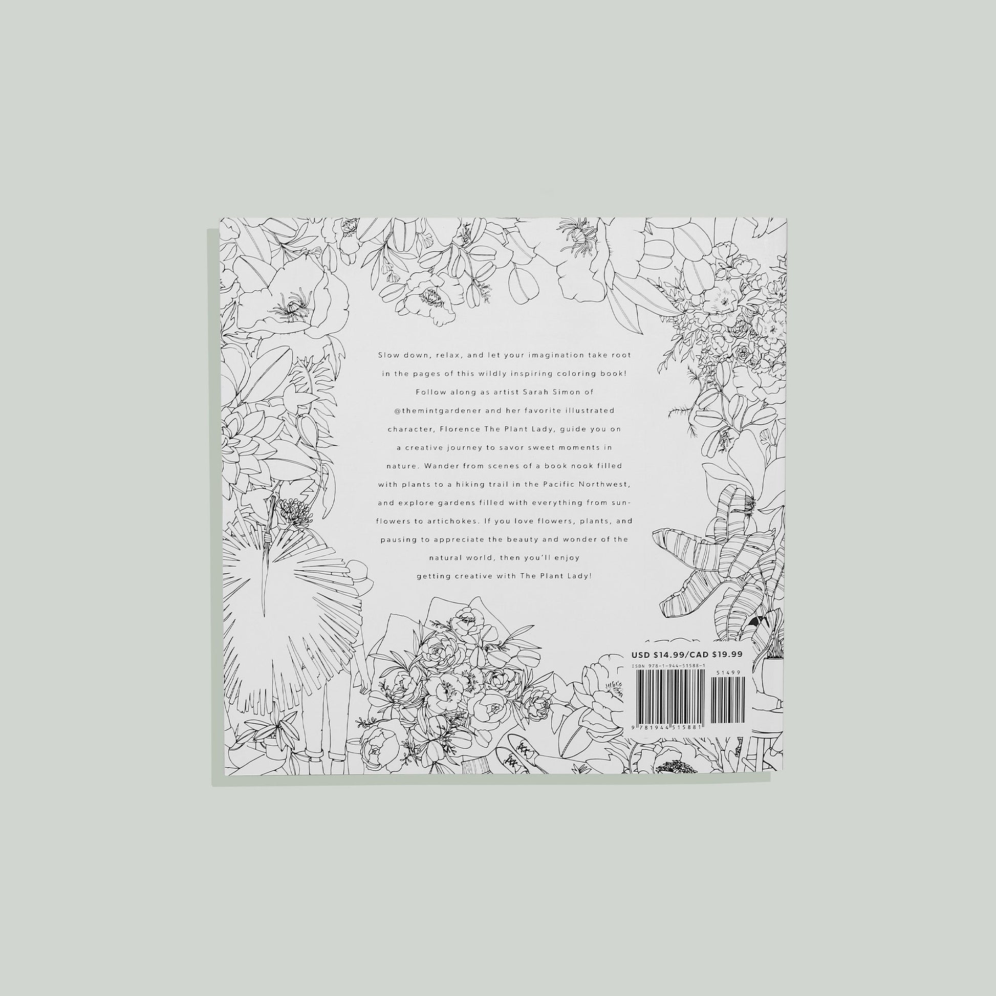 Artist Sarah Simon, of @themintgardener, weaves a beautiful floral theme through the pages using her favorite illustrated character, Florence the "Plant Lady." Follow along as the Plant Lady guides you on a creative journey to savor the sweet moments of nature. Wander from scenes of a book nook filled with plants to a hiking trail in the Pacific Northwest and explore gardens filled with everything from sunflowers to artichokes. If you love flowers, plants, and pausing to appreciate the beauty and wonder of the natural world, then you'll enjoy getting creative with The Plant Lady!