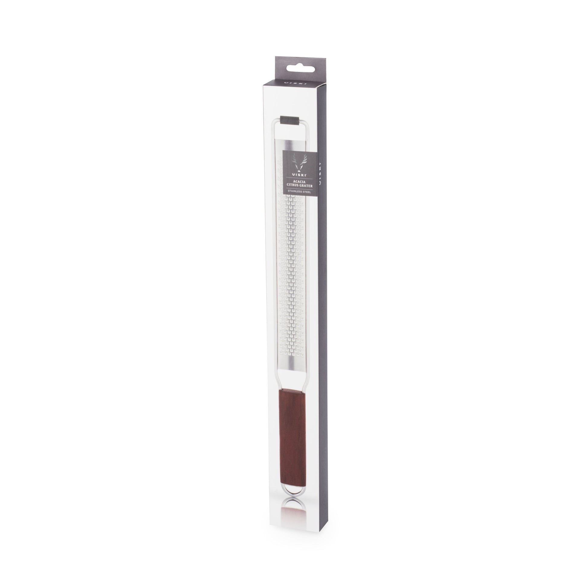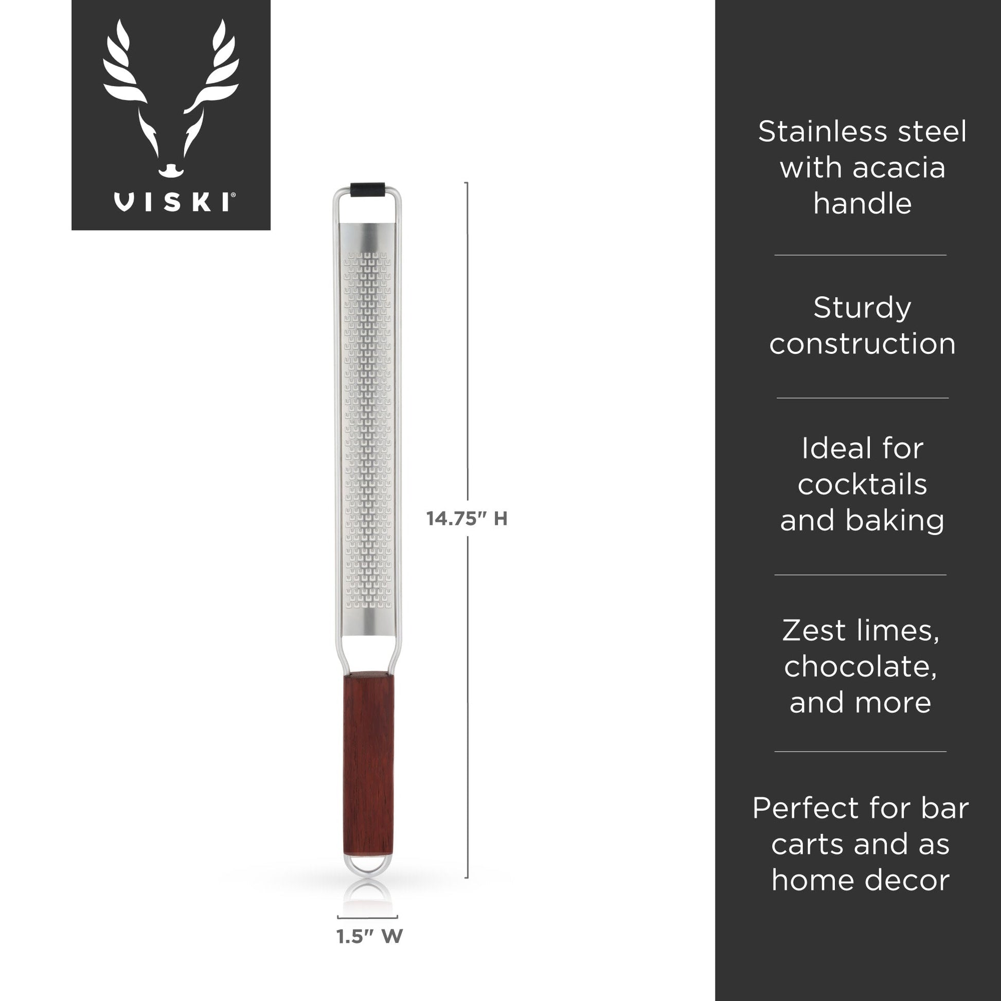 Finish handcrafted cocktails with a professional twist of citrus. Polished acacia with a smooth exposed grain provides ergonomic support while a generous expanse of stainless steel delivers a durable grating surface on which to shave segments of rind into delicate garnishes. Most suitable for oranges, lemons and limes.