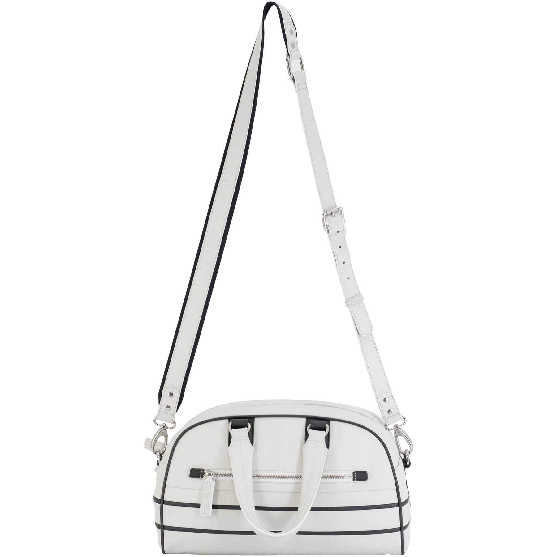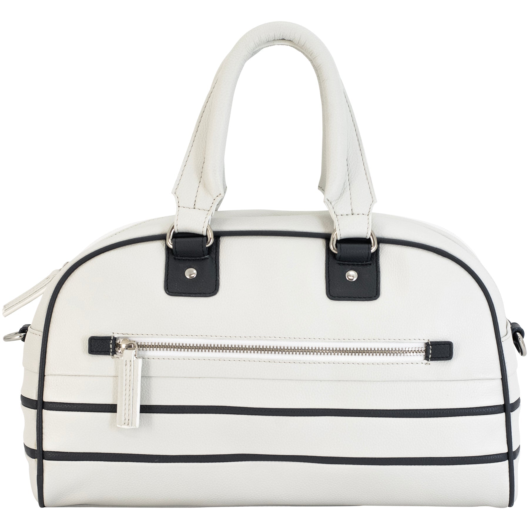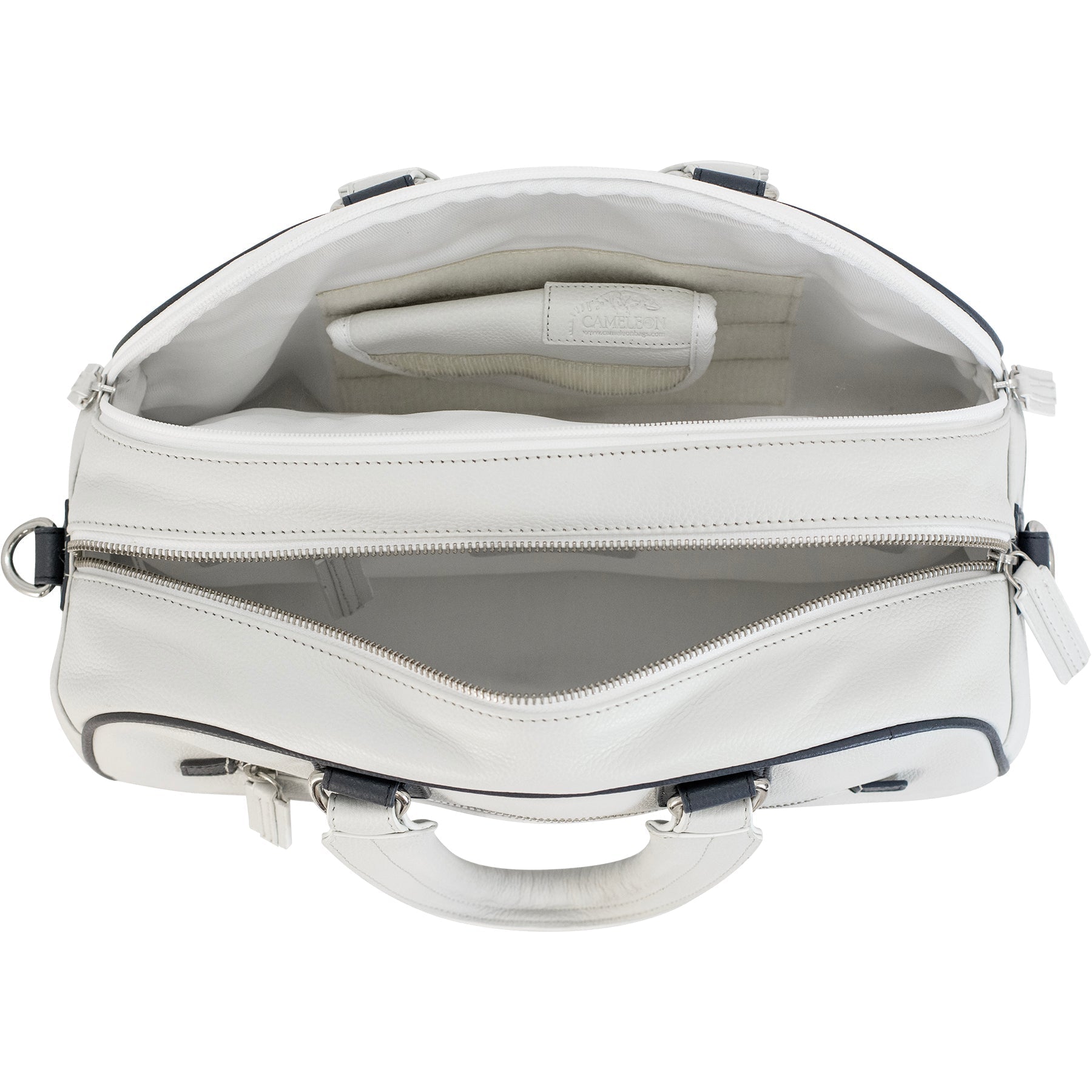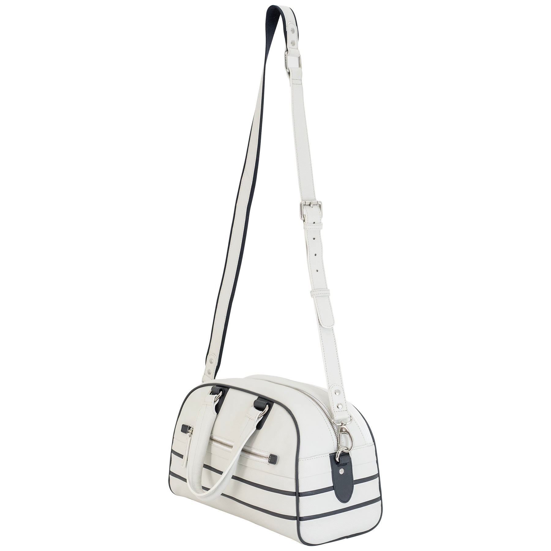 The exterior of the bag showcases meticulous attention to detail. The front of the bag features a handy zippered pocket lined with a soft fabric, which is the ideal size for storing small items like keys, cell phones, and other daily essentials. The clean lines and the neat white leather provide an elegant backdrop, accented by the striking navy blue trim that borders the pocket.