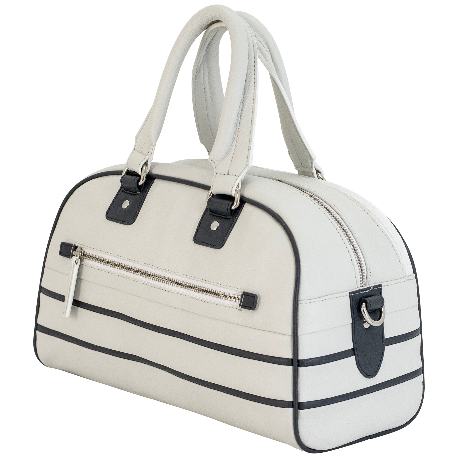 This concealed carry bowling bag is a perfect blend of style and functionality, crafted from soft white leather with contrasting navy blue trims. It exudes sophistication and discretion, ensuring that it's as suitable for professional environments as it is for casual outings.