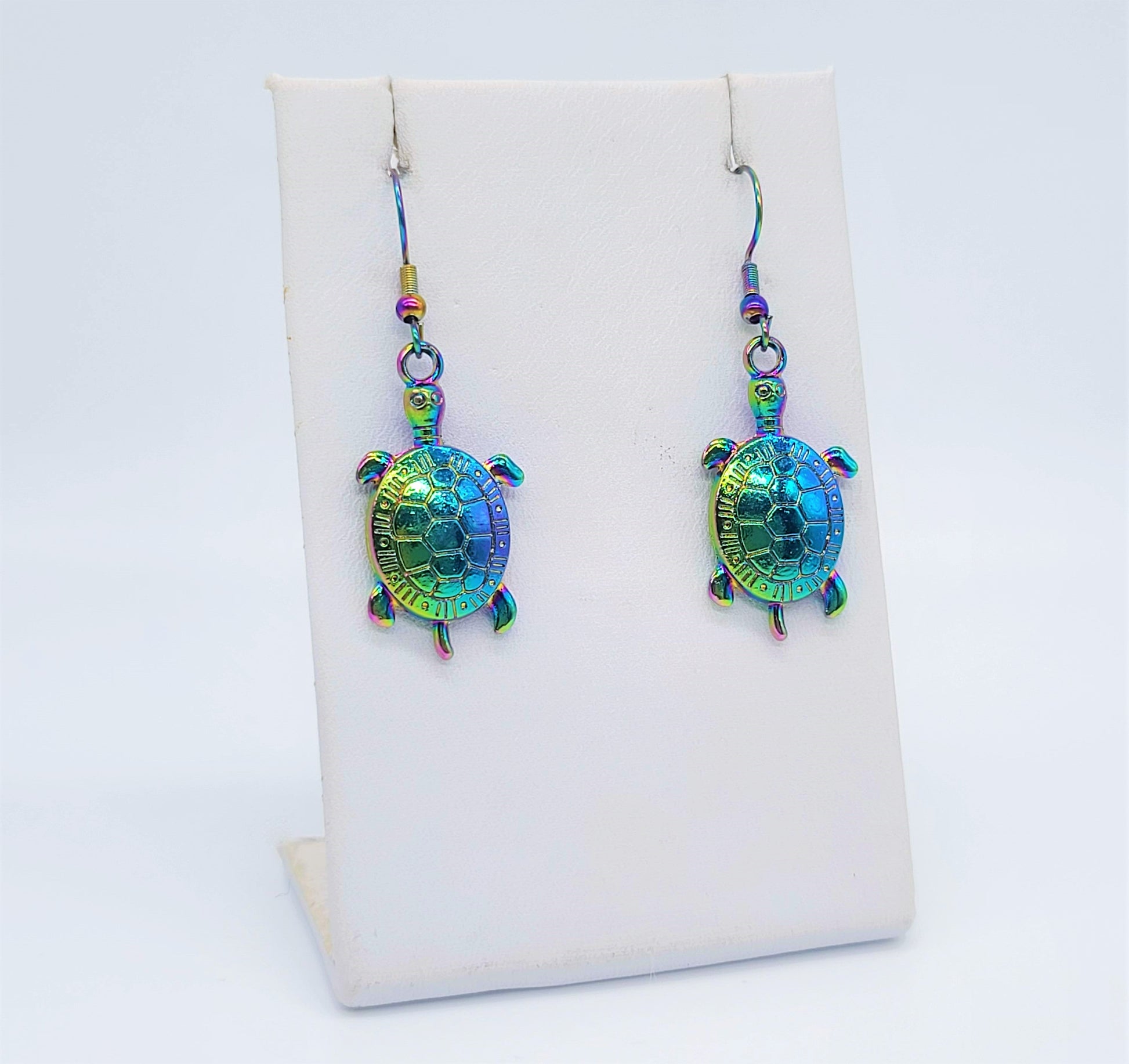 Handcrafted Rainbow Chromium Iridescent Sea Turtle Dangle Earrings / Made with Hypoallergenic Stainless Steel Ear Wire Hooks.