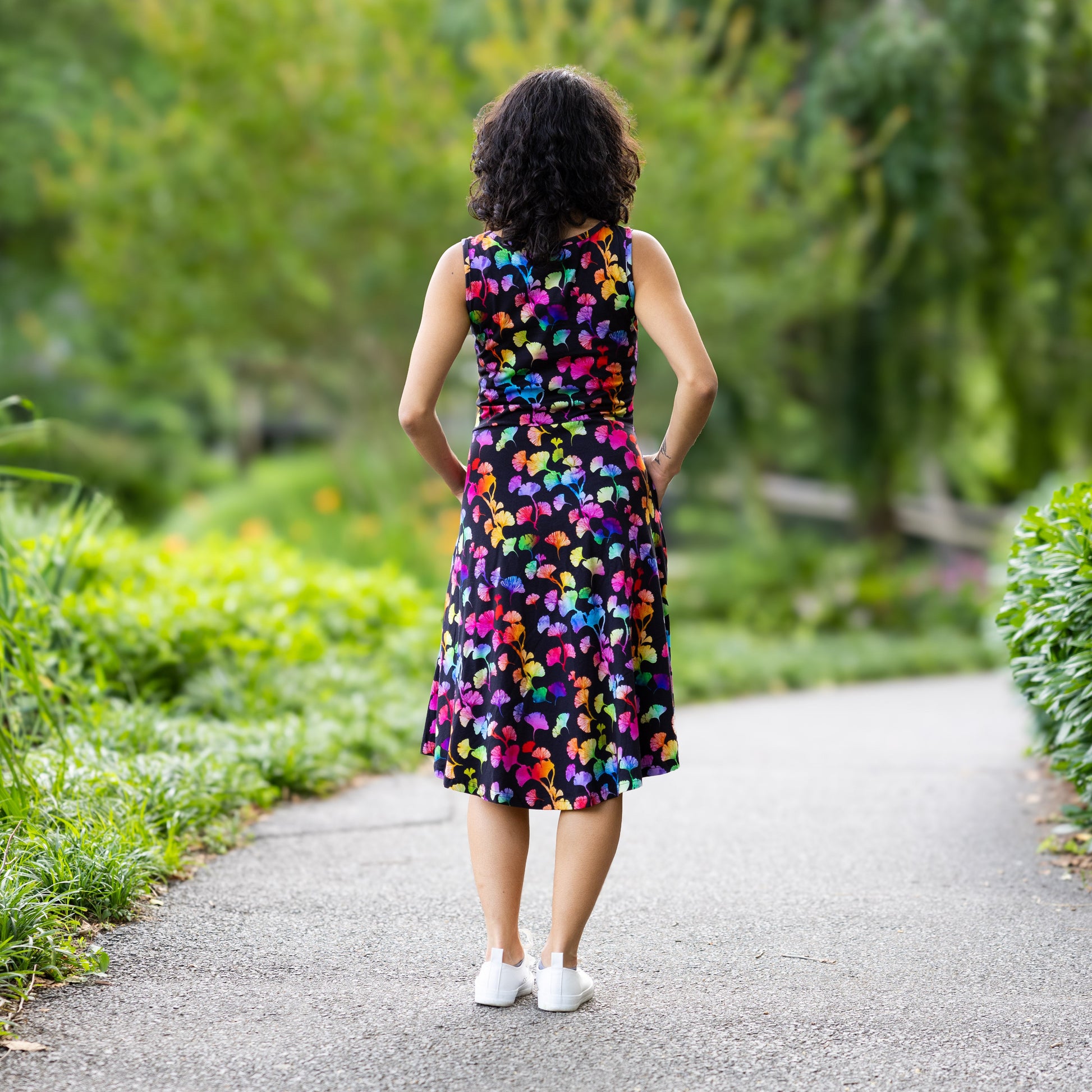 - Sleeveless, scoop neck, 1/2 circle twirl adult dress with pockets