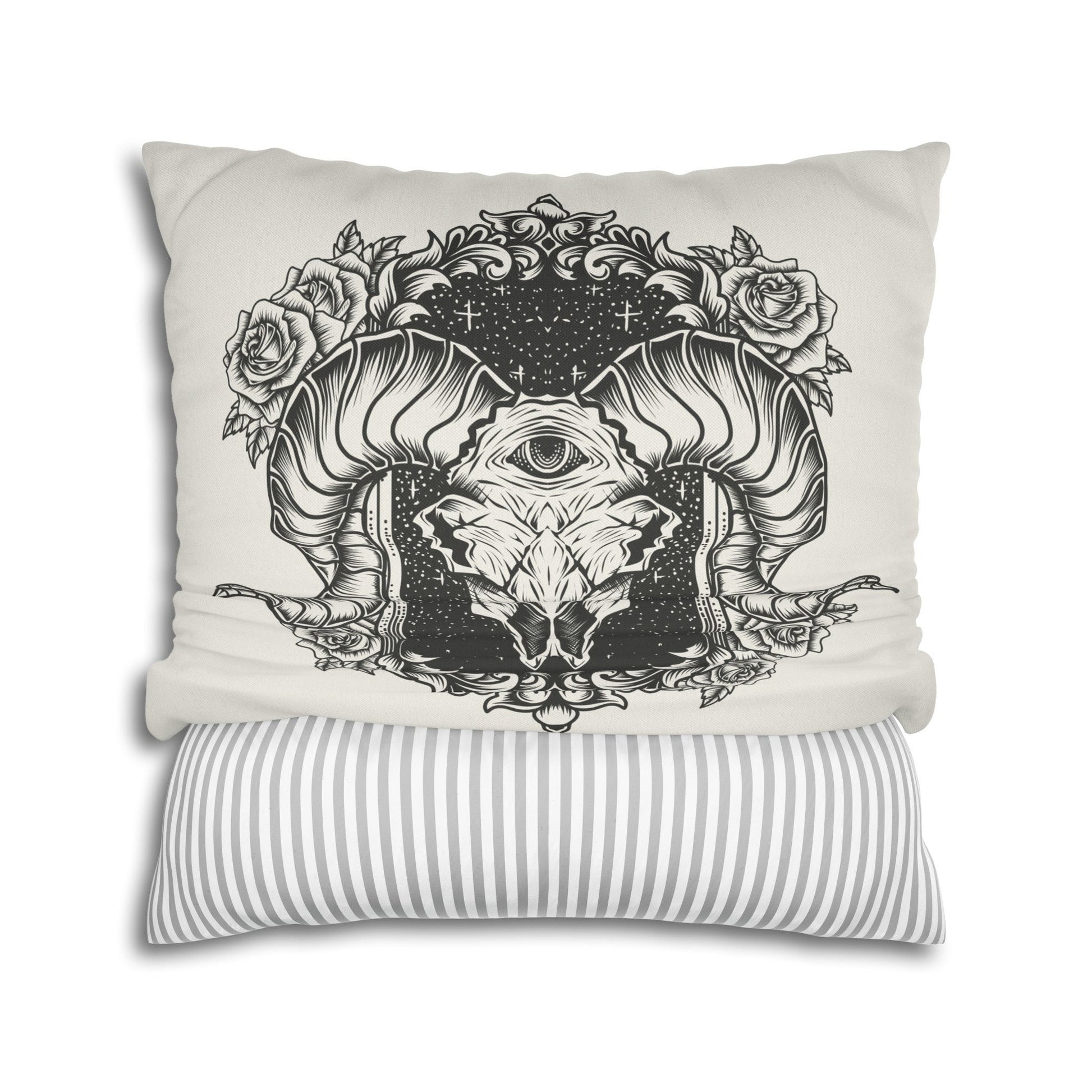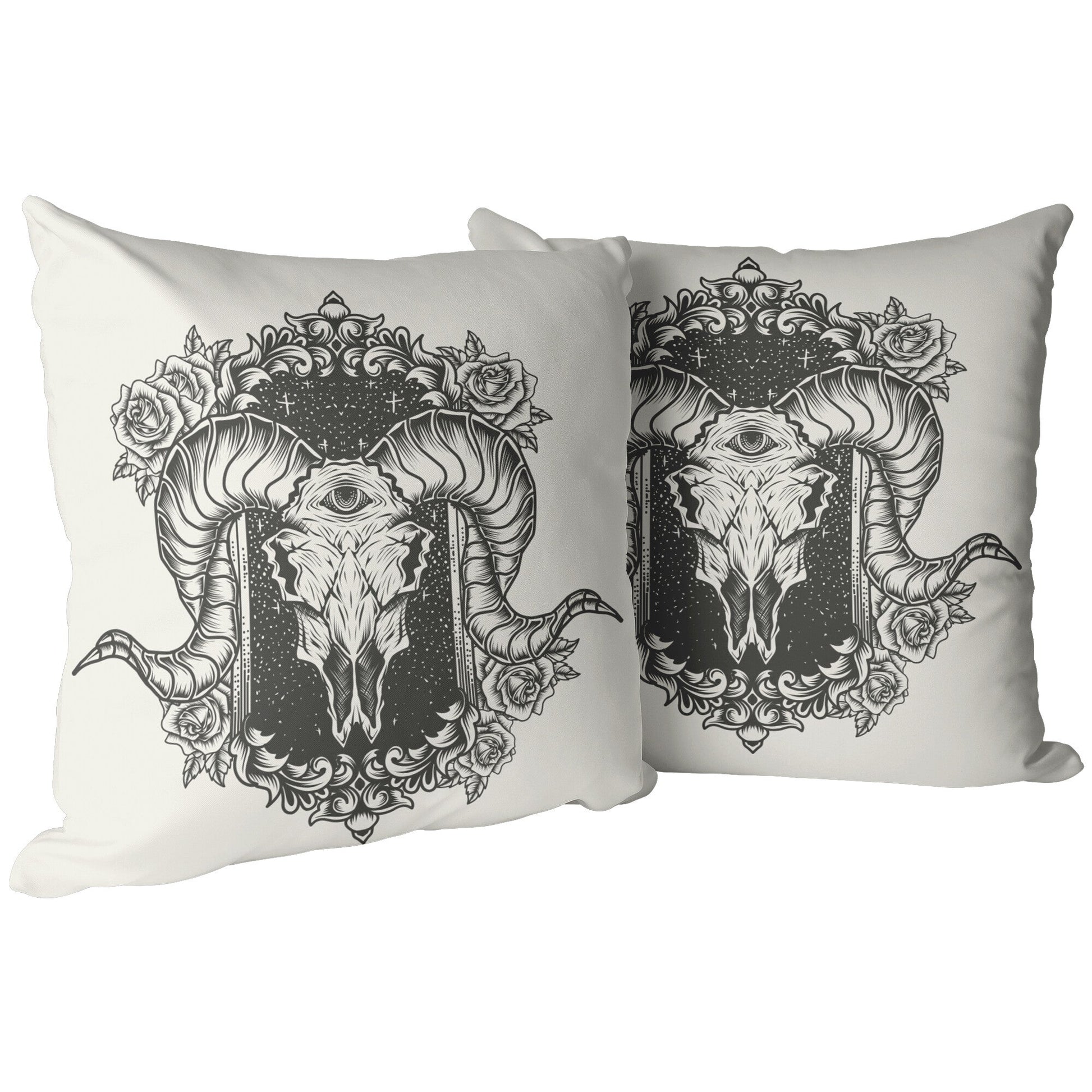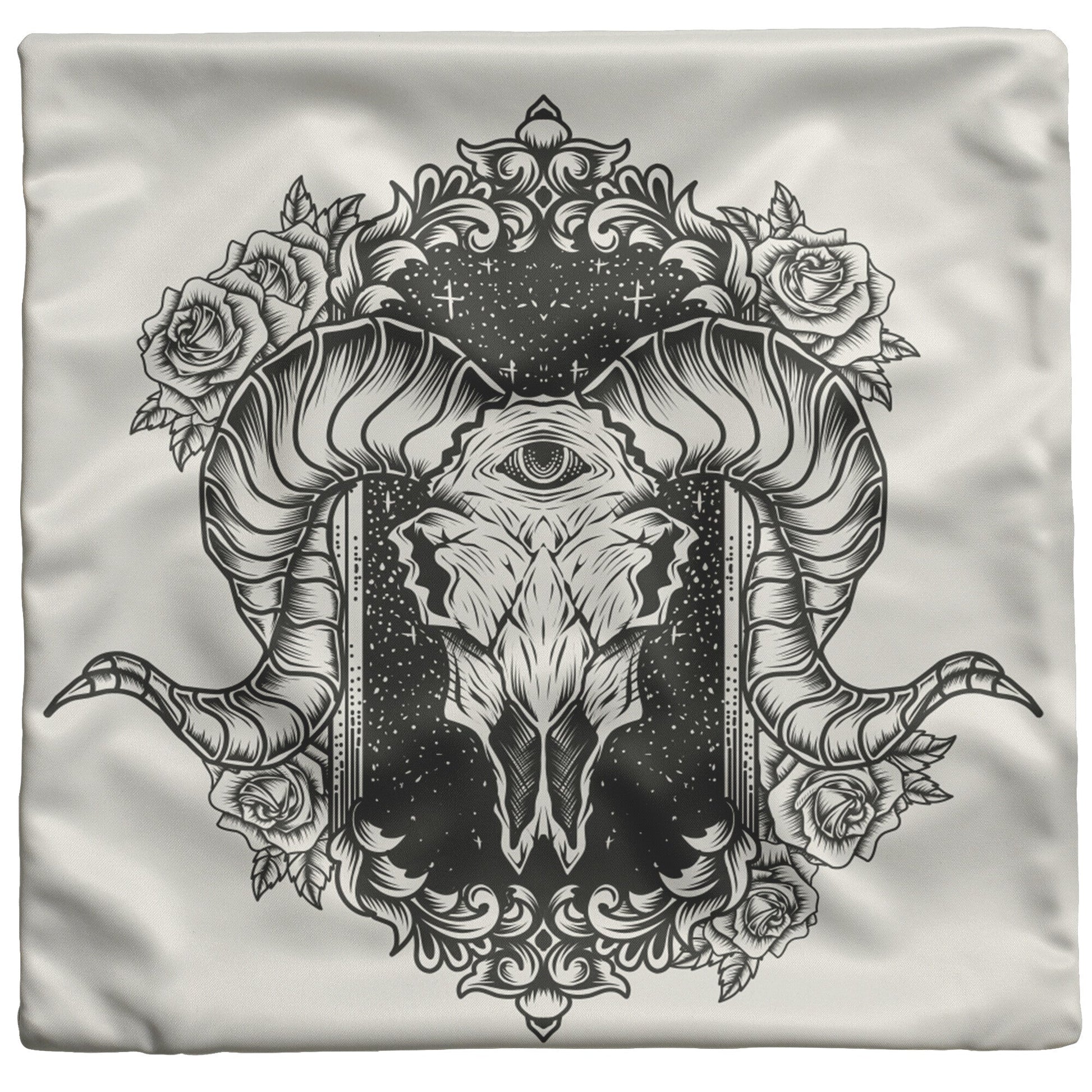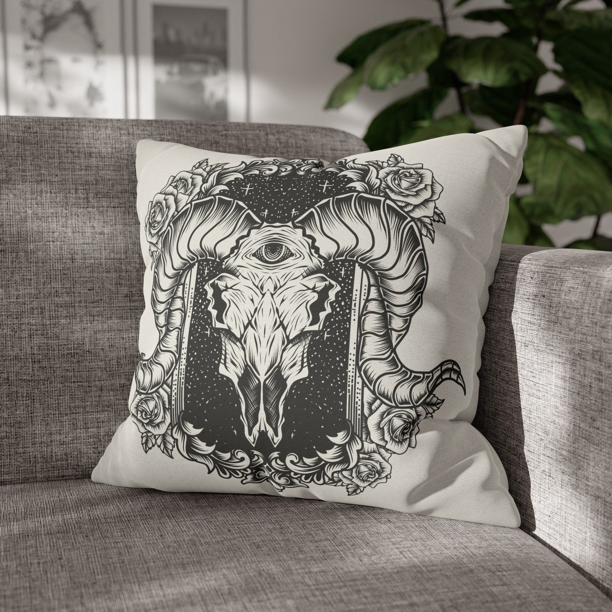 Venture into the mystical with our “Ram Skull” Throw Pillow, featuring a hand-drawn design of a ram skull with an open third eye, symbolizing enlightenment and higher consciousness. Set against an ornate framed doorway leading into space, the dark gray illustration on an off-white background creates a striking contrast. Perfect for dark boho, gothic, occult, maximalist, eclectic, and dark hippy decor styles, this pillow adds a touch of the enigmatic to any space.
