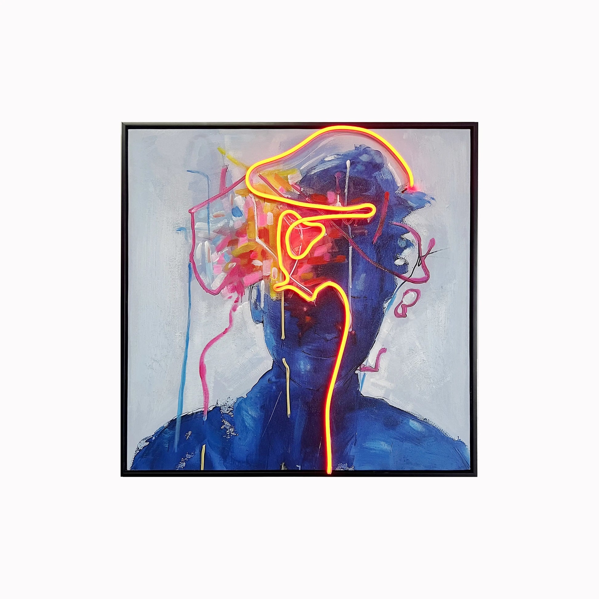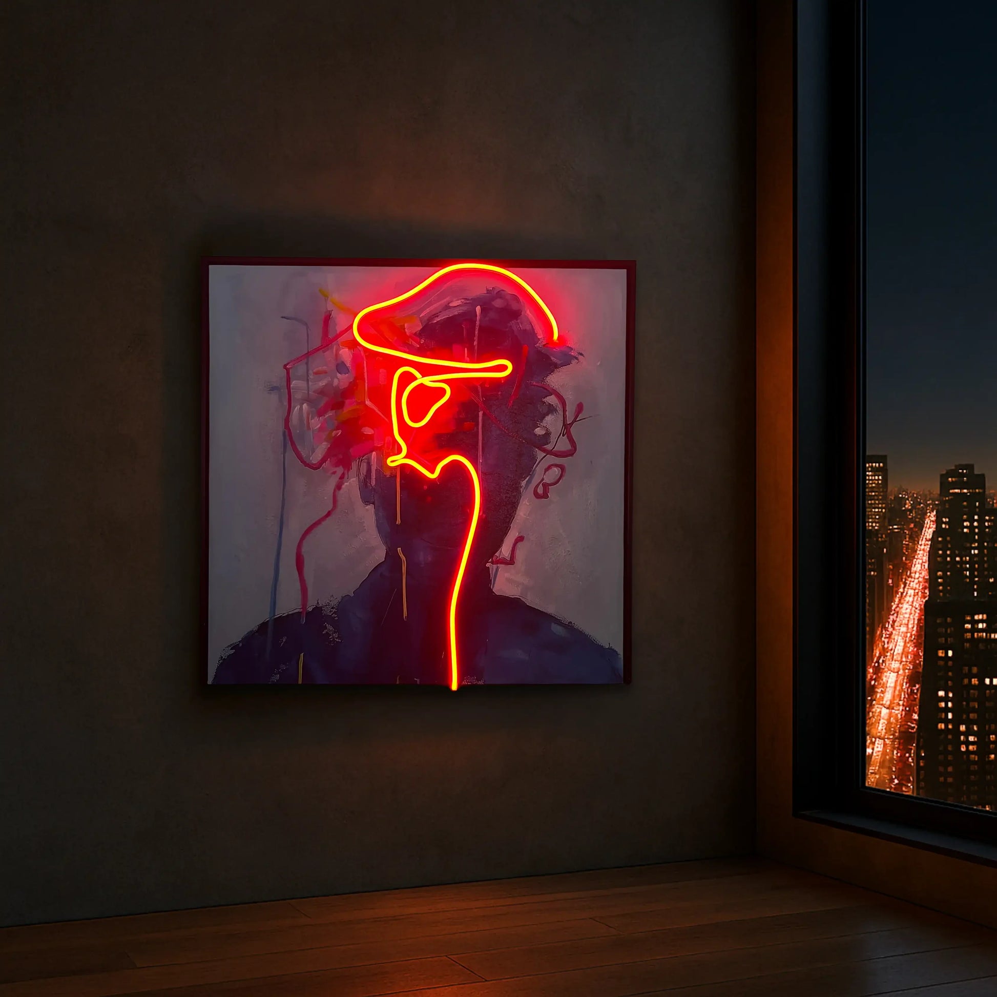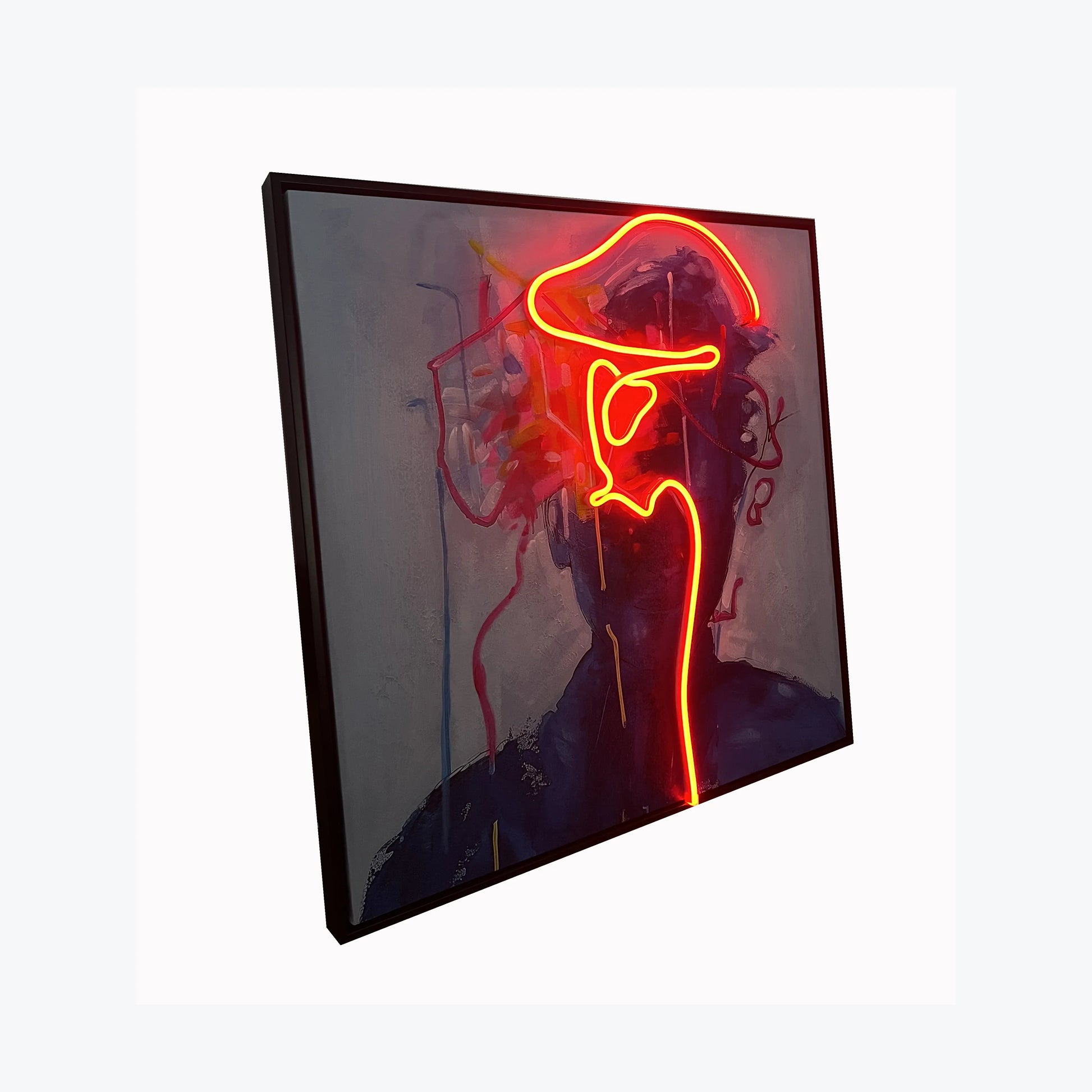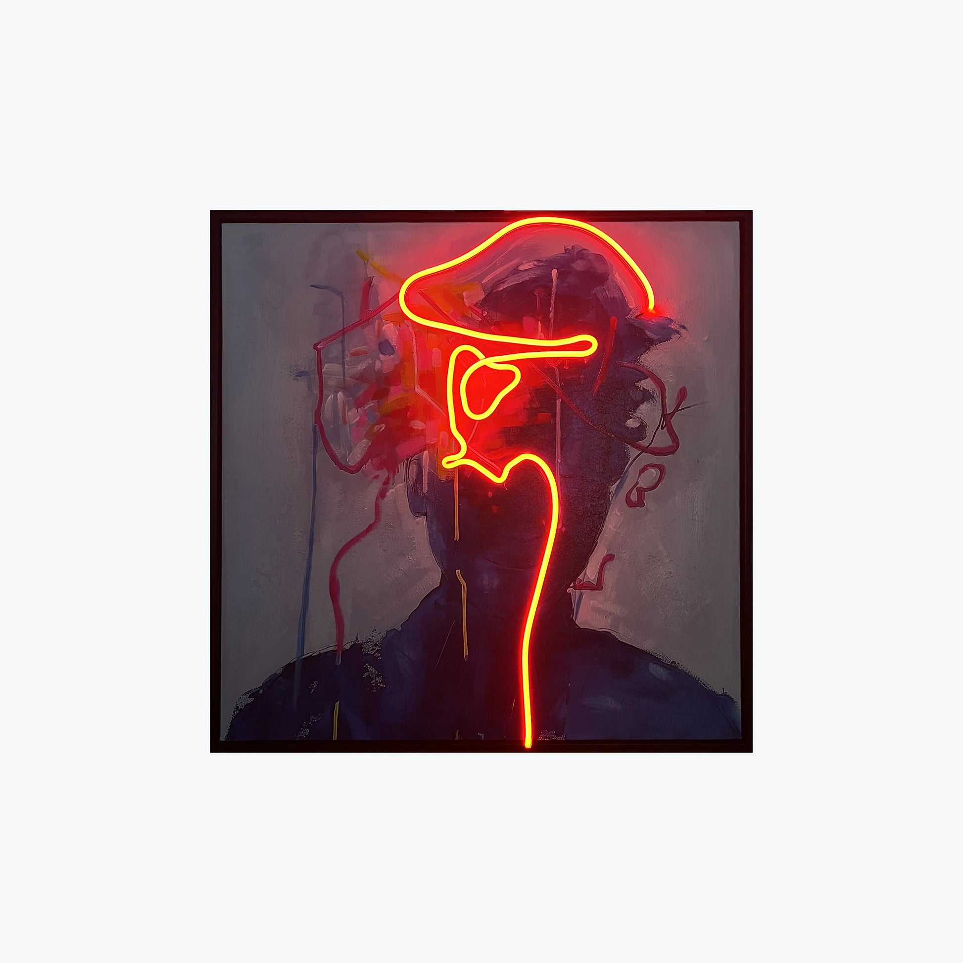 Red Memory is a striking fusion of painting and neon sculpture—a portrait blurred by abstraction and lit by a single, searing red line. The glowing filament traces the outline of a thought, a feeling, a fracture—its path both anatomical and emotional. Layers of paint drip and distort beneath the neon, suggesting fragments of memory surfacing and slipping away. At once intimate and electric, Red Memory captures the quiet violence of remembrance in motion.