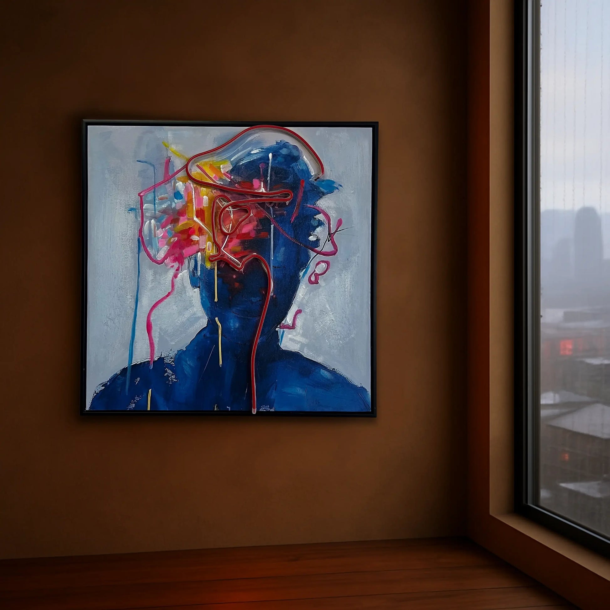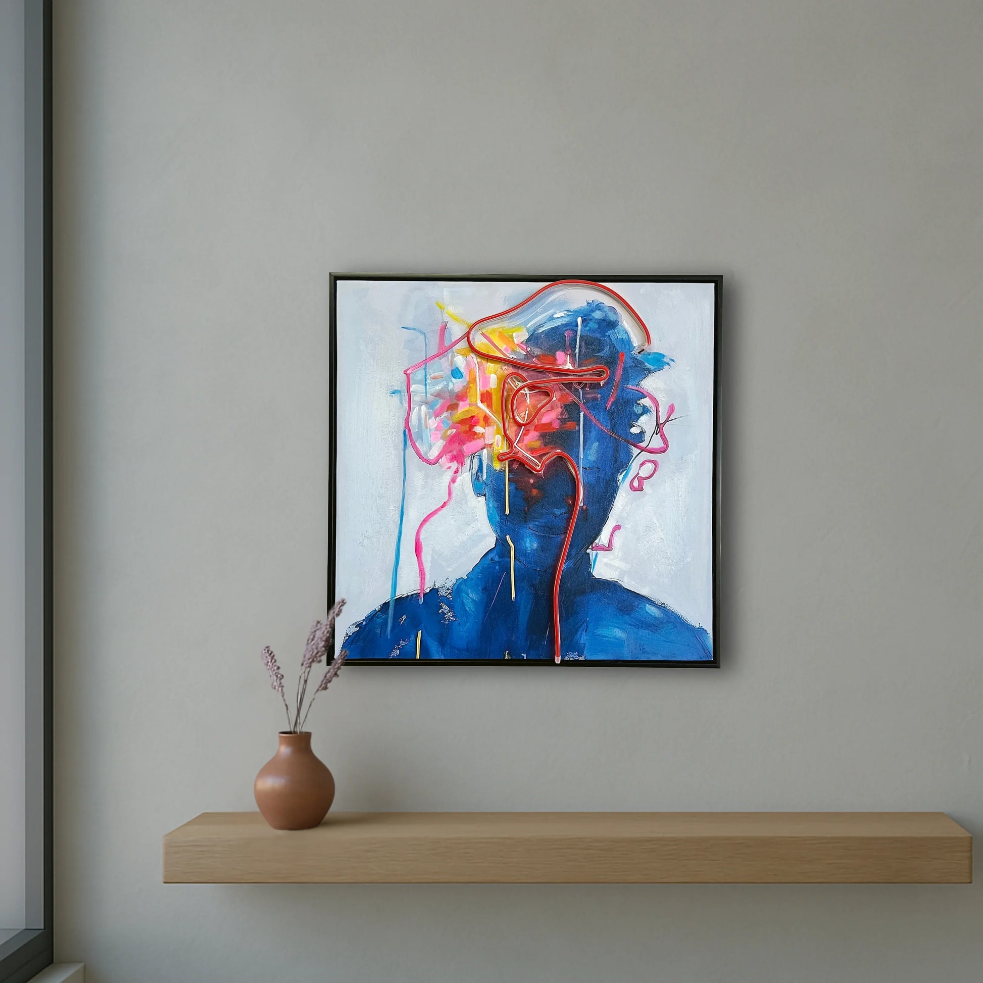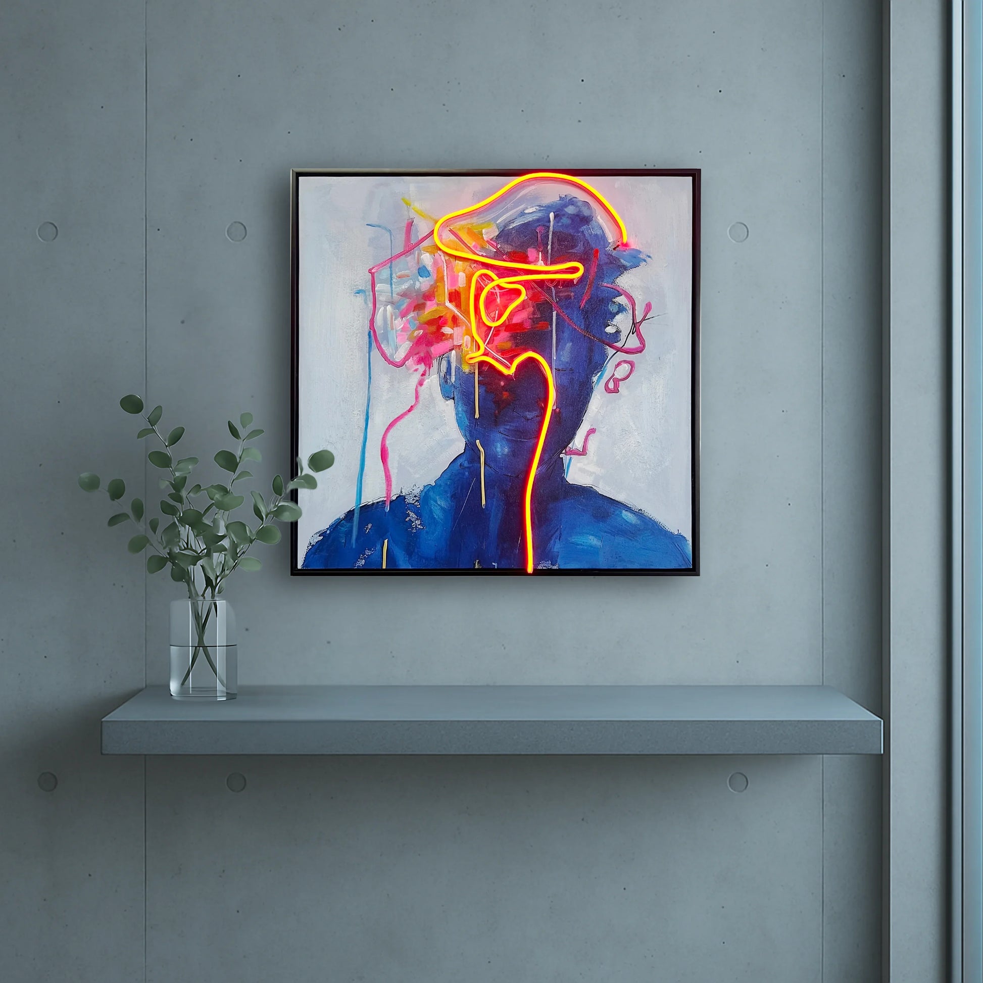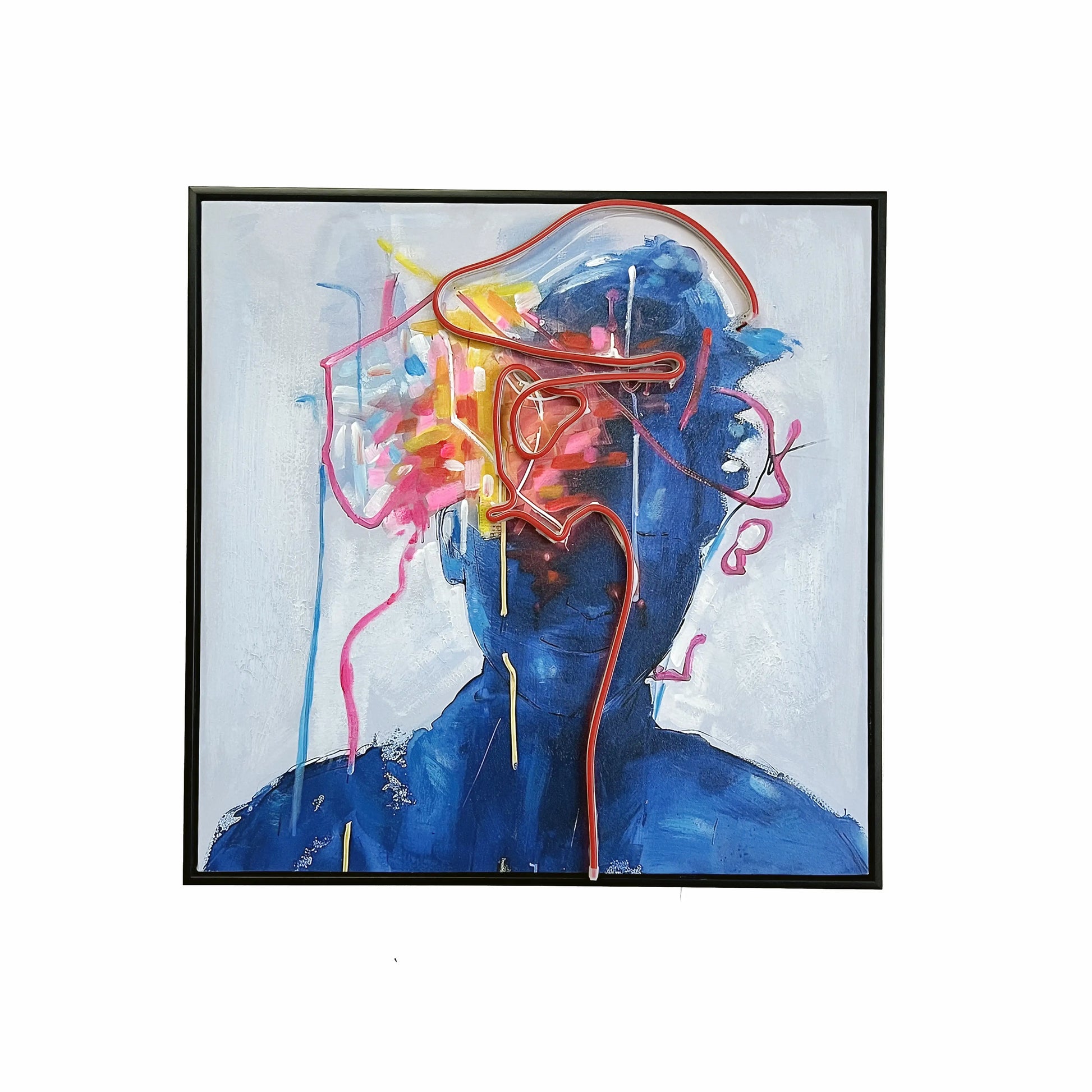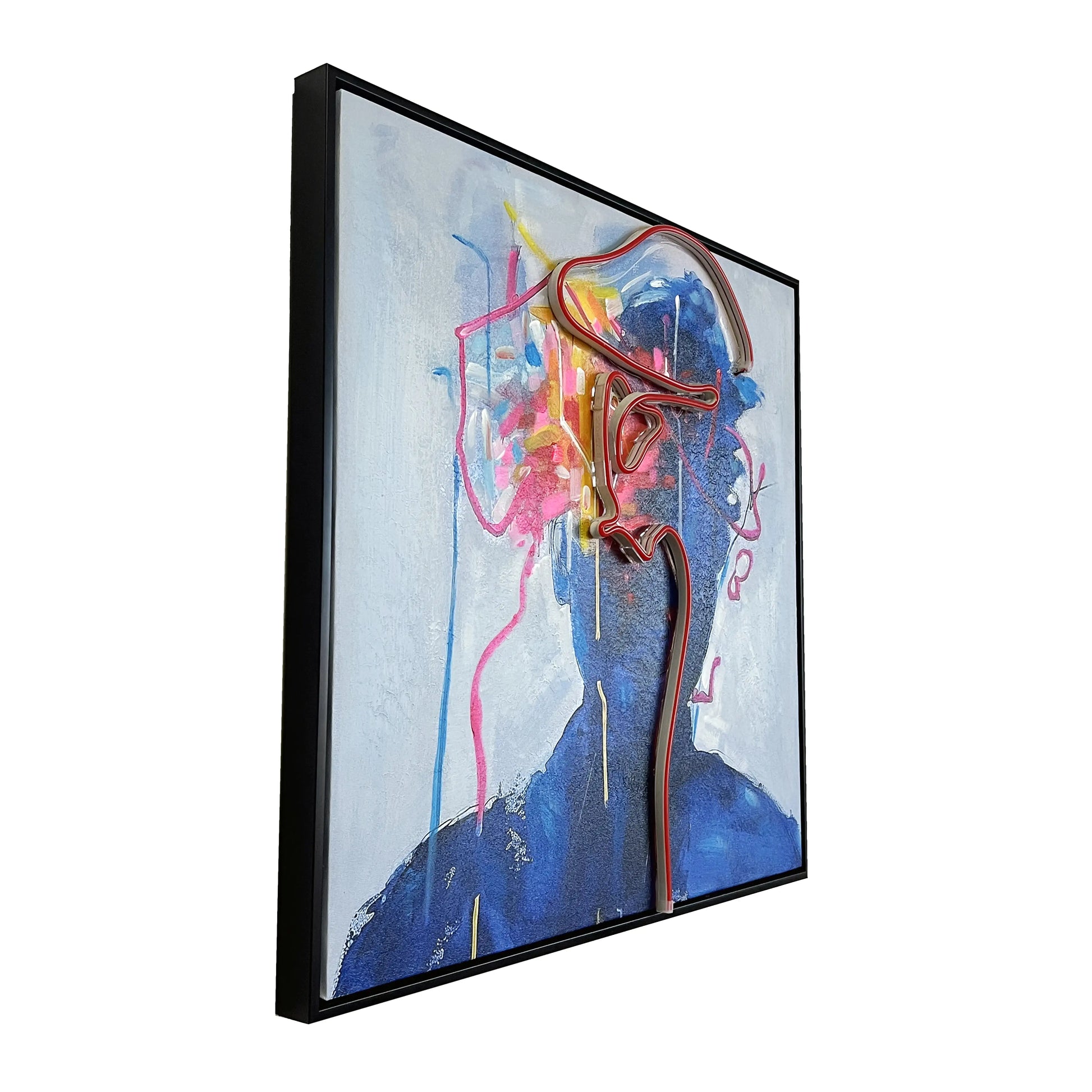 Red Memory is a striking fusion of painting and neon sculpture—a portrait blurred by abstraction and lit by a single, searing red line. The glowing filament traces the outline of a thought, a feeling, a fracture—its path both anatomical and emotional. Layers of paint drip and distort beneath the neon, suggesting fragments of memory surfacing and slipping away. At once intimate and electric, Red Memory captures the quiet violence of remembrance in motion.