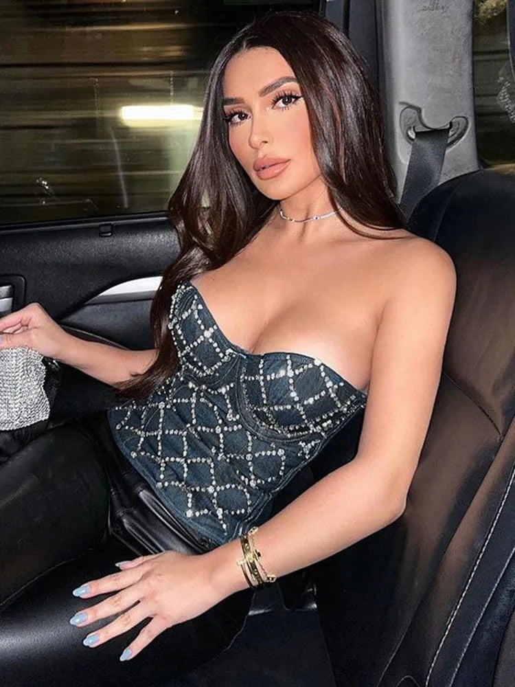 Crafted from premium cotton denim, this body-conforming vest features a stunning rhinestone design that sparkles with every move.