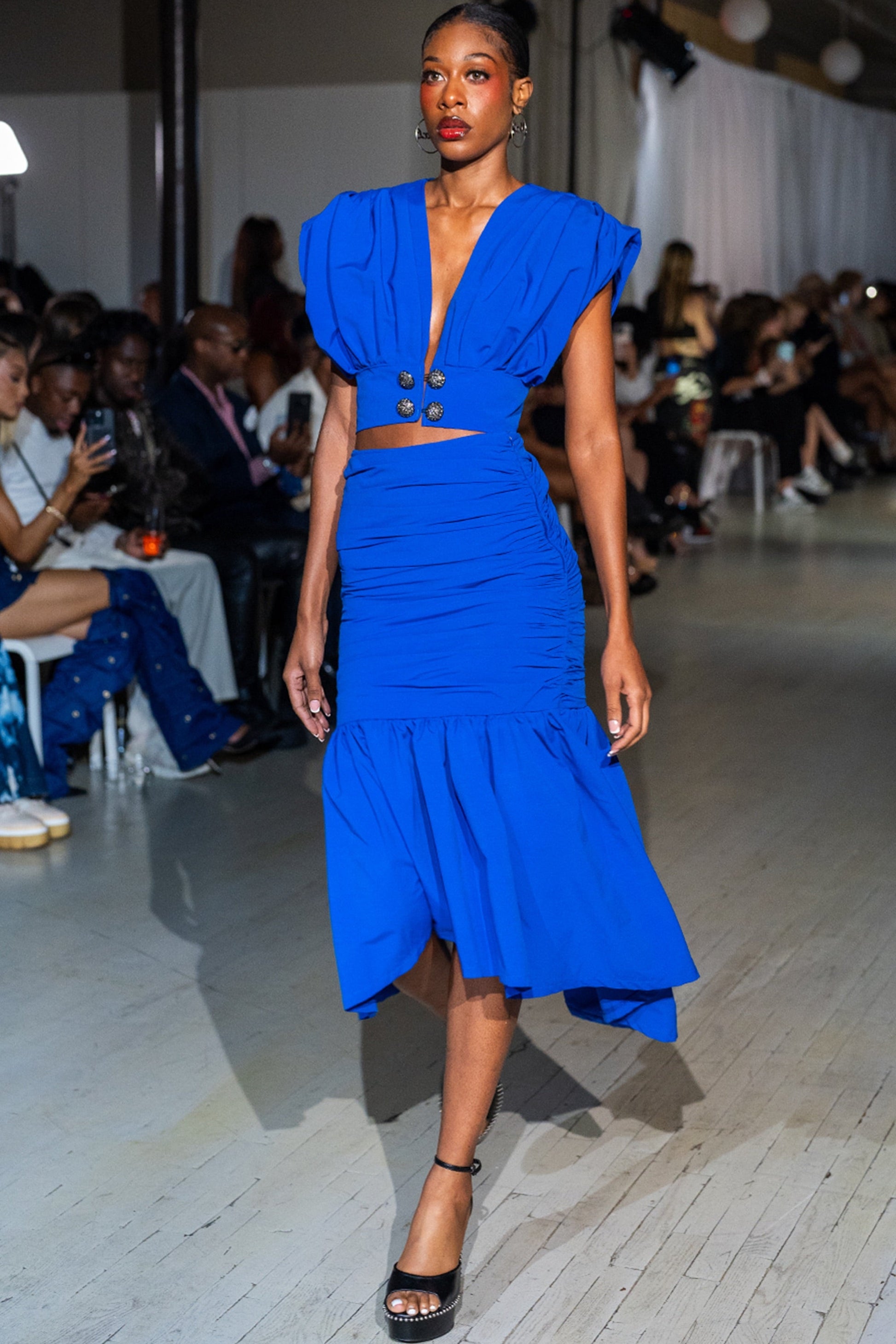 The cropped top features a sharply pleated, sculptural shoulder that extends outward, creating a bold, architectural silhouette, designed with deep pleats along the plunging V-neckline and the cinched waist detailed with ornate oversized crystal buttons.