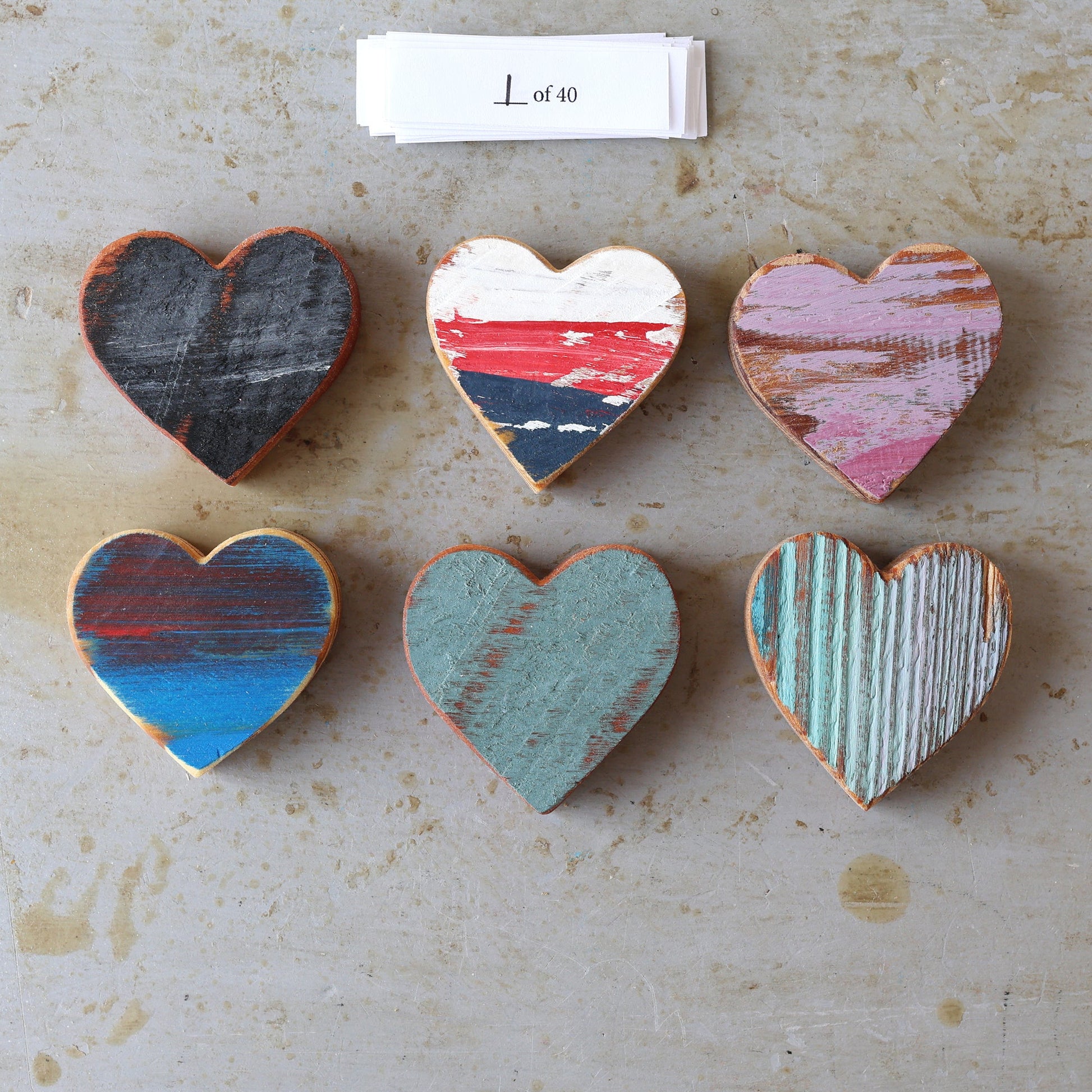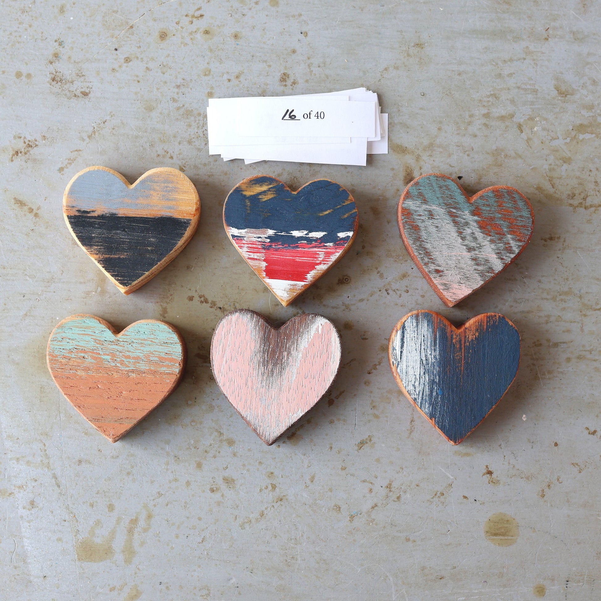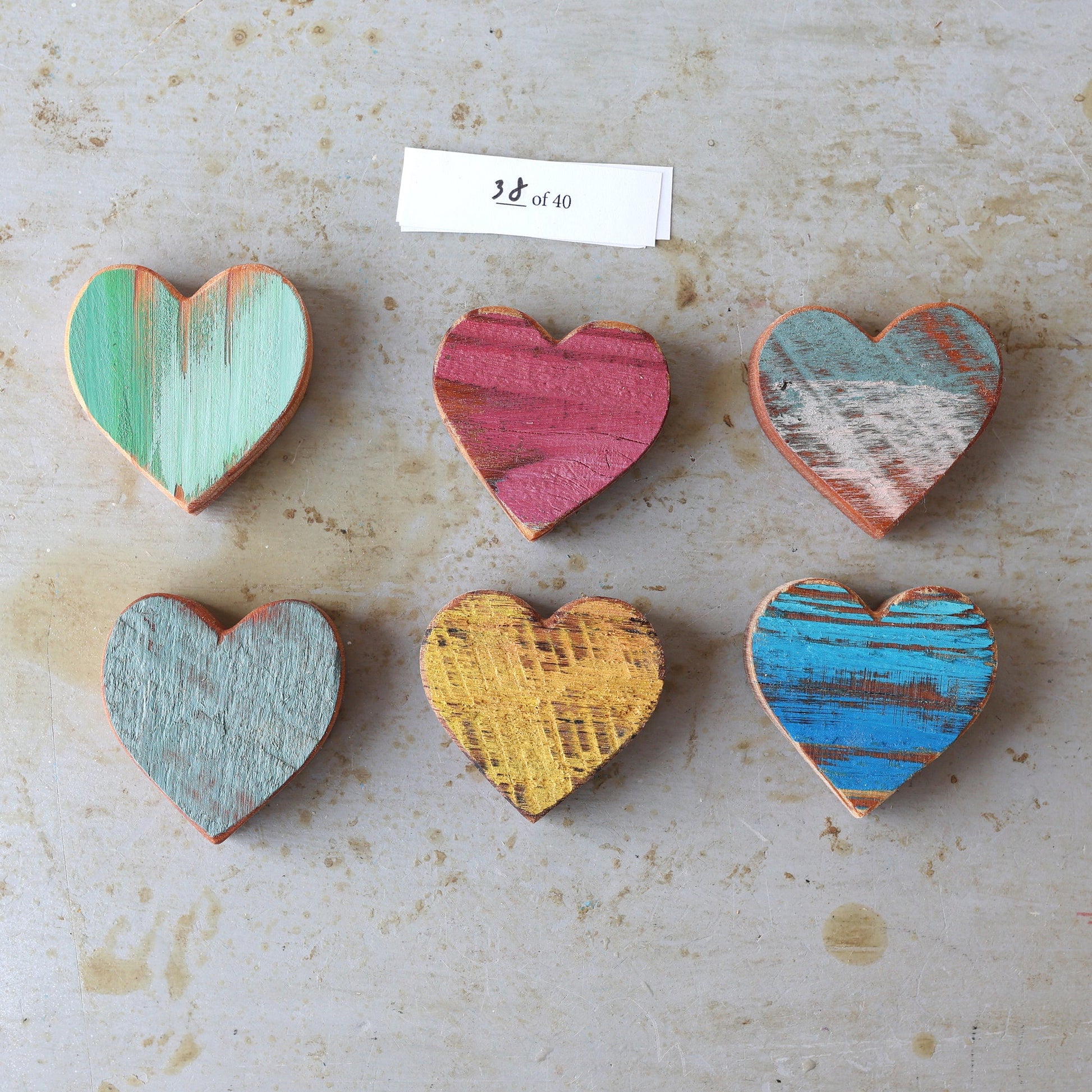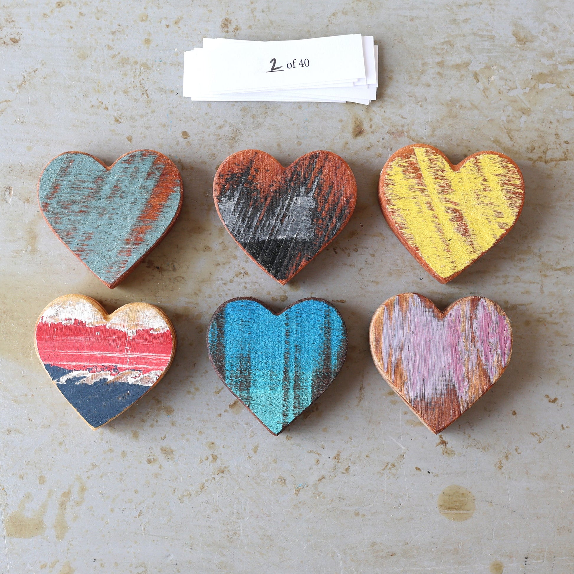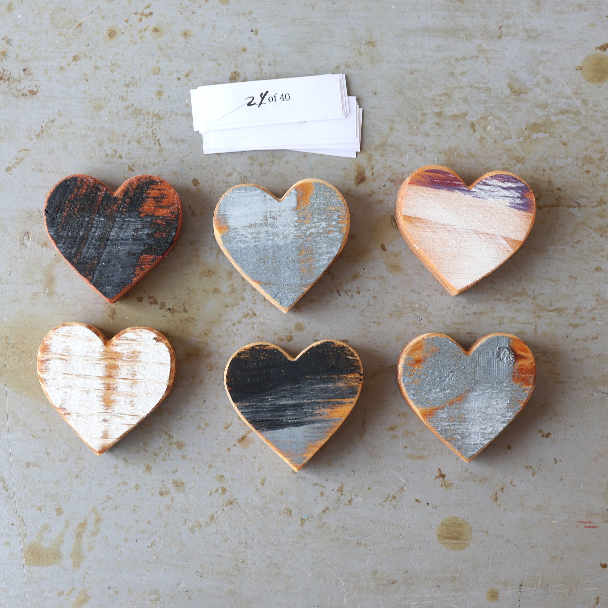 You'll get a half-dozen of these beautifully rugged handpainted wooden hearts. Each set is unique and marked as one of 40 sets of 6 hearts.