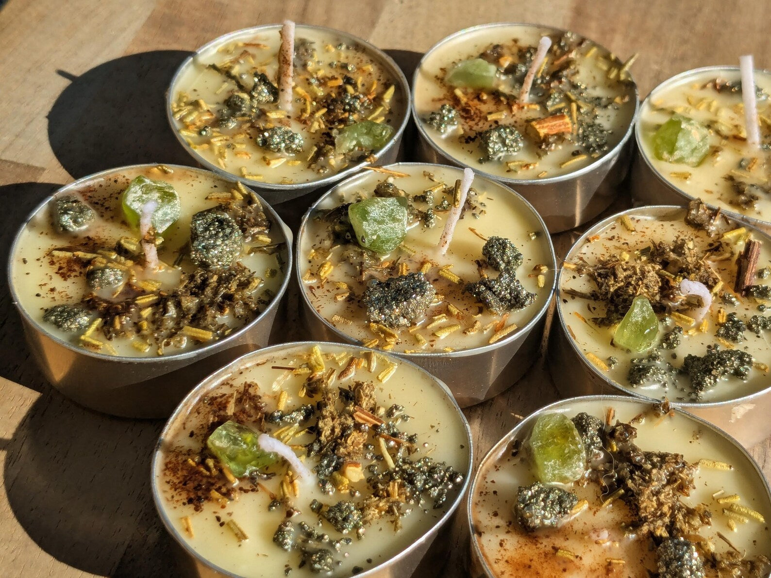 Each candle is dressed with mugwort, rosemary, clove, pyrite, and peridot.