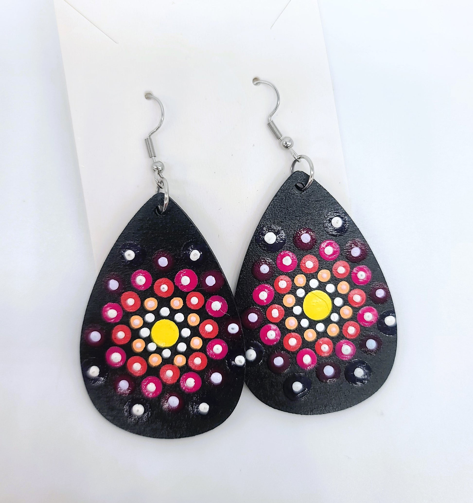 Handpainted Dot Mandala Earrings - Teardrop Shape - Stainless Steel Ear Wire Hooks - Hypoallergenic