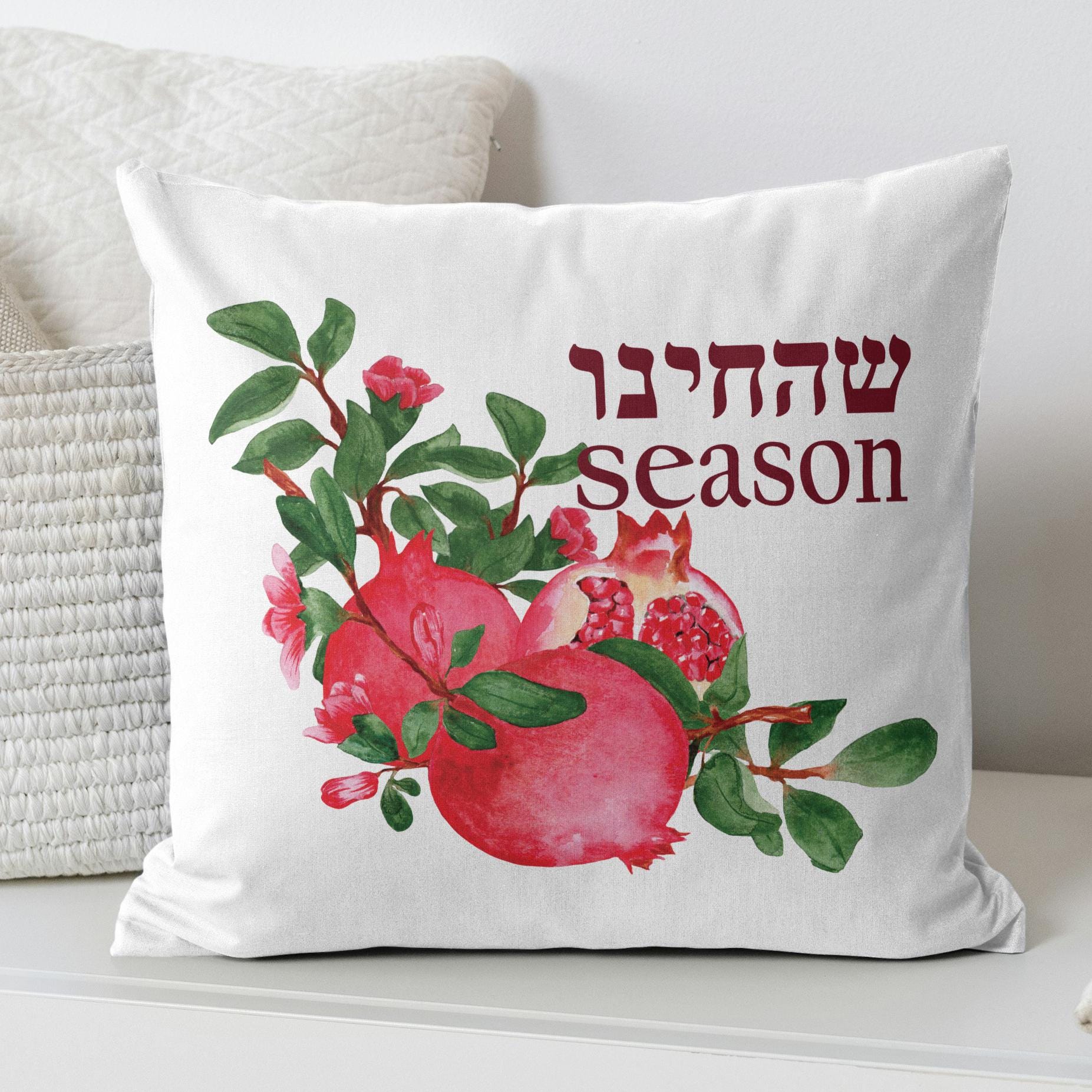 A sweet and meaningful accent for the Jewish new year. This square pillow features hand-drawn pomegranates and the phrase Shehechiyanu Season in a modern Hebrew-English blend. A festive way to mark a fresh start and bring a little beauty to your space — whether you're hosting Rosh Hashanah dinner or just sprucing up your couch for the season.