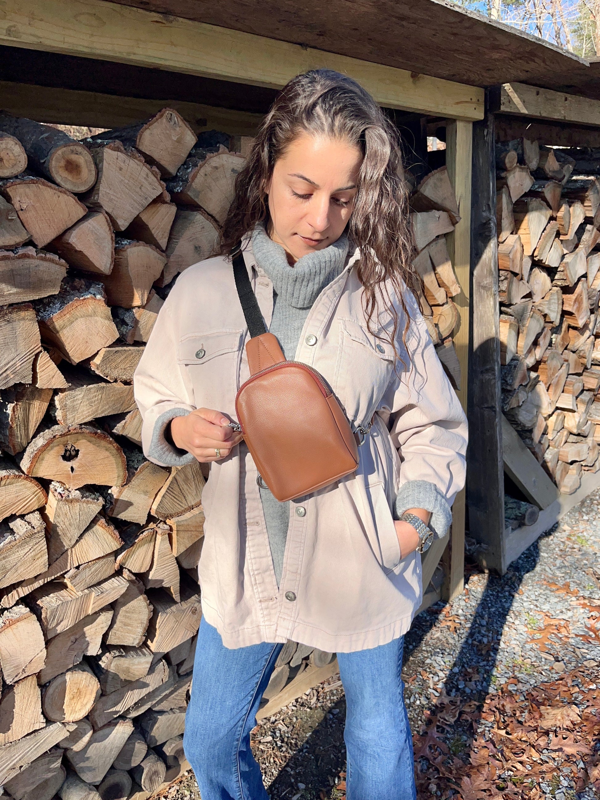 This compact leather Stav sling bag offers both style and functionality with two secure zipper compartments. The main compartment features three credit card slots, a slim pocket for small essentials, and a discreet gun pocket designed to fit a small firearm. An adjustable shoulder strap with a detachable hook allows for ambidextrous use, providing comfort and versatility. Crafted from premium leather, this bag combines durability and sophistication for everyday carry needs.