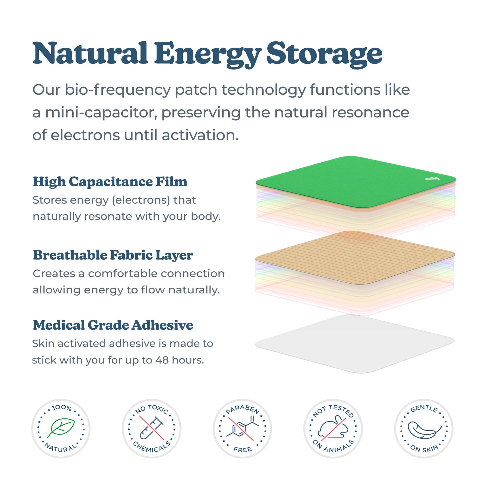 Our bio-frequency patch technology functions like a mini-capacitor, preserving the natural resonance of electrons until activation.