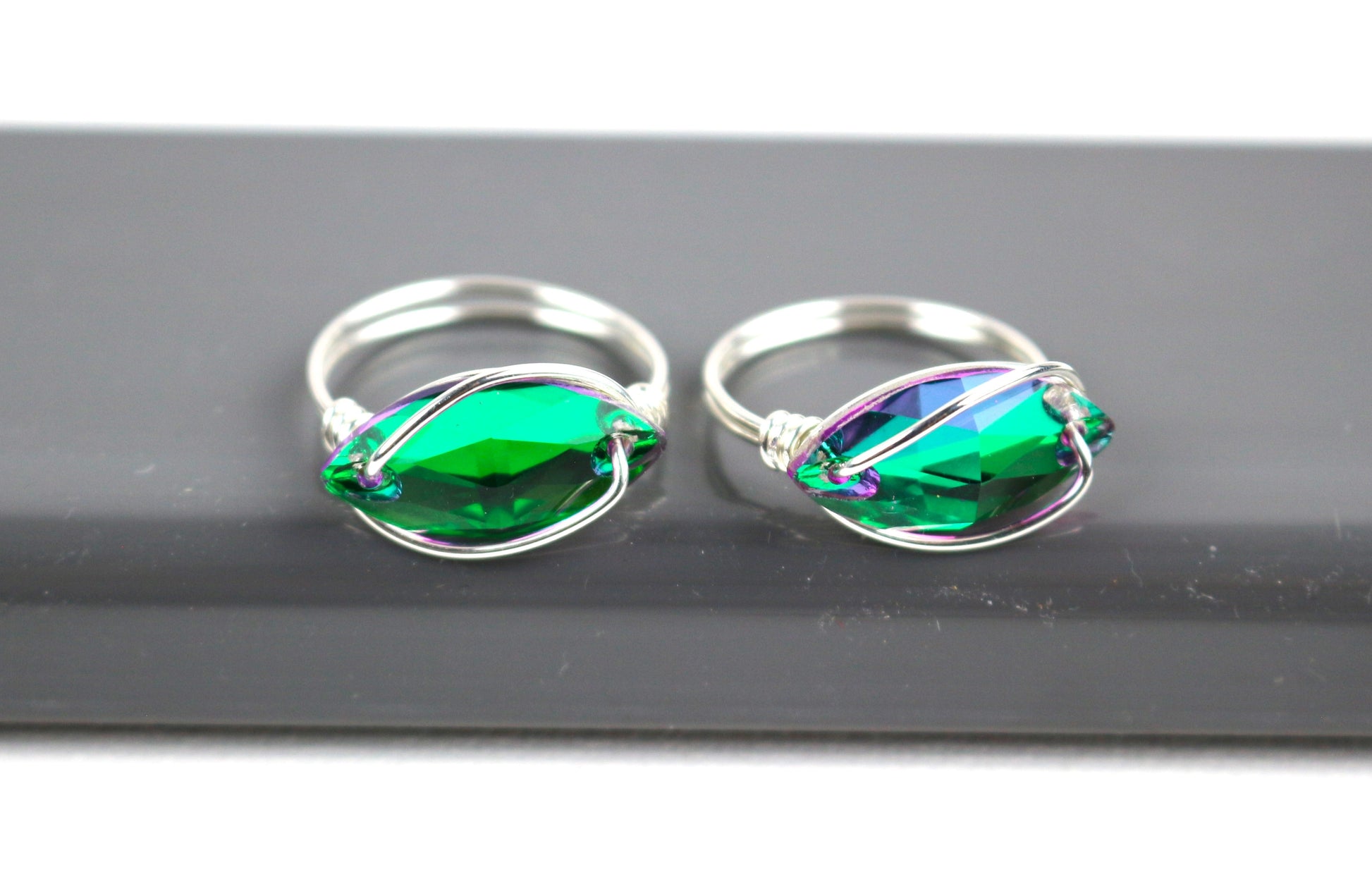 This is a 17mm crystal navette shape component. The color is Vitrail Medium with foil bottom and faceted. The band is Sterling Silver wire.