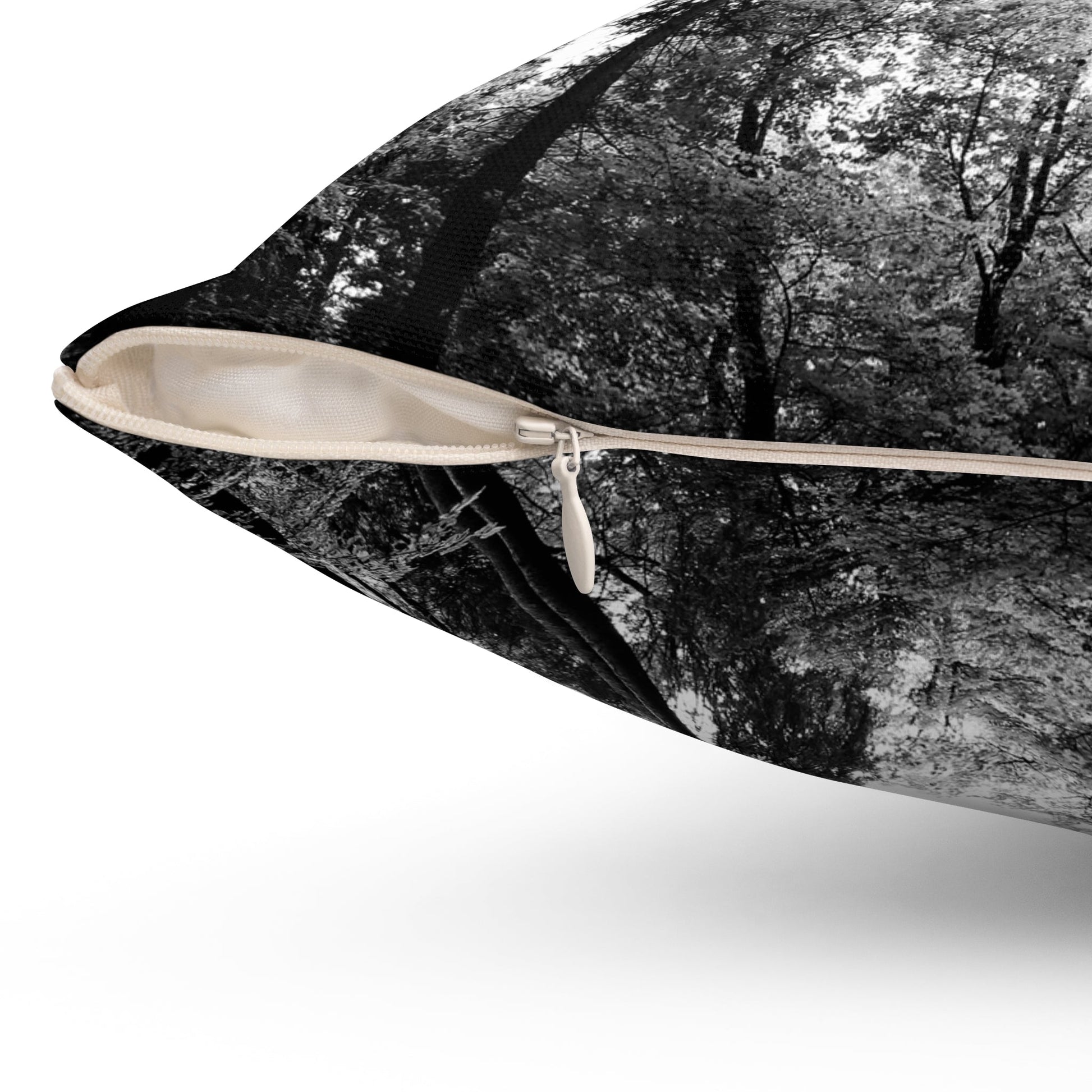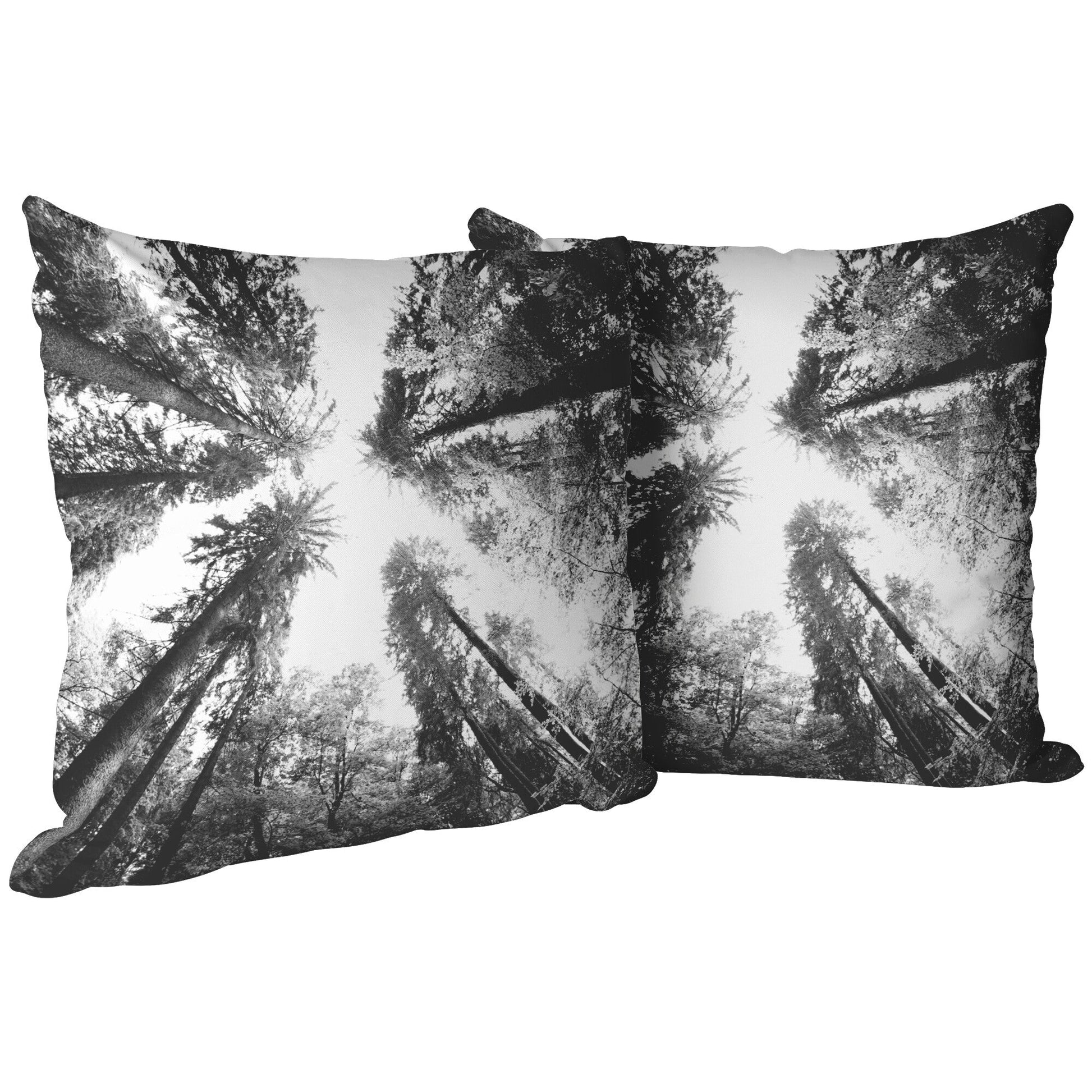 Enjoy the tranquil beauty of our “Tall Trees” Throw Pillow. Featuring a striking black and white photograph of tall pine trees, this pillow captures the serene interplay of light and shadow, reminiscent of a peaceful forest walk.