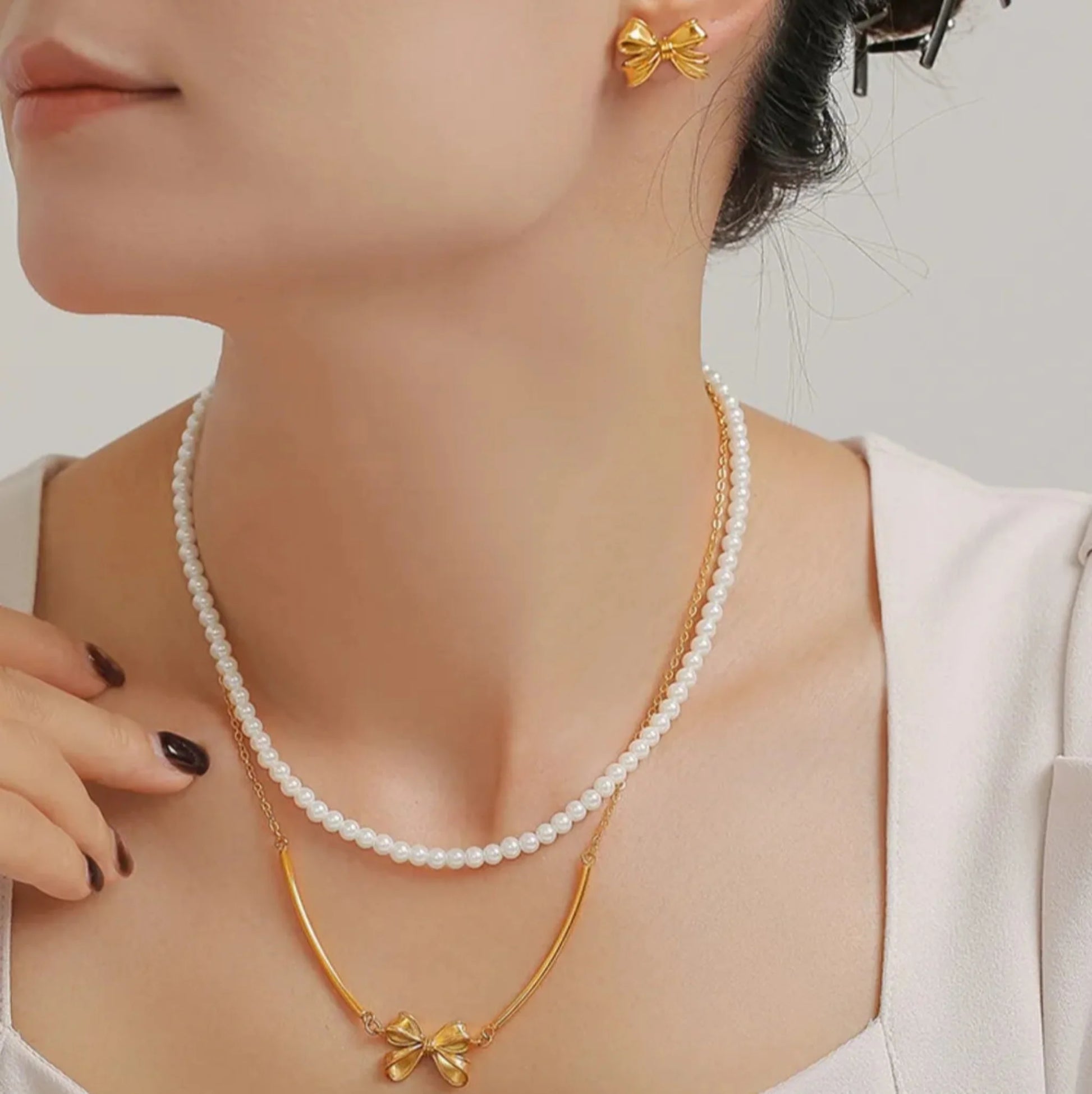 Whether layered or styled solo, each piece offers a different side of your sparkle. The synthetic pearl evokes timeless charm, while the bow adds a playful accent and the earrings bring polished versatility.