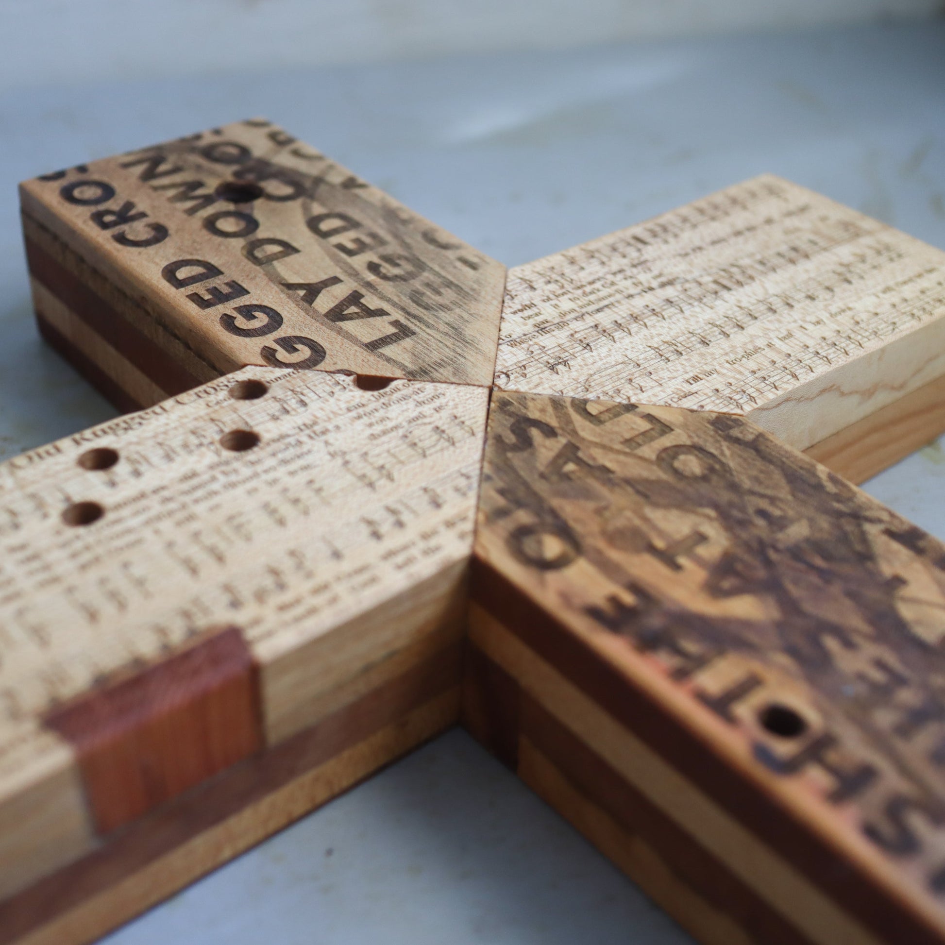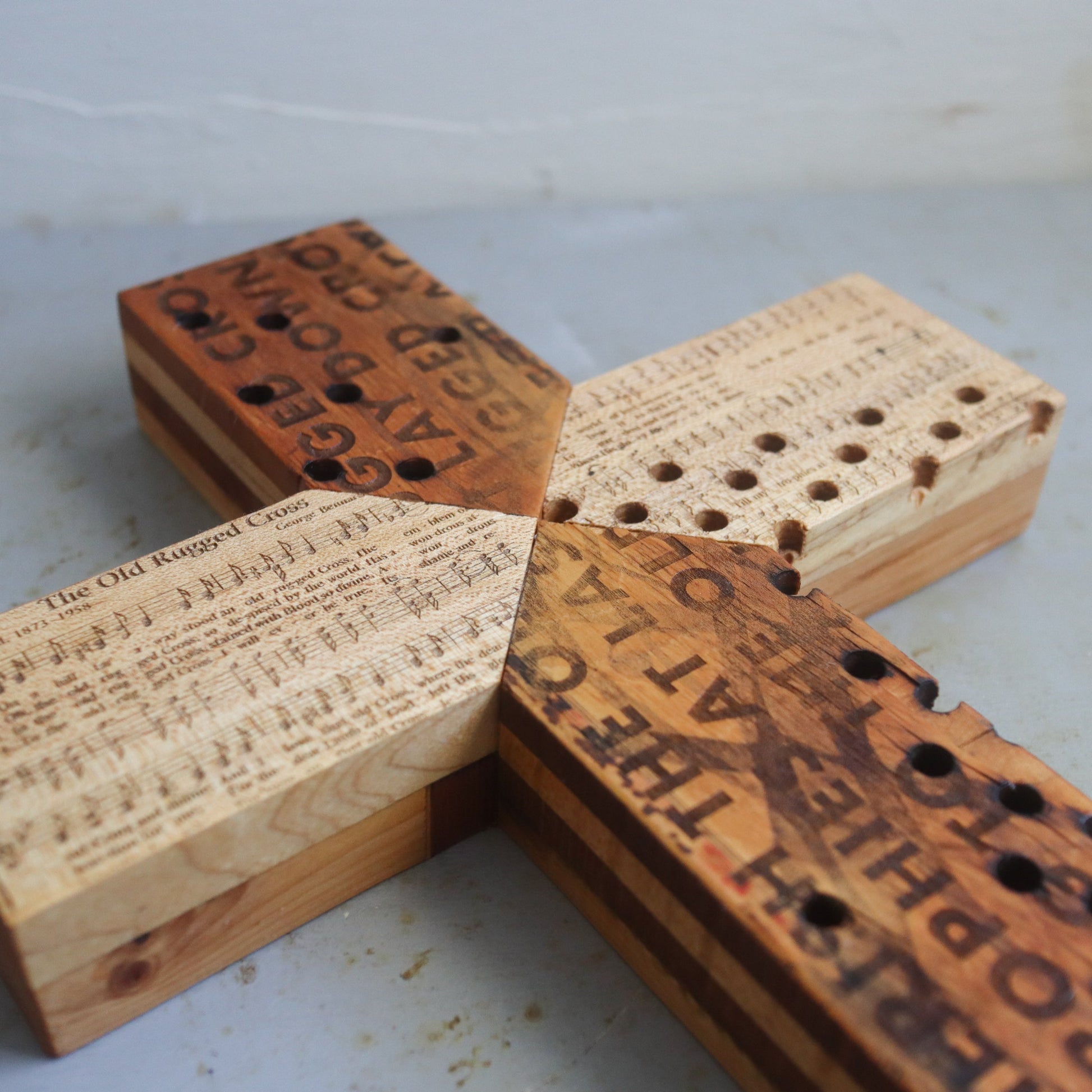 These crosses are indeed old and rugged—reclaimed from century-old piano headers—the wood is darkened with age and bears many holes and scars from years as a piano. We're giving these old wooden parts new life by turning them into crosses—the Christian symbol for rebirth, redemption, and life made new!