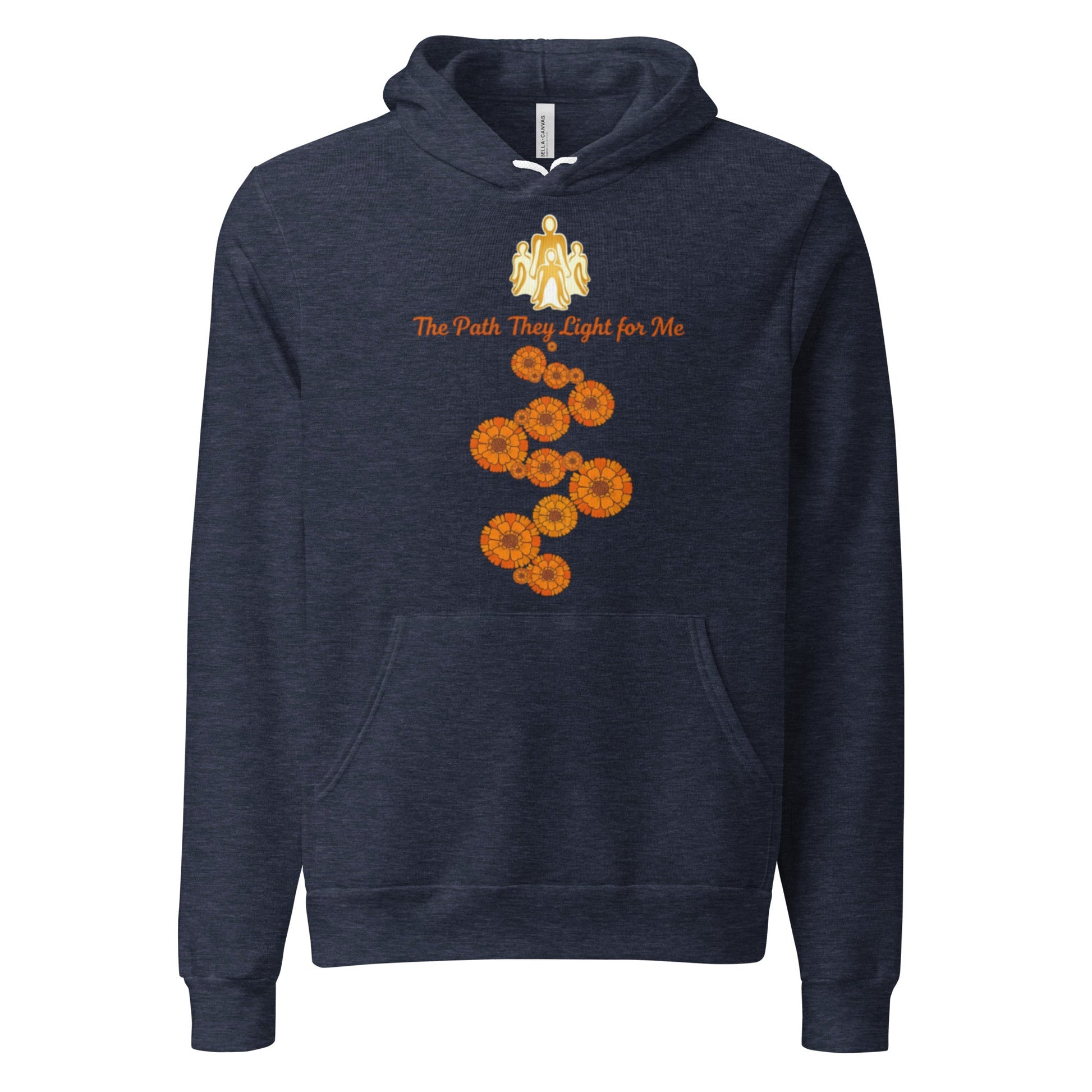 This design beautifully merges these two traditions, featuring glowing ancestor silhouettes at the top—representing the spirits watching over us—and a winding path of vibrant orange marigolds below, symbolizing the way they light for us. The phrase “The Path They Light for Me” is a personal declaration of gratitude and recognition: I am not walking alone. My ancestors are with me, showing me the way.