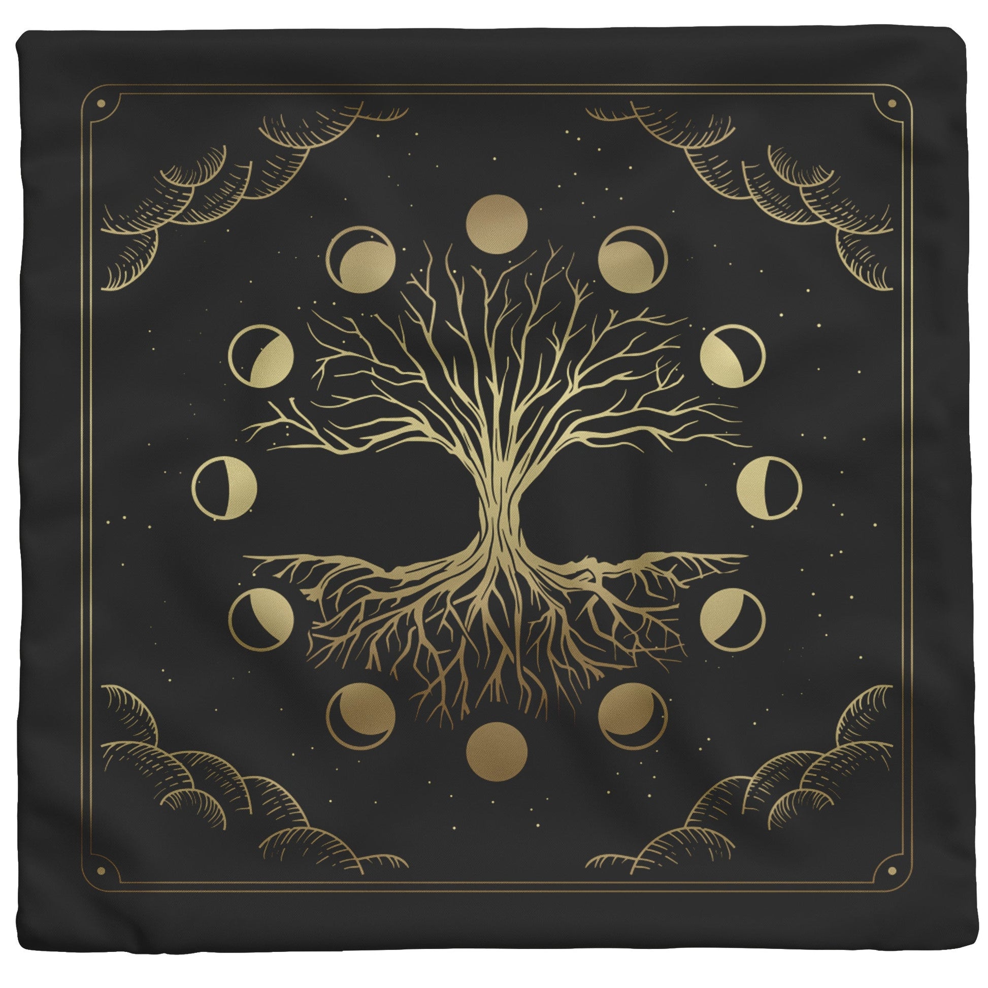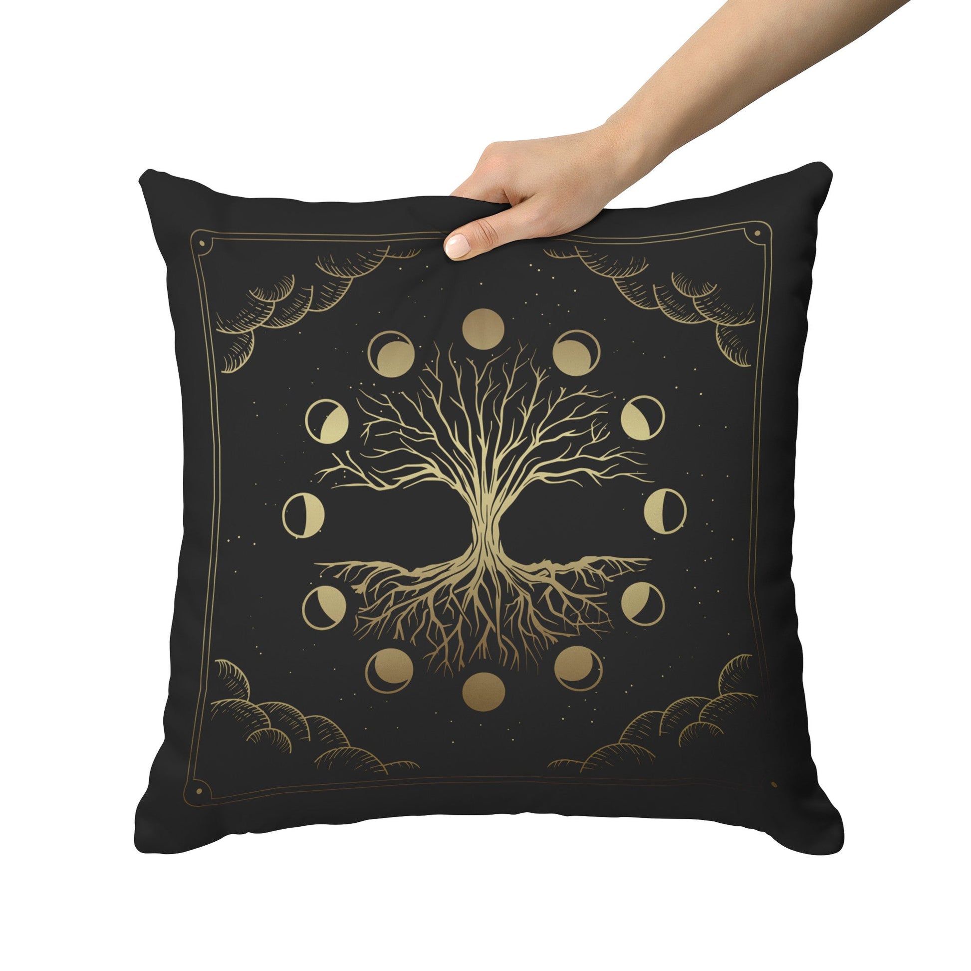 Immerse yourself in ancient symbolism with our “Tree of Life” Throw Pillow. Featuring a radiant gold illustration of the Tree of Life encircled by moon phases on a rich black background, this pillow blends the cosmic and the earthly. Perfect for witchy and dark boho decor, it adds sophistication and depth to any space, inviting contemplation and conversation. Add it to your home and let it be a daily reminder of the universe’s beauty and complexity.