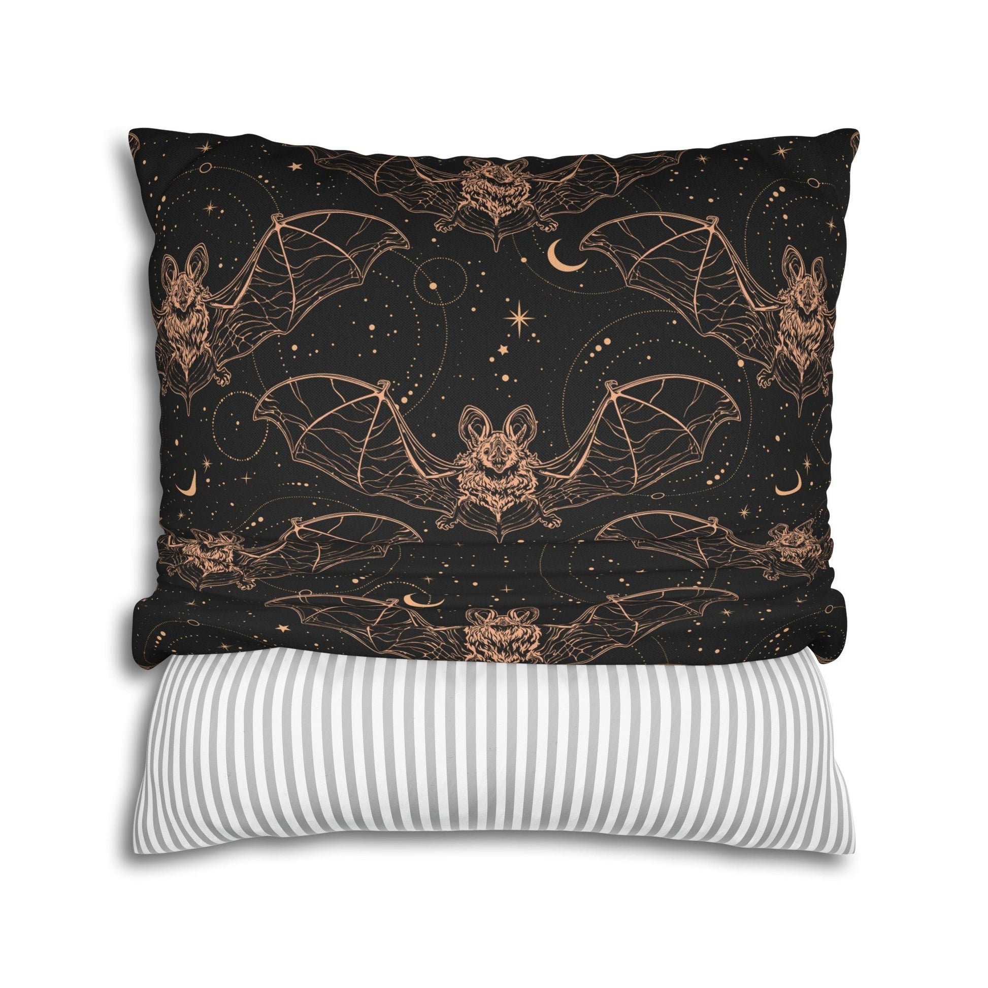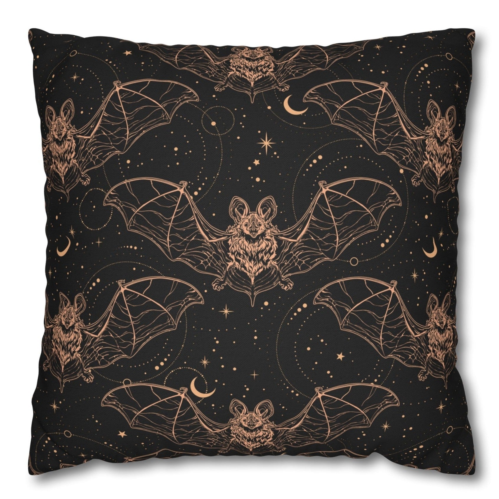 Add a touch of nocturnal charm to your home with our Vampire Bats Throw Pillow. Featuring a captivating pattern of flying bats set against a black night sky adorned with moons and stars, this pillow captures the mysterious allure of the night. Ideal for those who appreciate the dark elegance of vampire bats and the beauty of the night sky, it brings a sense of mystery and sophistication to your living space.