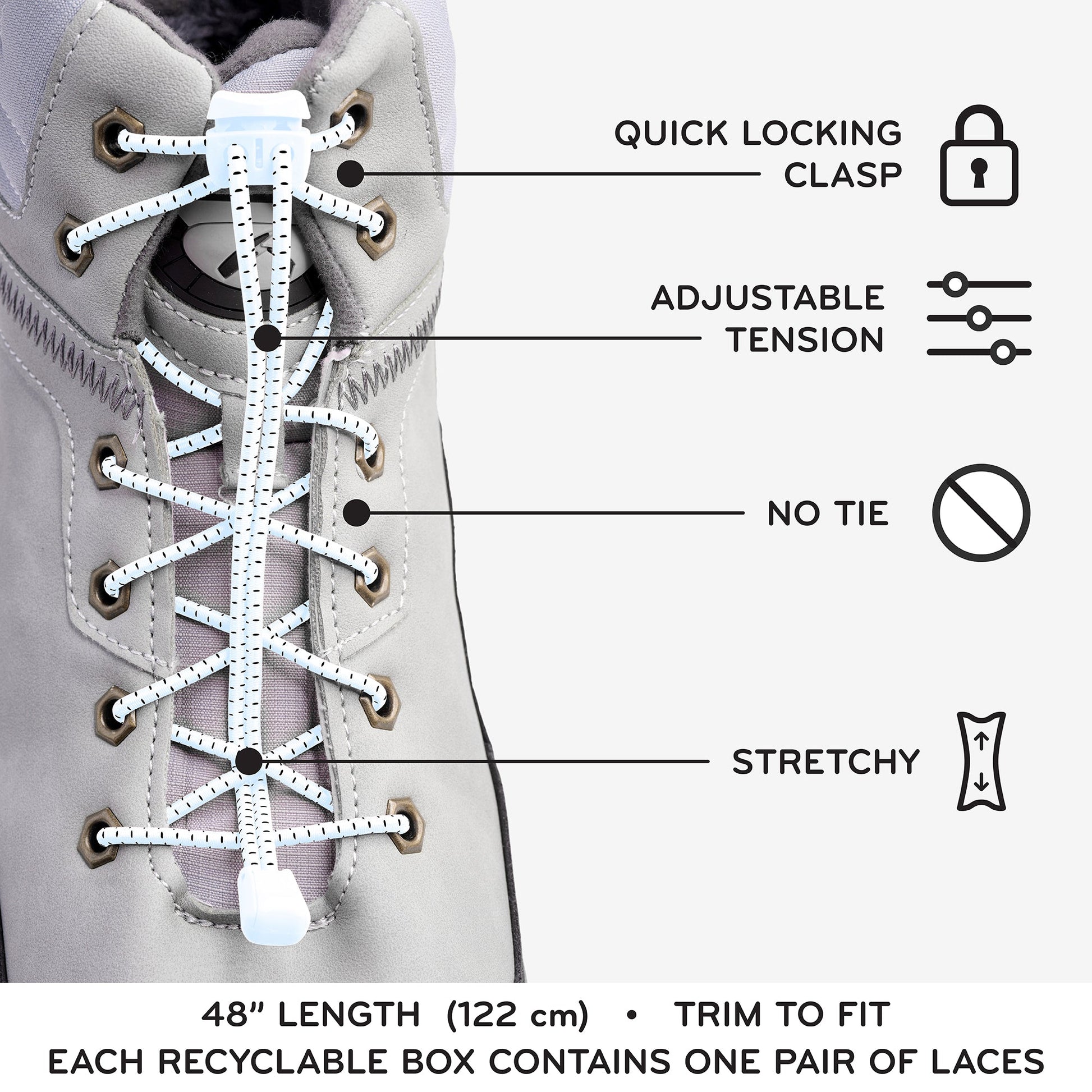 Our easy-to-use Quick Lock No Tie Shoelaces allow you to put your best foot forward without fussing with tight knots and worn-out laces.