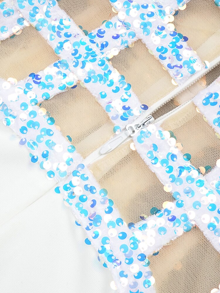 The tube top neckline and off-the-shoulder design come together with the sparkle of sequins to create a slim-fit silhouette that spectacularly enhances the figure. The floor-length "mopping" skirt flows gracefully to the ground, adding a touch of drama and sophistication. This dress is the perfect garment for galas, weddings, or any formal event where fashion is the protagonist.