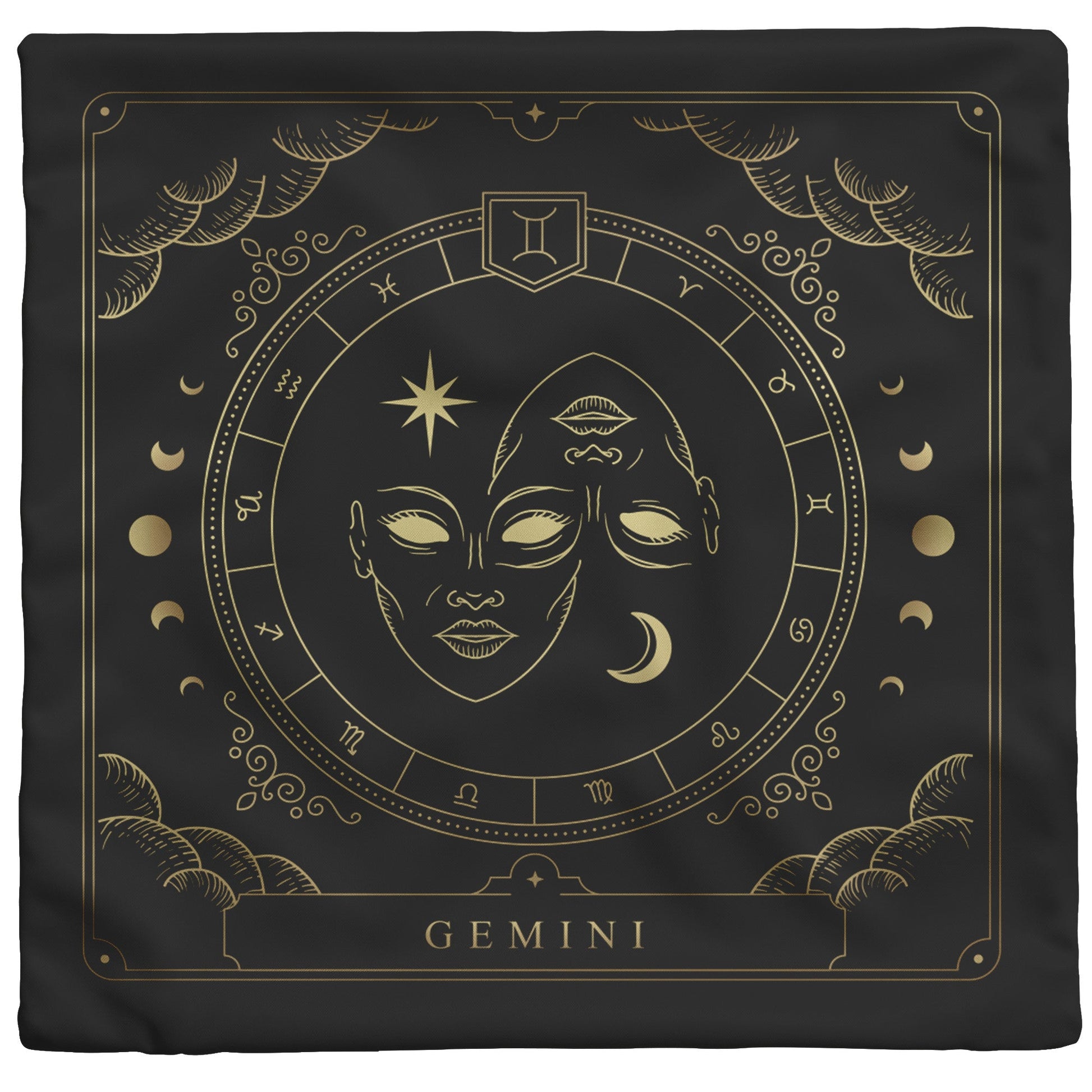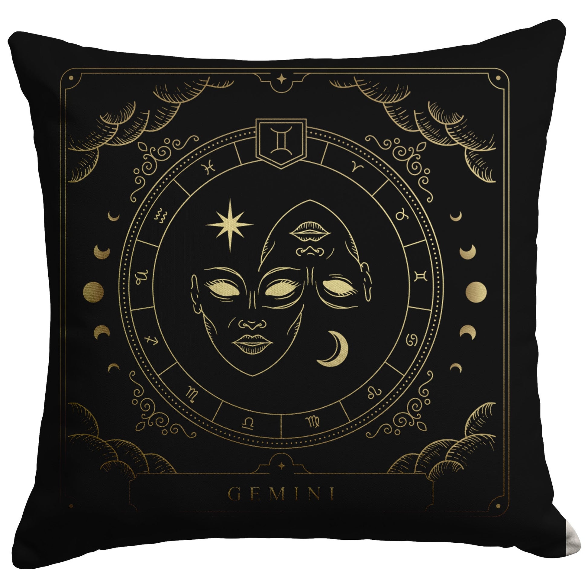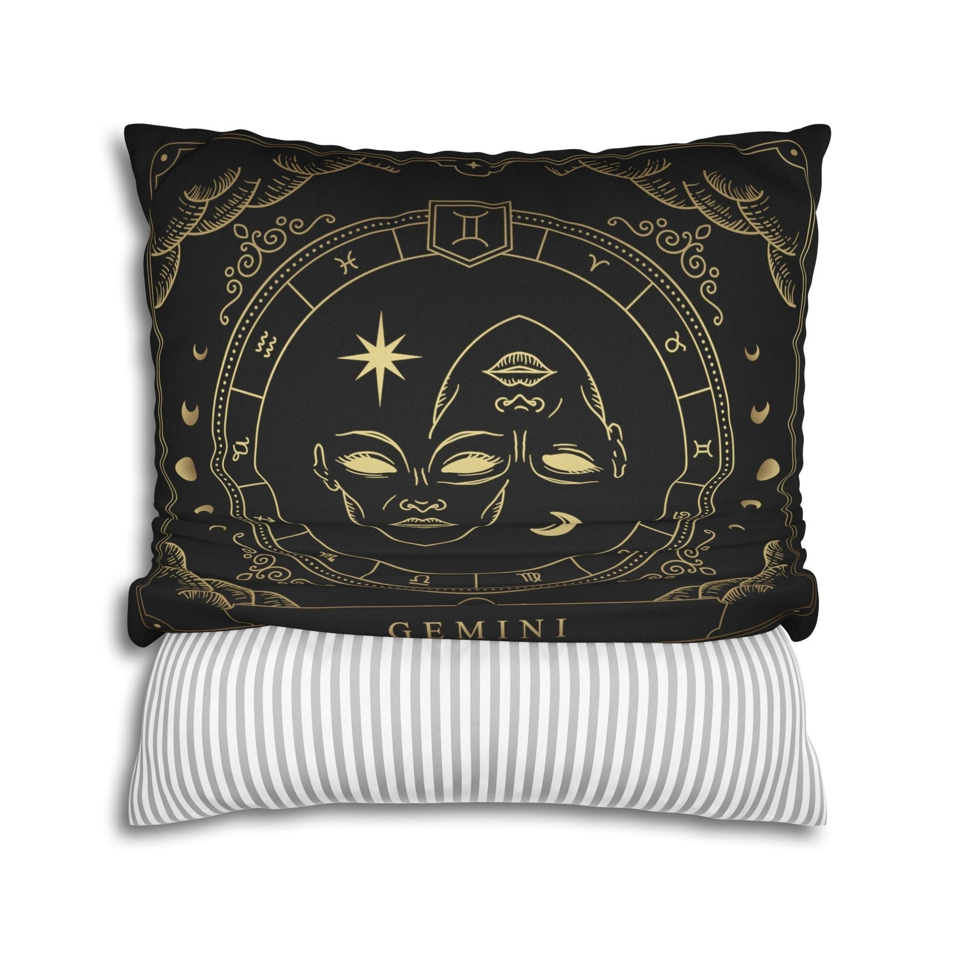 Brighten up your space with this fun and cozy throw pillow. This pillow features the zodiac symbol of Gemini, the twins, in a tarot-inspired design in gold artwork on a black background.